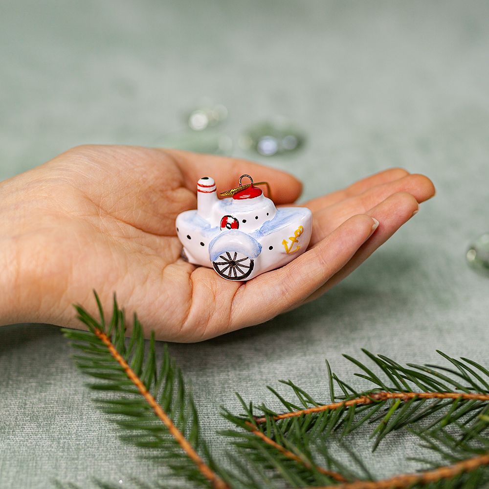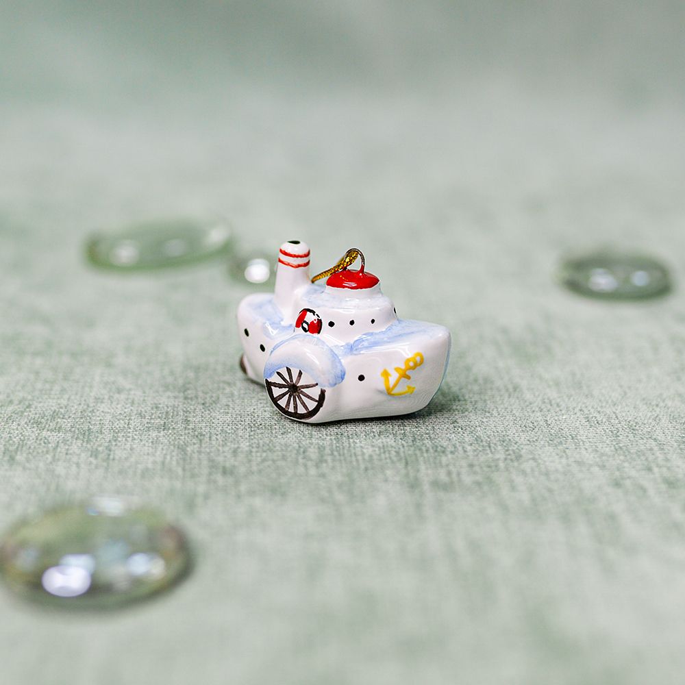 Елочный подвес “”Пароход””, изготовлен в технике майолика, украшен ручной художественной росписью и входит в набор елочных украшений “”Ретроштучки””. Говорят что пароходики зимуют в теплых странах и уютных бухтах. Почти все это время они спят и видят сны о прекрасном лете, когда можно бороздить просторы рек и океанов по всему миру. Пароход станет прекрасным украшением для елки, подарком на Новый год и другие праздники, принесет радость как коллекционерам, так и тем, кто ценит уникальные изделия ручной работы.”