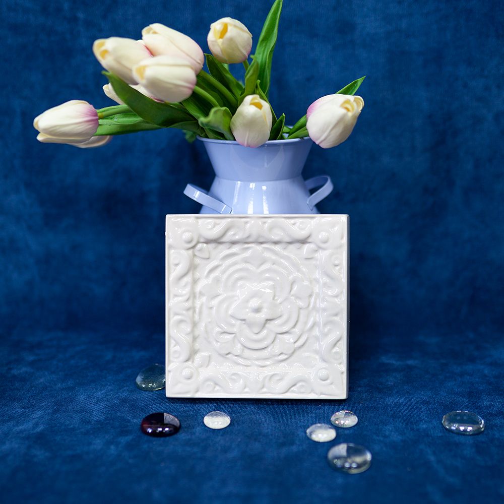 Изделие представляет керамический рельефный элемент квадратной формы, покрытый белой глазурью, на котором нанесено стилизованное изображение чертополоха. Другие названия этого растения артишок, расторопша. Чем славен чертополох? Его изображение украшает королевский герб Шотландии, это деликатес и “Овощ всех влюблённых”, он стоит на страже здоровья. Легендарное растение отличает спартанская красота, но чувственные сиреневые цветы, защищённые кольчугой острых зелёных шипов, могут стать неповторимым украшением клумбы. На Руси отношение к чертополоху всегда было почтительным и мистическим. Это уже видно по названию растения: оно складывается из общеславянских корней “черт” и “полох” (пугать). Магическое значение чертополоха в том, что это сильный оберег, защищающий от опасностей, плохих знакомств, дурного влияния и нечистой силы. Цвет, выбранный для изразца, придает дополнительную смысловую нагрузку изделию, поскольку белый цвет напрямую имеет отношение к духовности и символизирует доброе начало. Данное изделие может быть использовано как изразец, и как самостоятельный настенный декор. При этом смотрится стильно и эффектно, может использоваться в местах, где фантазия архитектора или дизайнера по интерьеру не ограничивается типовым решением, он позволяет сделать акцент, привлекающий взгляд, внести завораживающую изюминку в интерьер. Изразец также будет прекрасным подарком родным, близким, коллегам по работе.