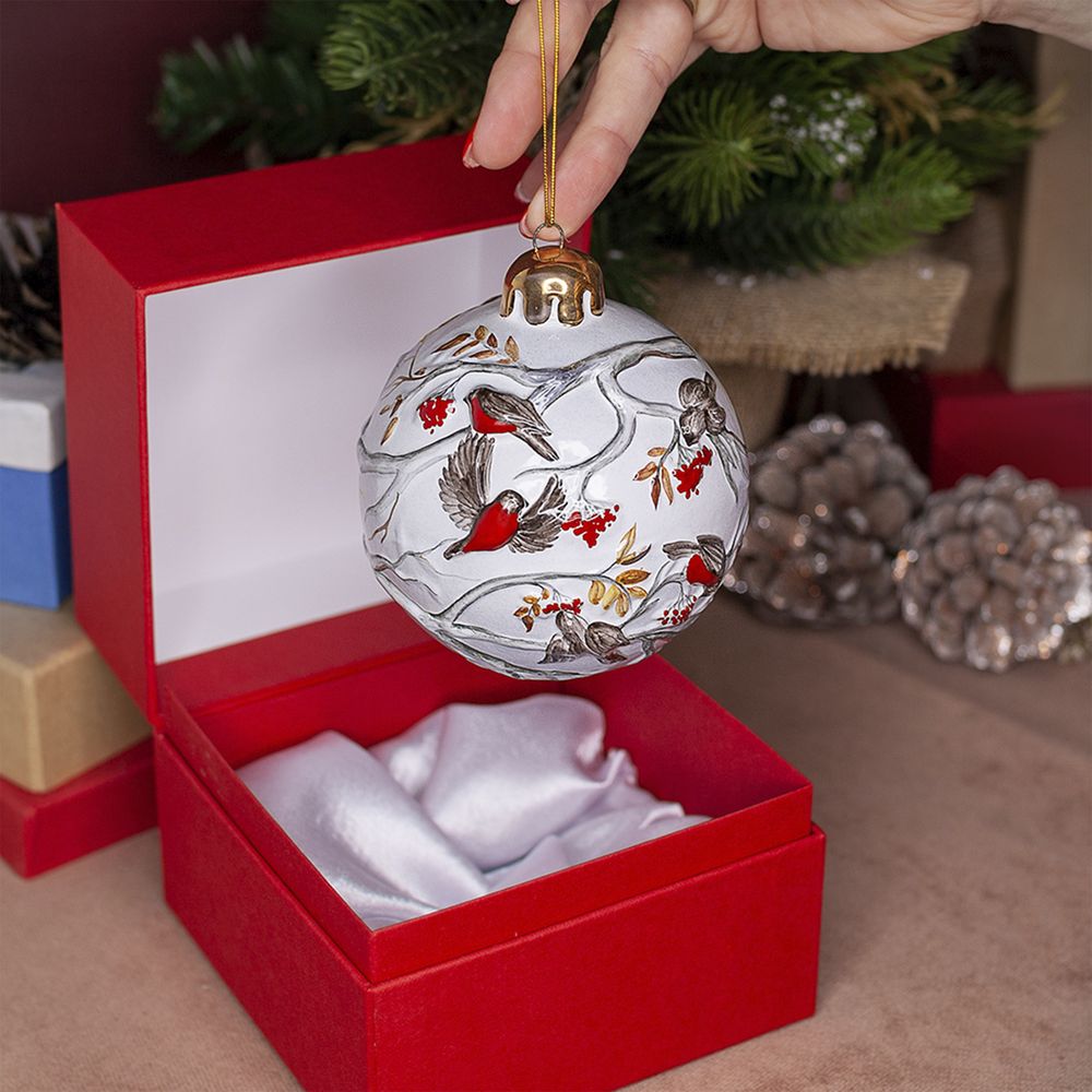 Наконец, какая же елка без шаров? Вы только взгляните на это чудо в красной подарочной упаковке! На белом шелке находится керамический шар. Белая глазурь придает ему торжественности. Орнамент образуют переплетенные ветви рябины, запрошенные снегом. Но яркими пятнами на ней горят красные ягоды и снегири. Вы преподнесете этот подарок любимой бабушке как драгоценность. В ней — утонченность вкуса и мастерство керамистов-дизайнеров.