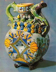 Очарование гжельской глины — в необычности форм. Опытные гончары смело экспериментировали с пространственными решениями. Они умудрялись дополнять классическую посуду круглой скульптурой. Например, на плечиках тех же фляг или сосудов можно увидеть фигурки зверей или людей.