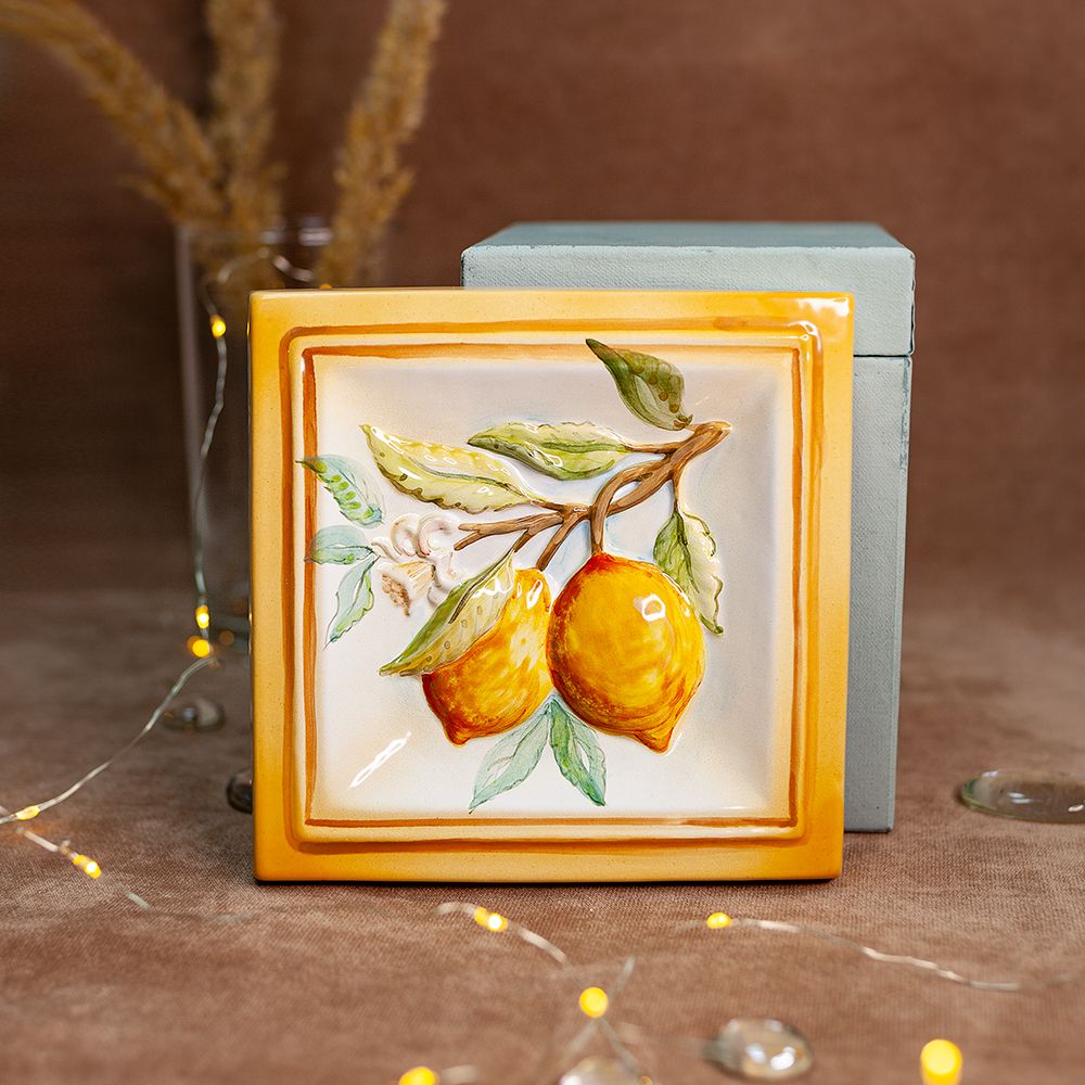 Изделие представляет керамический рельефный элемент квадратной формы, расписанный вручную, с объемным изображением лимонов в центре. Лимон символизирует долголетие и красоту. Лимонное дерево гармонизируют энергетику в семье, приносит в дом здоровье, благополучие и богатство. Данное изделие может быть использовано как самостоятельный настенный декор, и как изразец. Декор смотрится ярко и эффектно, может использоваться в местах, где фантазия архитектора или дизайнера по интерьеру не ограничивается типовым решением, он позволяет сделать акцент, привлекающий взгляд, внести завораживающую изюминку в интерьер. Декор также будет прекрасным подарком родным, близким, коллегам по работе.