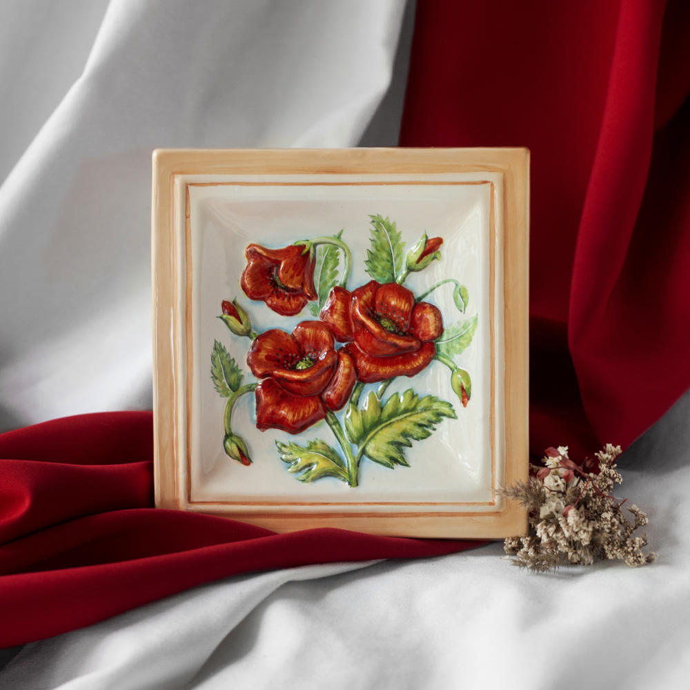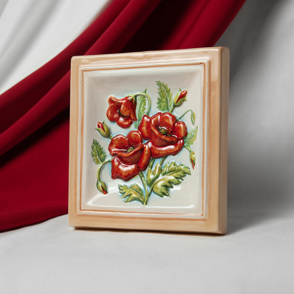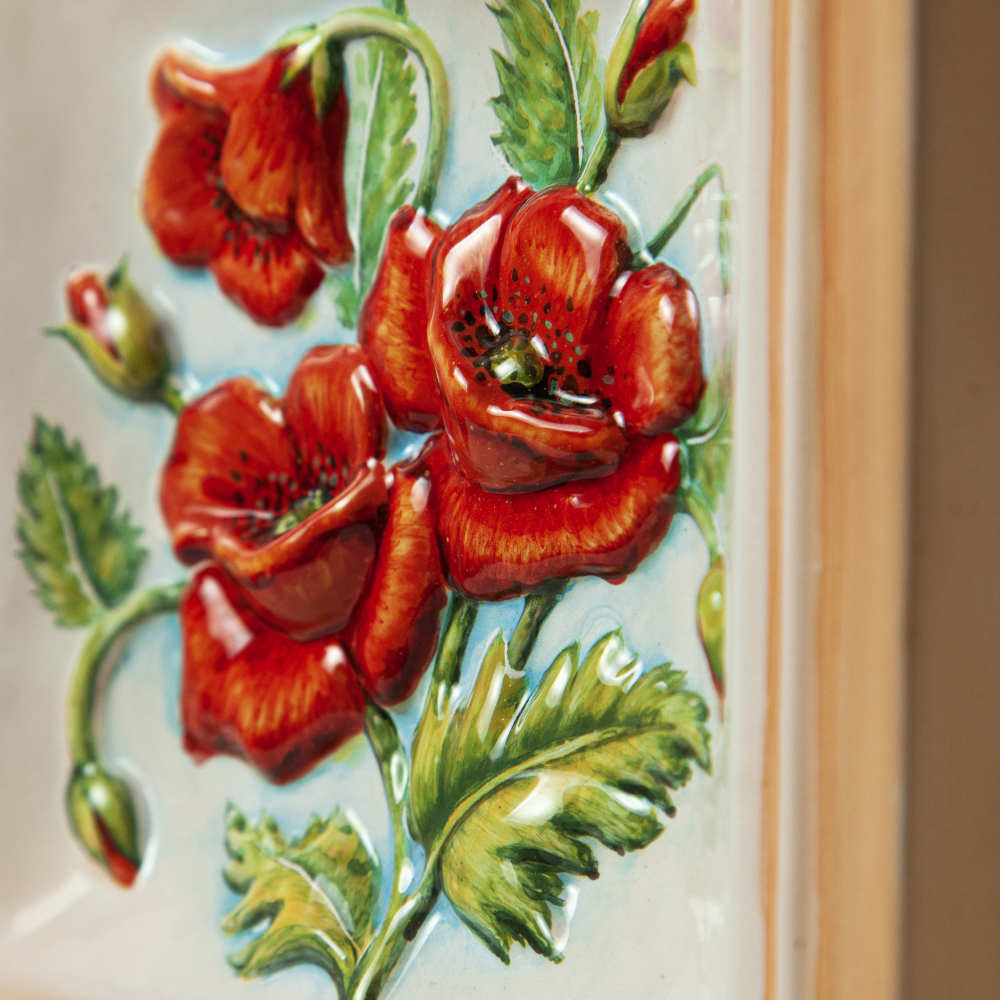 Изделие представляет керамический рельефный элемент квадратной формы, расписанный вручную, с объемным изображением ярких маков в центре. Мак – символ любви, сакрального знания, плодородия и женской притягательности. Маки по фен-шуй отвечают за любовную сферу жильцов дома и помогают им найти взаимопонимание. Данное изделие может быть использовано как самостоятельный настенный декор, и как изразец. Декор смотрится ярко и эффектно, может использоваться в местах, где фантазия архитектора или дизайнера по интерьеру не ограничивается типовым решением, он позволяет сделать акцент, привлекающий взгляд, внести завораживающую изюминку в интерьер. Декор также будет прекрасным подарком родным, близким, коллегам по работе.