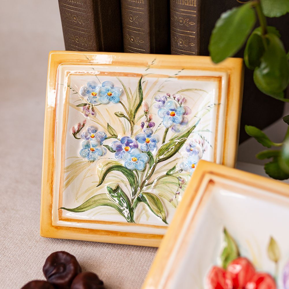 Изделие представляет керамический рельефный элемент квадратной формы, расписанный вручную, с объемным изображением прелестных незабудок, с нежно голубыми, как бирюза, лепестками и ярко-желтой, точно из золота сделанной, серединкой. Символика незабудки у всех народов одинакова и неизменна. Незабудка – цветок памяти и верности. Данное изделие может быть использовано как самостоятельный настенный декор, и как изразец. Декор смотрится ярко и эффектно, может использоваться в местах, где фантазия архитектора или дизайнера по интерьеру не ограничивается типовым решением, он позволяет сделать акцент, привлекающий взгляд, внести завораживающую изюминку в интерьер. Декор также будет прекрасным подарком родным, близким, коллегам по работе.