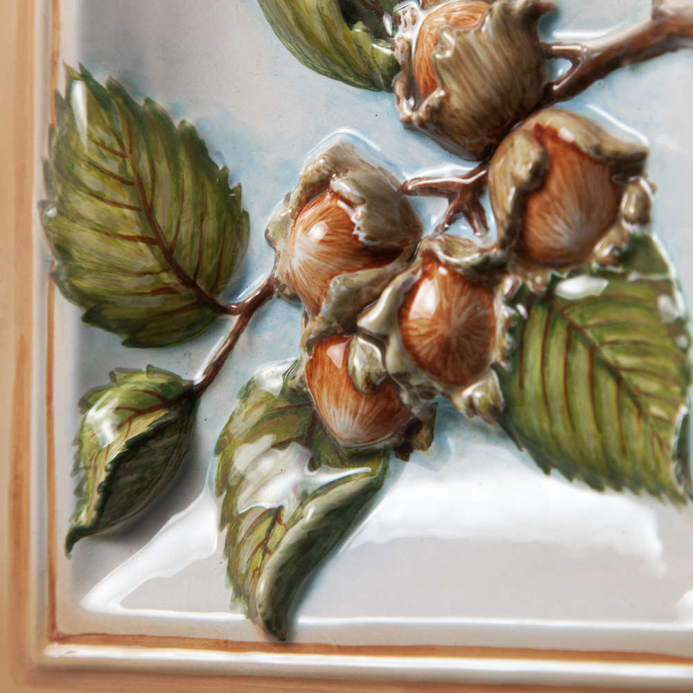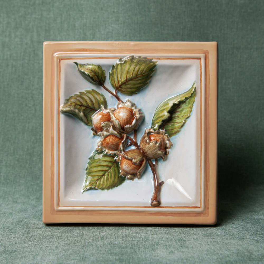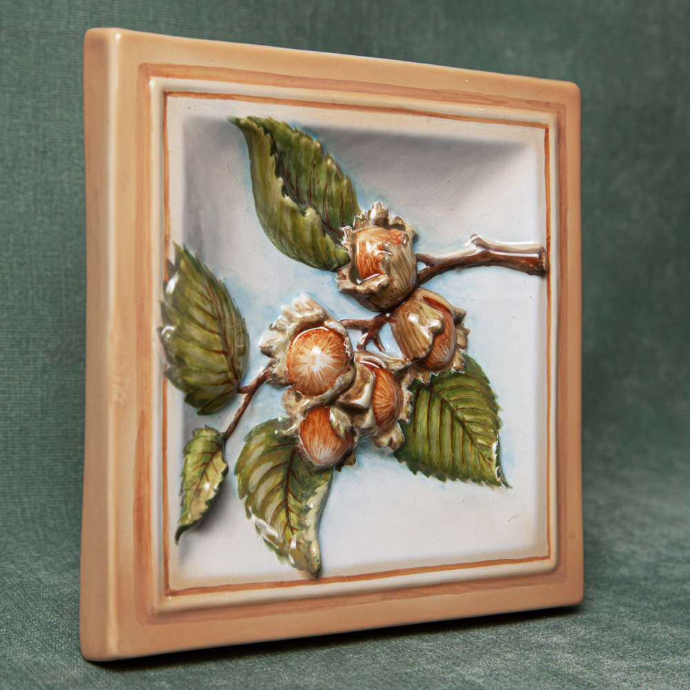 Изделие представляет керамический рельефный элемент квадратной формы, расписанный вручную, с объемным изображением ветки орехов в центре. Орех создает в доме атмосферу стабильности и достатка, привлекает везение и деньги, оберегает жилище. Данное изделие может быть использовано как самостоятельный настенный декор, и как изразец. Декор смотрится ярко и эффектно, может использоваться в местах, где фантазия архитектора или дизайнера по интерьеру не ограничивается типовым решением, он позволяет сделать акцент, привлекающий взгляд, внести завораживающую изюминку в интерьер. Декор также будет прекрасным подарком родным, близким, коллегам по работе.