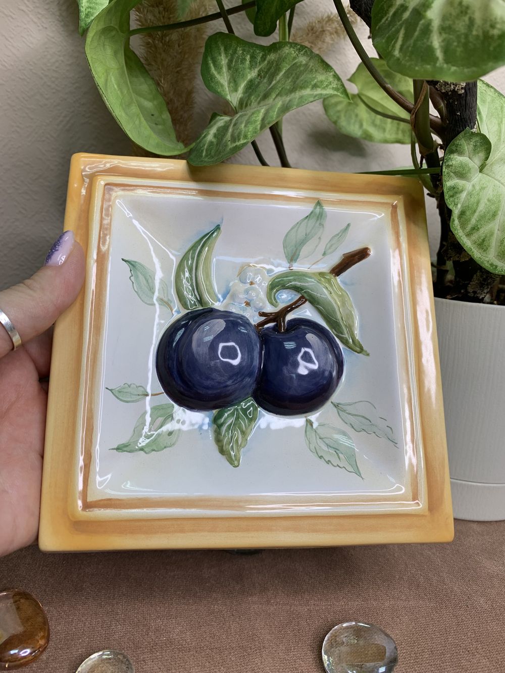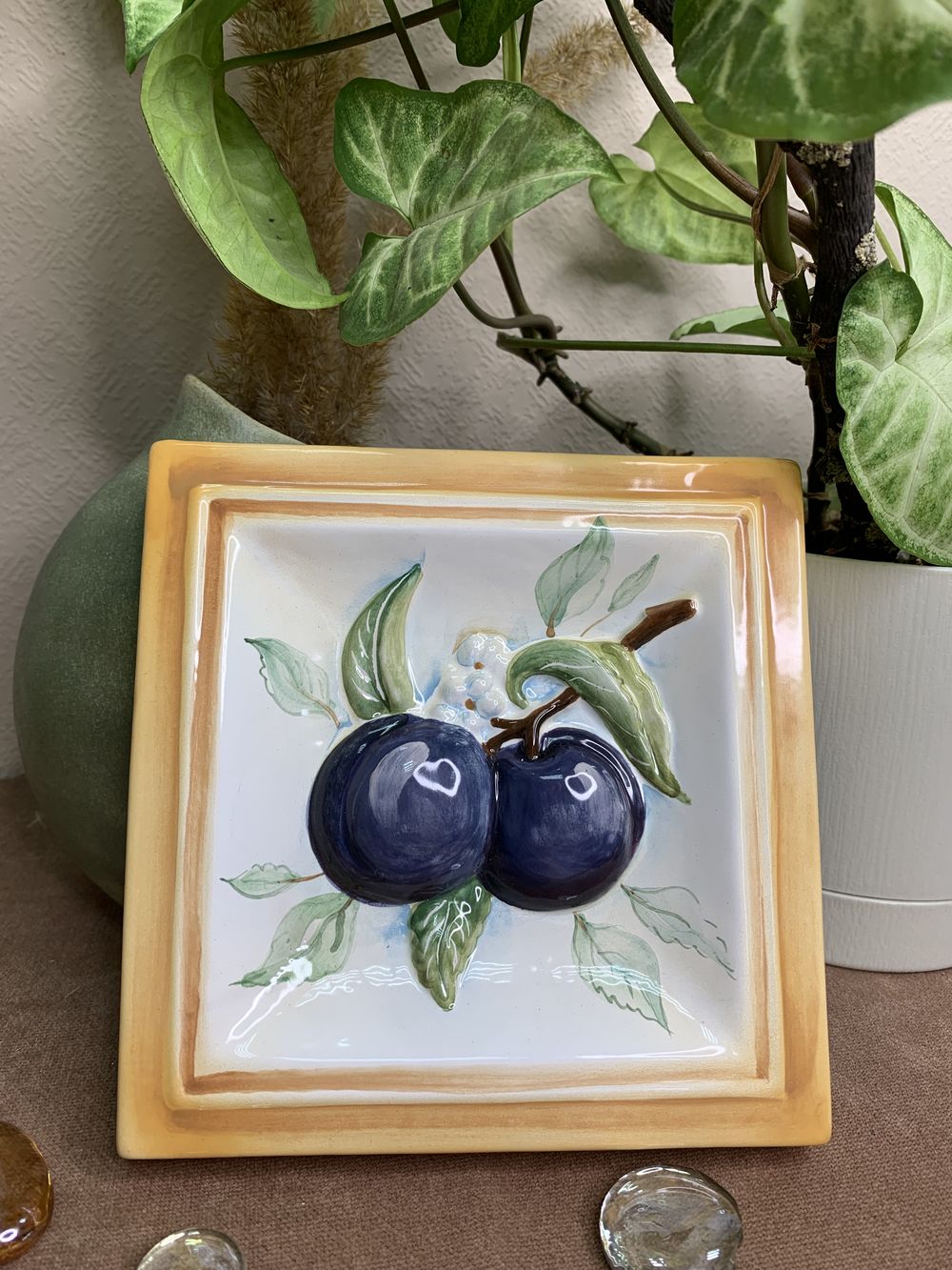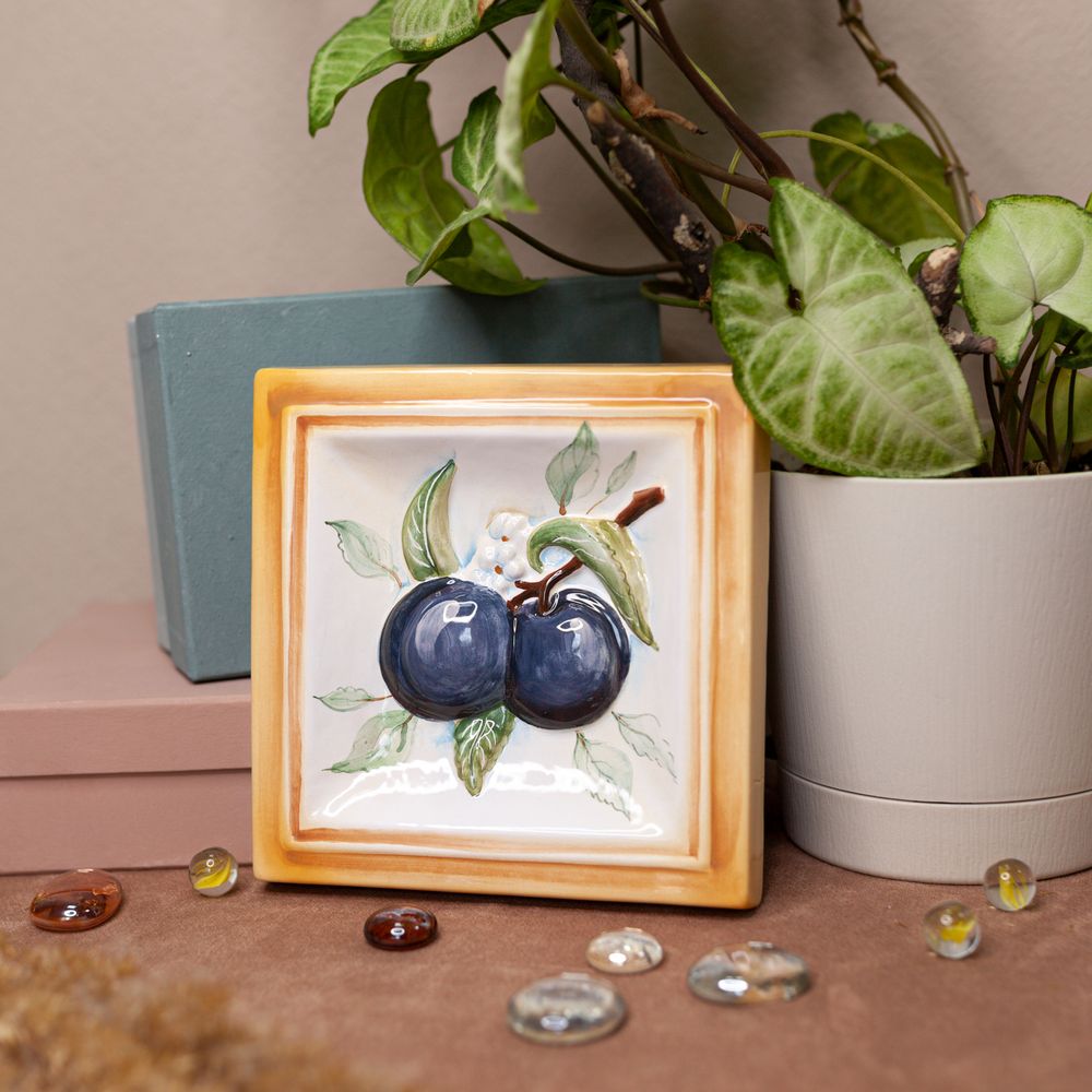 Изделие представляет керамический рельефный элемент квадратной формы, расписанный вручную, с объемным изображением ветки сливы с сочными плодами. Слива – это больше, чем слива, это и символ космического значения, выражение возрождения и непрерывности жизни. В Японии слива умэ прежде всего ассоциируется с началом весны. Данное изделие может быть использовано как самостоятельный настенный декор, и как изразец. Декор смотрится ярко и эффектно, может использоваться в местах, где фантазия архитектора или дизайнера по интерьеру не ограничивается типовым решением, он позволяет сделать акцент, привлекающий взгляд, внести завораживающую изюминку в интерьер. Декор также будет прекрасным подарком родным, близким, коллегам по работе.