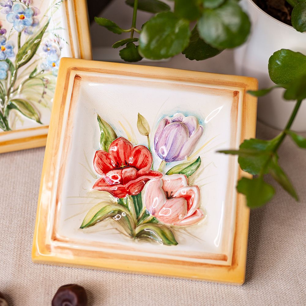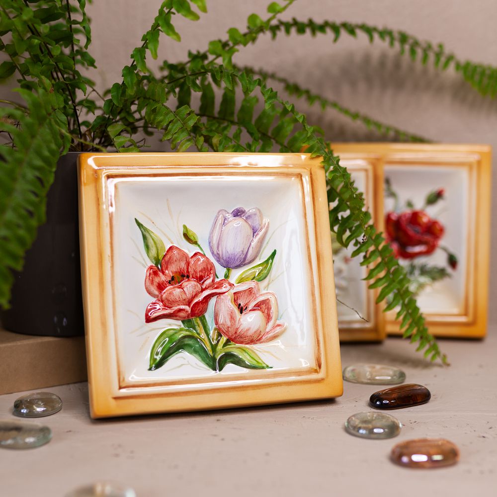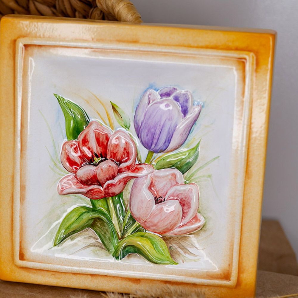 Изделие представляет керамический рельефный элемент квадратной формы, расписанный вручную, с объемным изображением разноцветных тюльпанов в центре. Тюльпан — символ весны. Он олицетворяет окончание холодов и радость от солнечных согревающих лучей. Данное изделие может быть использовано как самостоятельный настенный декор, и как изразец. Декор смотрится ярко и эффектно, может использоваться в местах, где фантазия архитектора или дизайнера по интерьеру не ограничивается типовым решением, он позволяет сделать акцент, привлекающий взгляд, внести завораживающую изюминку в интерьер. Декор также будет прекрасным подарком родным, близким, коллегам по работе.