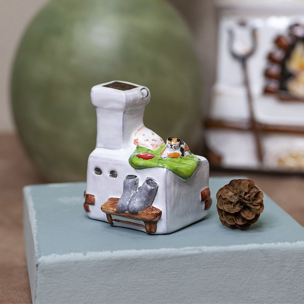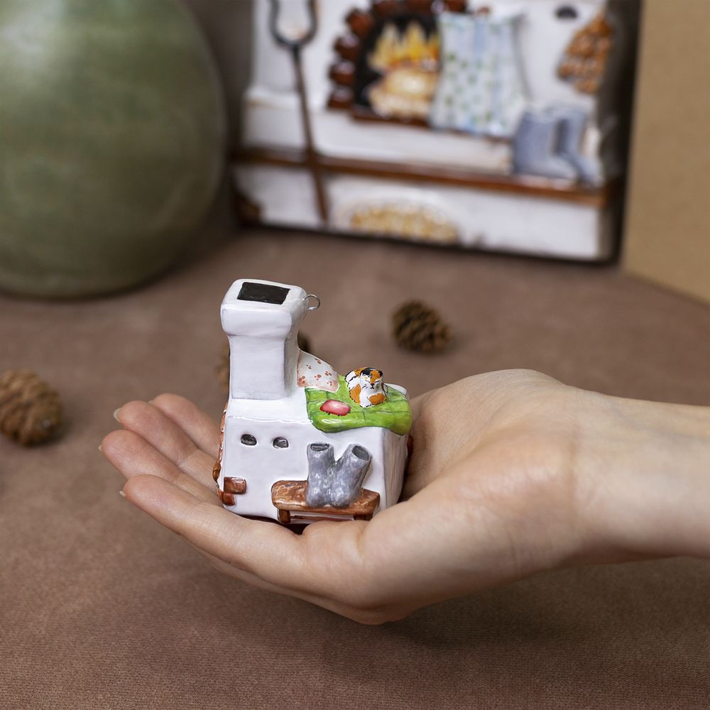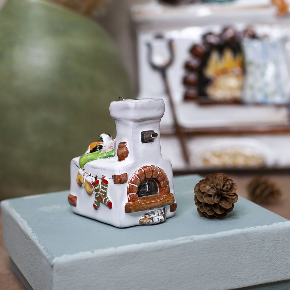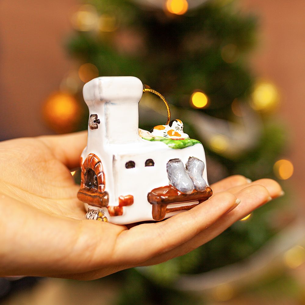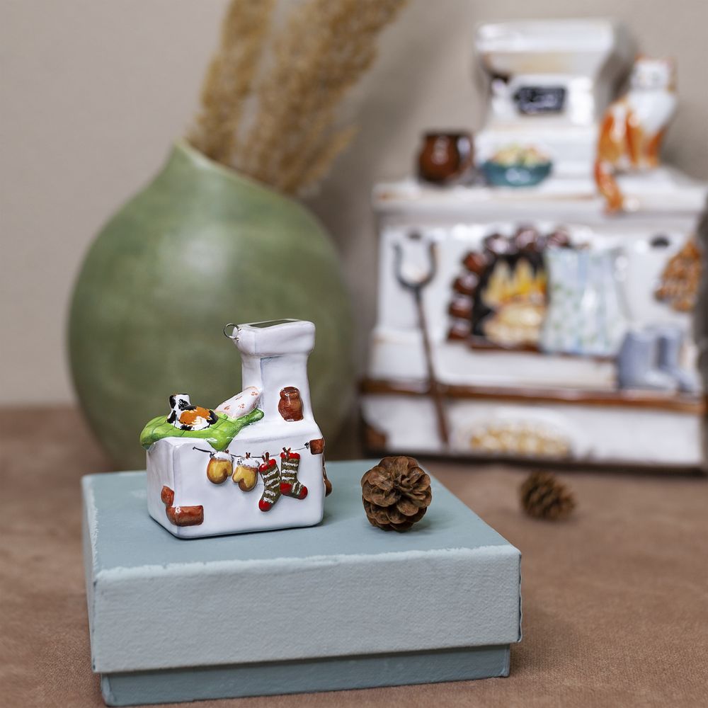 Подвес “Печка” изготовлен в технике майолика и украшен ручной художественной росписью. Изделие выполнено с большой теплотой и вниманием к деталям, что делает его по-настоящему уникальным. Радушная русская печка, готова накормить каждого, а черный кот на ней, промурлычет тысячу сказок на своем кошачьем языке. Печка выполнена в старых русских традициях и будет напоминать о тепле и уюте домашнего очага. Каждая крошечная деталь и красочная линия созданы с особым вниманием и любовью. Этот подвес не только украсит вашу елку, но и наполнит домашний интерьер теплотой, добротой и уютом. Он будет напоминать о важности семьи, традициях и домашнем тепле, принося радость и умиротворение каждый раз, когда вы на него посмотрите. Это оригинальный подарок для друзей и близких на любое торжество, а также прекрасный экземпляр для коллекционеров керамических изделий ручной работы.