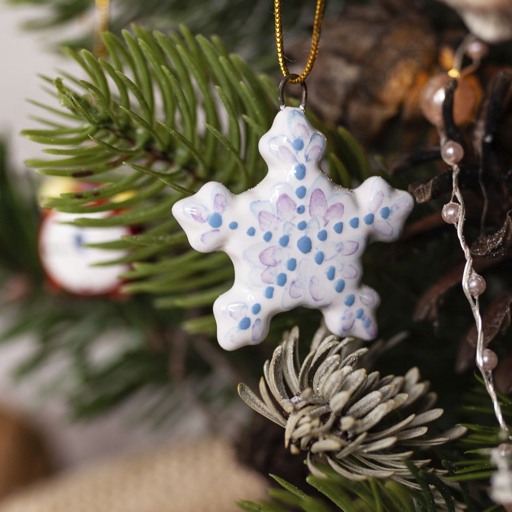 Подвес “Снежинка” выполнен в технике майолика, украшен ручной художественной росписью и входит в коллекцию украшений “Для маленькой ёлочки”. Эта крошка станет замечательным украшением для маленькой новогодней елочки, и также будет прекрасным подарком, модным аксессуаром на булавке, кулоном, брелоком. Соберите всю коллекцию мини-украшений, чтобы малышка-елочка была самой красивой и нарядной.