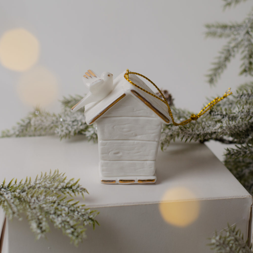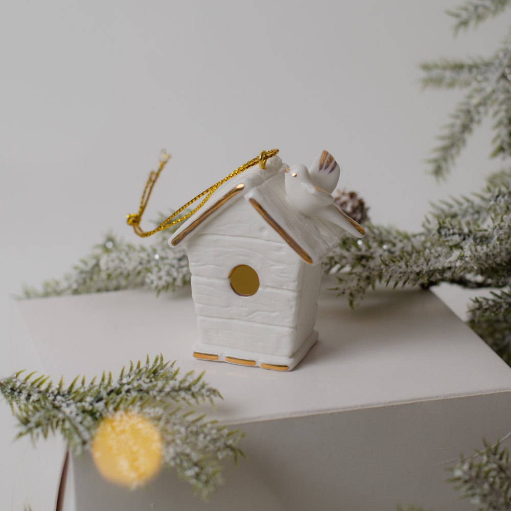 Подвес “Скворечник”, выполнен из фарфора бисквита и украшен тонкой художественной росписью золотом, придающей ему особое благородство.