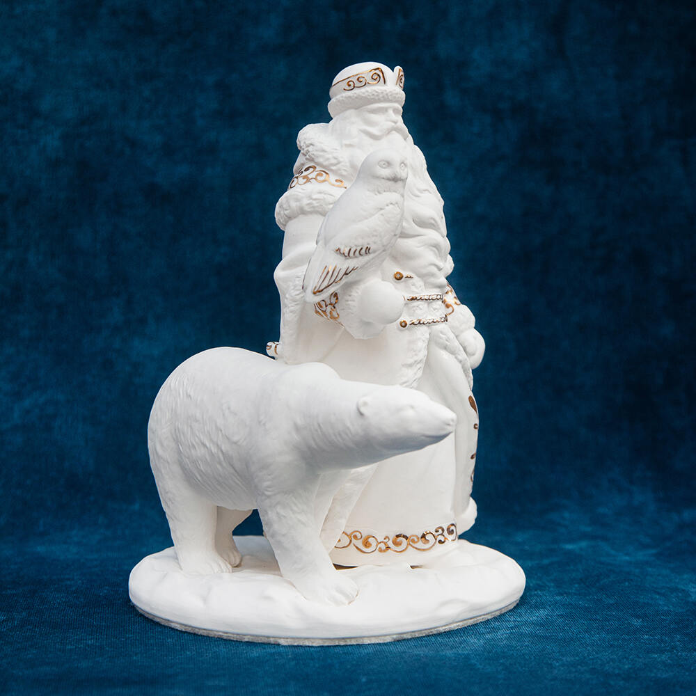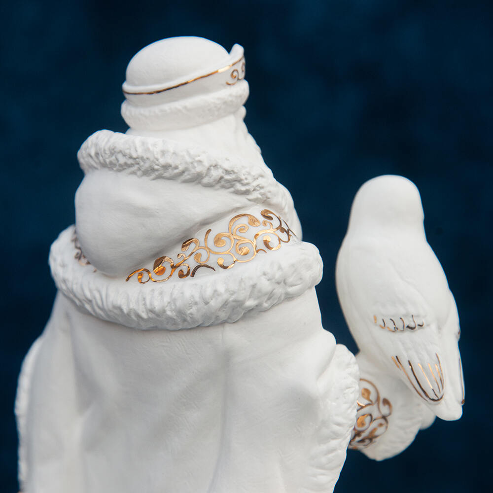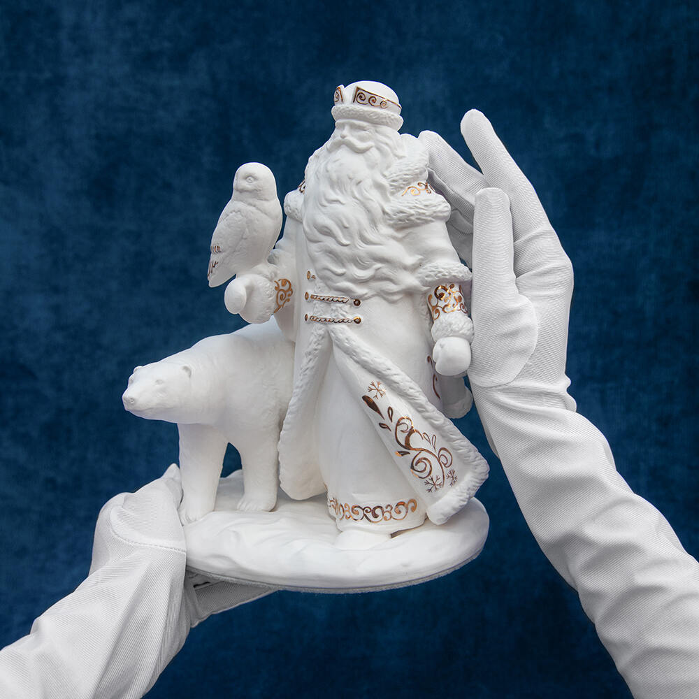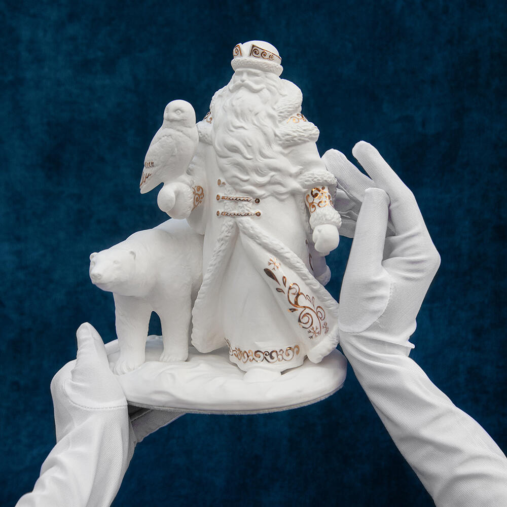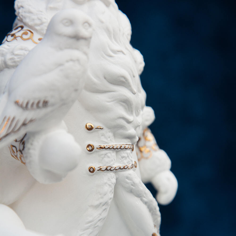 Дед Мороз в окружении северной природы, словно сошедший с иллюстрации зимней сказки. На его плече уютно устроилась мудрая полярная сова, а рядом важно шествует белый медведь, верный спутник зимнего волшебника. Золотые акценты, словно россыпь волшебного снега, добавляют изделию шик и элегантность, подчеркивая его праздничное настроение. “Дед Мороз в Заполярье” станет не только великолепным украшением вашего интерьера, но и идеальным подарком для коллекционеров фарфора, любителей уникальных сувениров и, конечно же, для всех, кто верит в волшебство Нового года