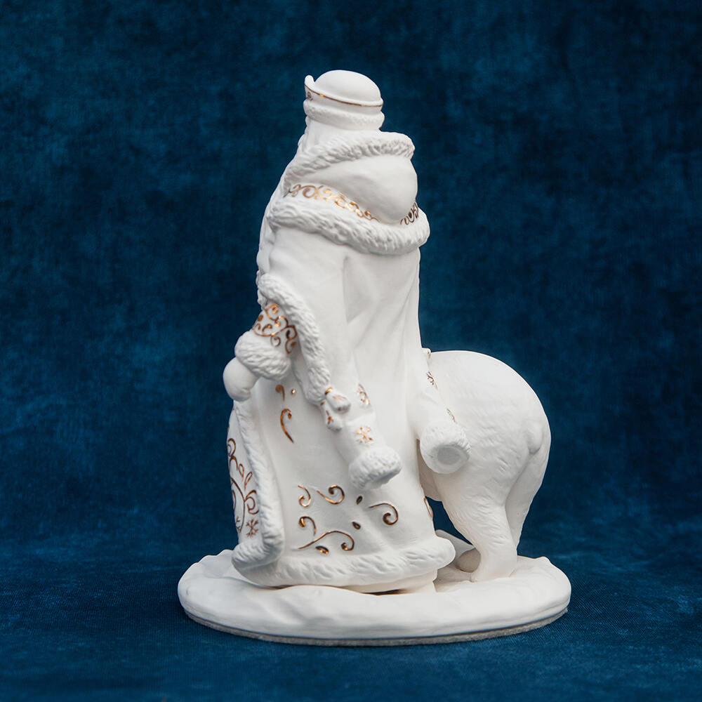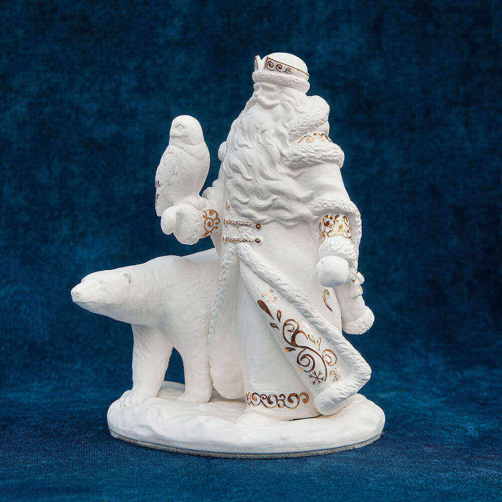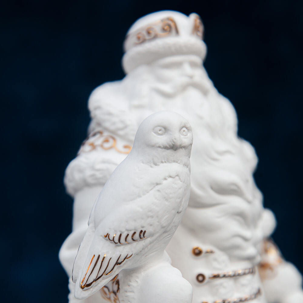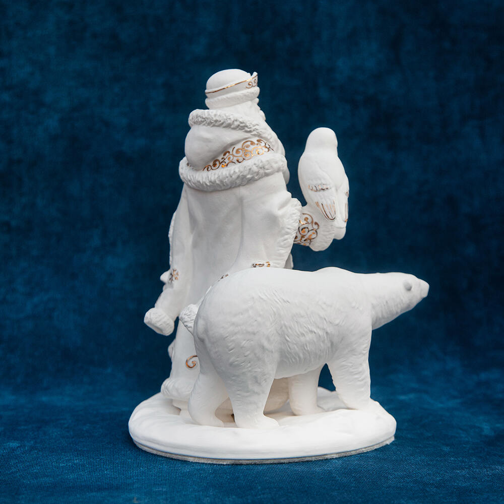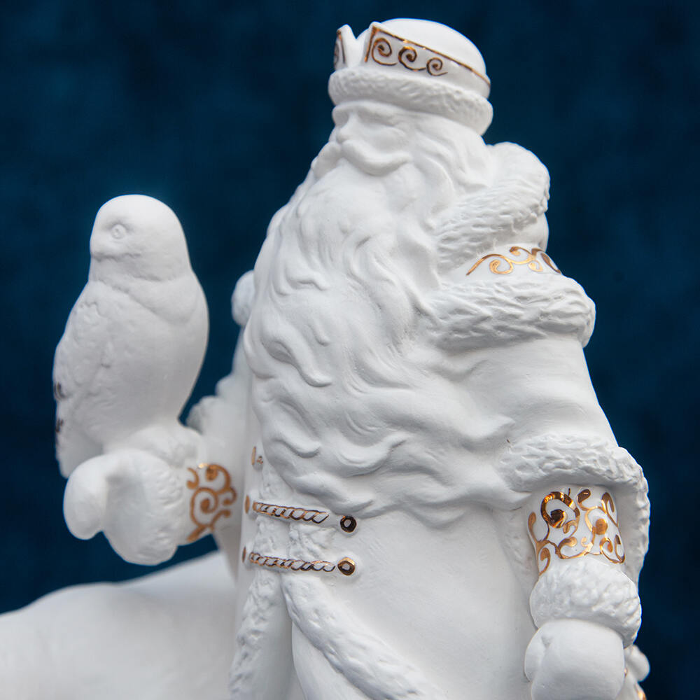 Дед Мороз в окружении северной природы, словно сошедший с иллюстрации зимней сказки. На его плече уютно устроилась мудрая полярная сова, а рядом важно шествует белый медведь, верный спутник зимнего волшебника. Золотые акценты, словно россыпь волшебного снега, добавляют изделию шик и элегантность, подчеркивая его праздничное настроение. “Дед Мороз в Заполярье” станет не только великолепным украшением вашего интерьера, но и идеальным подарком для коллекционеров фарфора, любителей уникальных сувениров и, конечно же, для всех, кто верит в волшебство Нового года