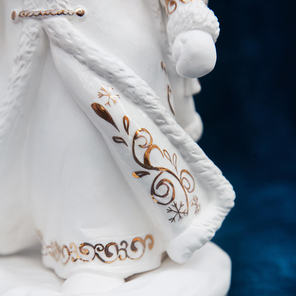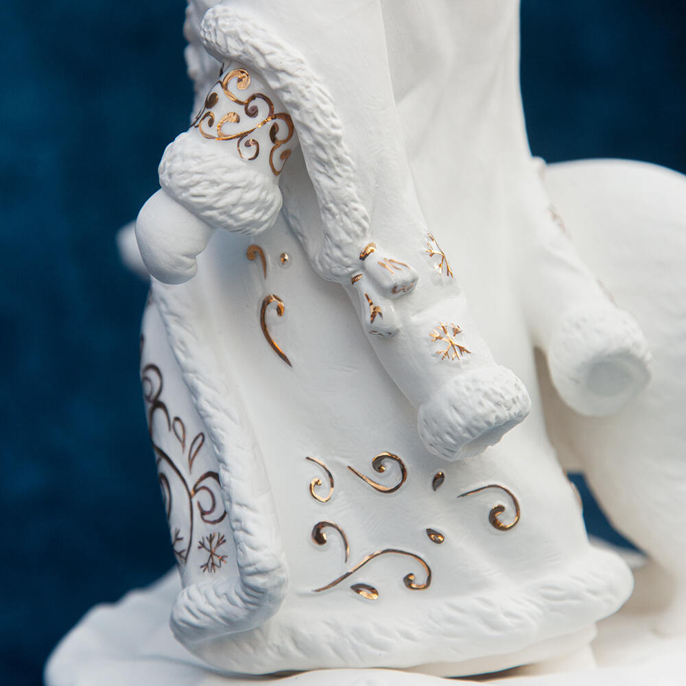 Фигура “Дед Мороз в Заполярье” изготовлена из фарфора бисквита и украшена ручной художественной росписью золотом. Это настоящее произведение искусства, которое притягивает взгляд своей изысканной детализацией и мастерством исполнения. Ручная художественная роспись золотом, создает ощущение сказочного волшебства. Каждый элемент тщательно прорисован, будто приглашая вас окунуться в атмосферу сказки и уюта.