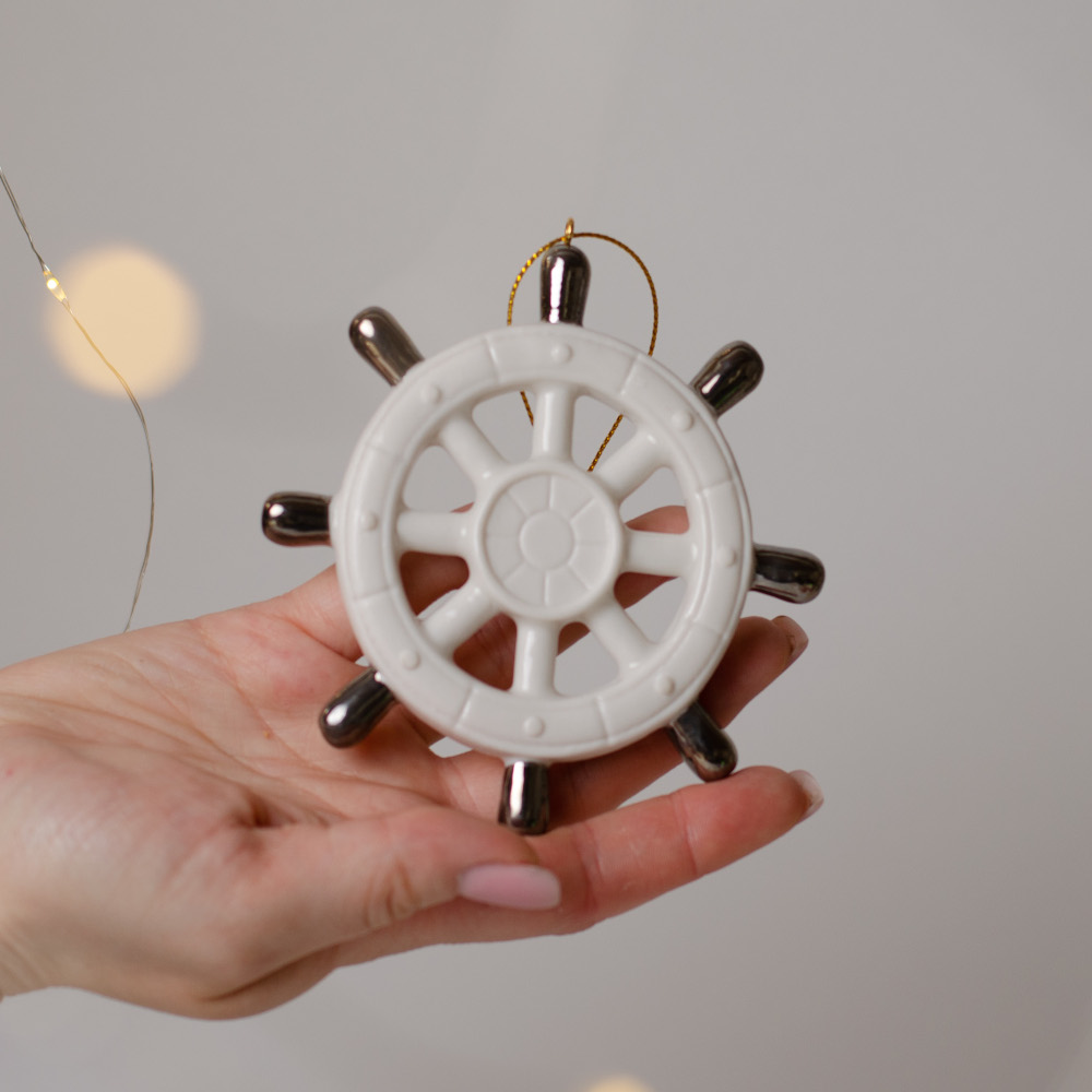 Матовая фактура фарфора бисквита подчеркивает классическую форму штурвала, а серебро добавляет изысканности и напоминает о блеске старинных навигационных приборов. Каждая деталь изделия проработана с любовью и мастерством.