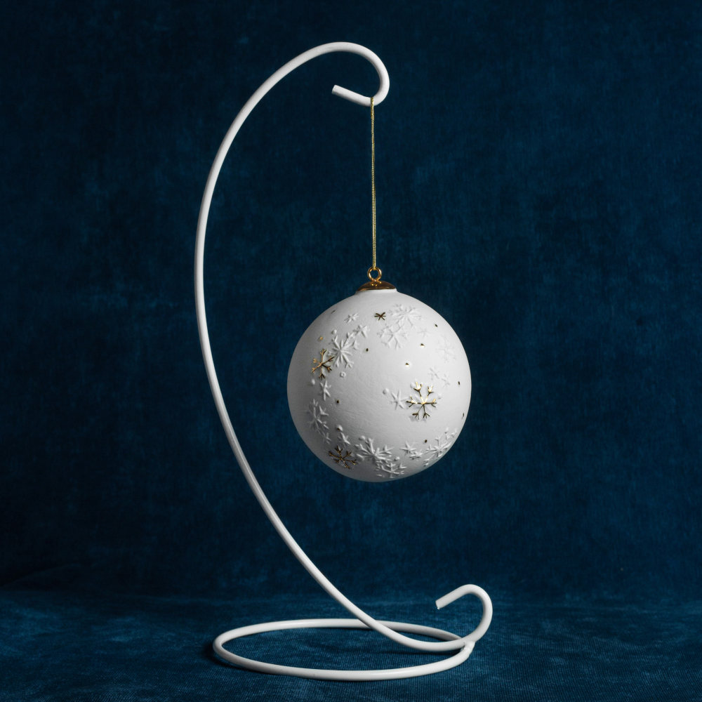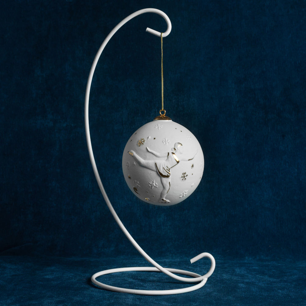 Елочный шар “Фигуристка” изготовлен из фарфора бисквита, с рельефным изображением грациозной фигуристки на коньках, украшенный тонкой золотой прорисовкой. Шар входит в новогоднюю спортивную коллекцию шаров и олицетворяет эстетику спорта и успешную историю Российского фигурного катания. Красота белоснежного фарфора переплетается с динамикой движений ледовой танцовщицы и олицетворяет красоту самого изделия вплетенную в каждый штрих. В прошлом, фарфор считался предметом роскоши, доступным только богатым людям и аристократам. Его дарили на праздники и передавали по наследству. Шар представлен в элегантной подарочной упаковке и украсит собой не только вашу ёлку и рождественские гирлянды – это запоминающийся подарок как на Новый год и Рождество, как для любителей спорта так и для коллекционеров фарфоровых изделий ручной работы.