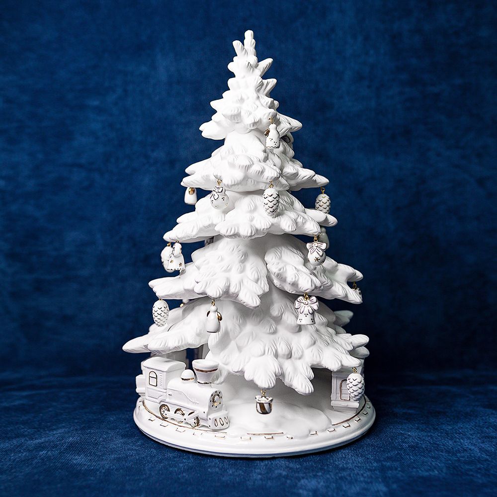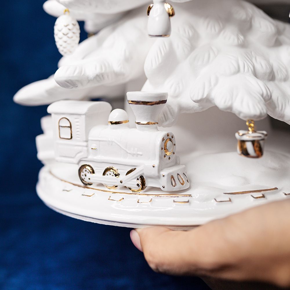 Эксклюзивное изделие “Фарфоровая Ёлка” является высокохудожественным предметом интерьера. На ней расположились милые подвесы в виде подарка, ангелочка, шишки, шарика и колокольчика. Вокруг елки как по волшебству расположился паровозик с вагончиками. В былые времена фарфор могли позволить себе только богатые люди и аристократы. Его дарили на праздники, он доставался в наследство от бабушек. Фарфоровая Ёлка добавит нотку роскоши и неповторимости в интерьер, удовлетворит запросы самых искушенных ценителей искусства. Изумительный подарок, который никого не оставит равнодушным и подчеркнет вкус дарителя.