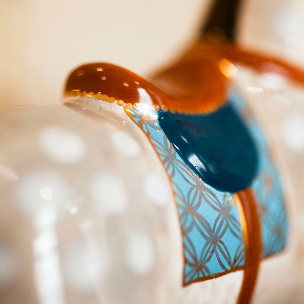 Изделие выполнено в технике майолика, материалы: красная глина, белая глазурь, высокотемпературный обжиг, художественная роспись.