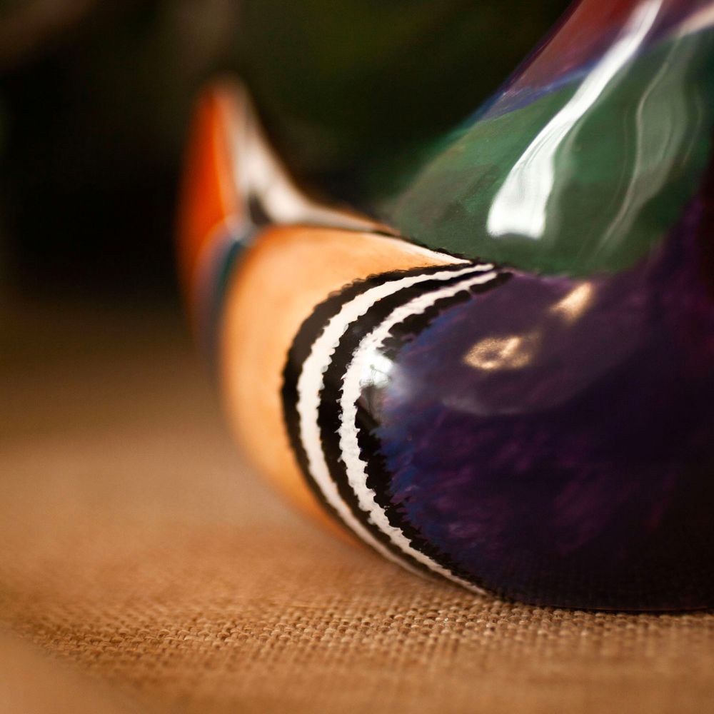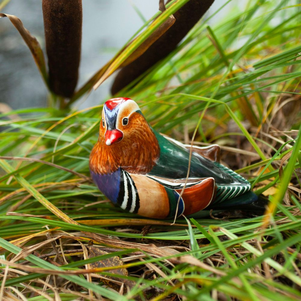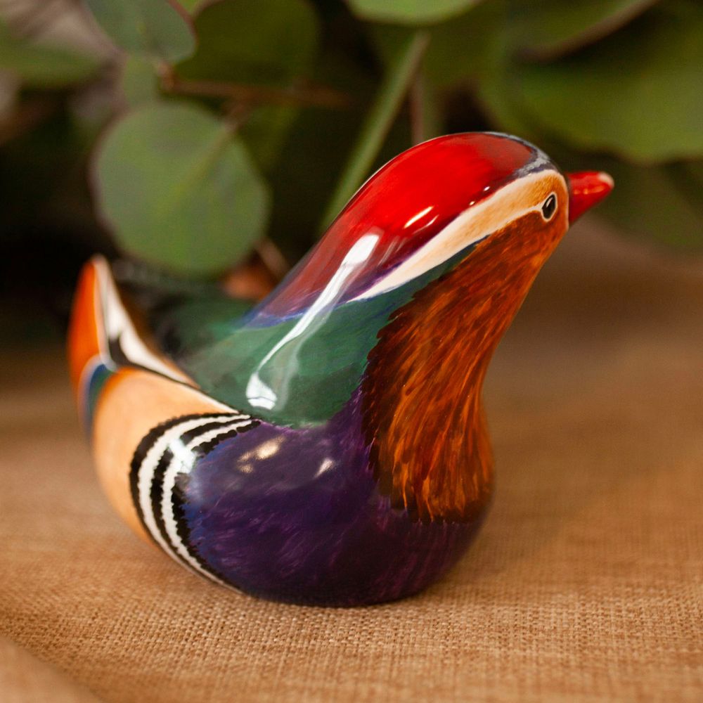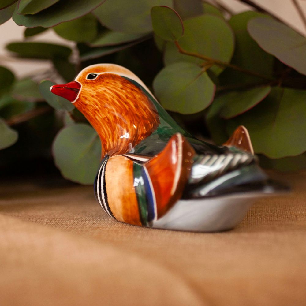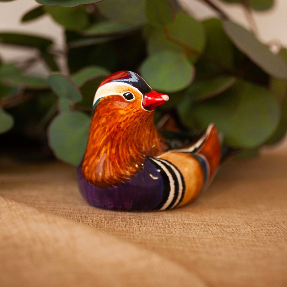 Изделие выполнено в технике майолика, материалы: красная глина, белая глазурь, высокотемпературный обжиг, художественная роспись. Эффектное изделие ручной работы представляет собой фигуру селезня. Легенда об уточках породила традицию в фен-шуй ставить их в доме для гармонизации семейных уз. Ведь эти птицы, создавая пару на всю жизнь, стали настоящим символом любви и верности. Утка и селезень станут символом любви и верности.