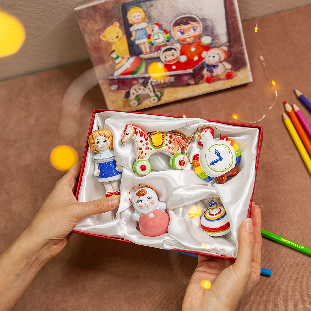 Если же вы хотите сделать презент более праздничным, обратите внимание на наборы игрушек. Они предлагаются в красивых коробках, где каждый элемент находится в специальном углублении на белом шелке. Такая упаковка придает им презентабельный, нарядный вид. Вместе с этим она обеспечивает сохранность изделий. После праздника вы аккуратно снимите керамические игрушки и распределите их по коробкам. Там они будут терпеливо дожидаться следующего Нового года.