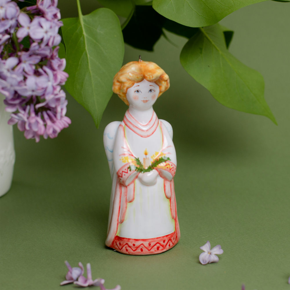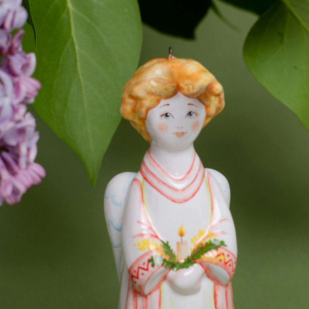 Это изделие ручной работы представляет собой фигурку ангела ручной работы, которая расписана художником нежными и легкими оттенками. Гармоничное сочетание цветов приносит особое настроение ожидания чуда. Ангел представлен в простом и понятном облике, со светлыми волосами и нежной улыбкой. Станет прекрасным подарком на именины, свадьбы, Новый год, Рождество, Пасху и другие праздники. Принято считать, что Ангелы избавляют от опасности, помогают преодолеть трудности, наполняют нашу жизнь миром и любовью. Наш Ангел словно излучает тепло. Изображения ангела принято дарить на удачу, так же Ангелы избавляют от опасности. Ангел станет украшением Вашей коллекции керамики, и возможно, прошепчет о том, почему он неизменно улыбается.