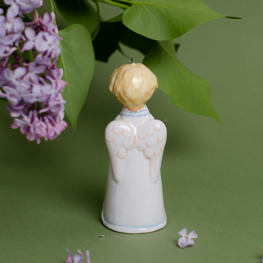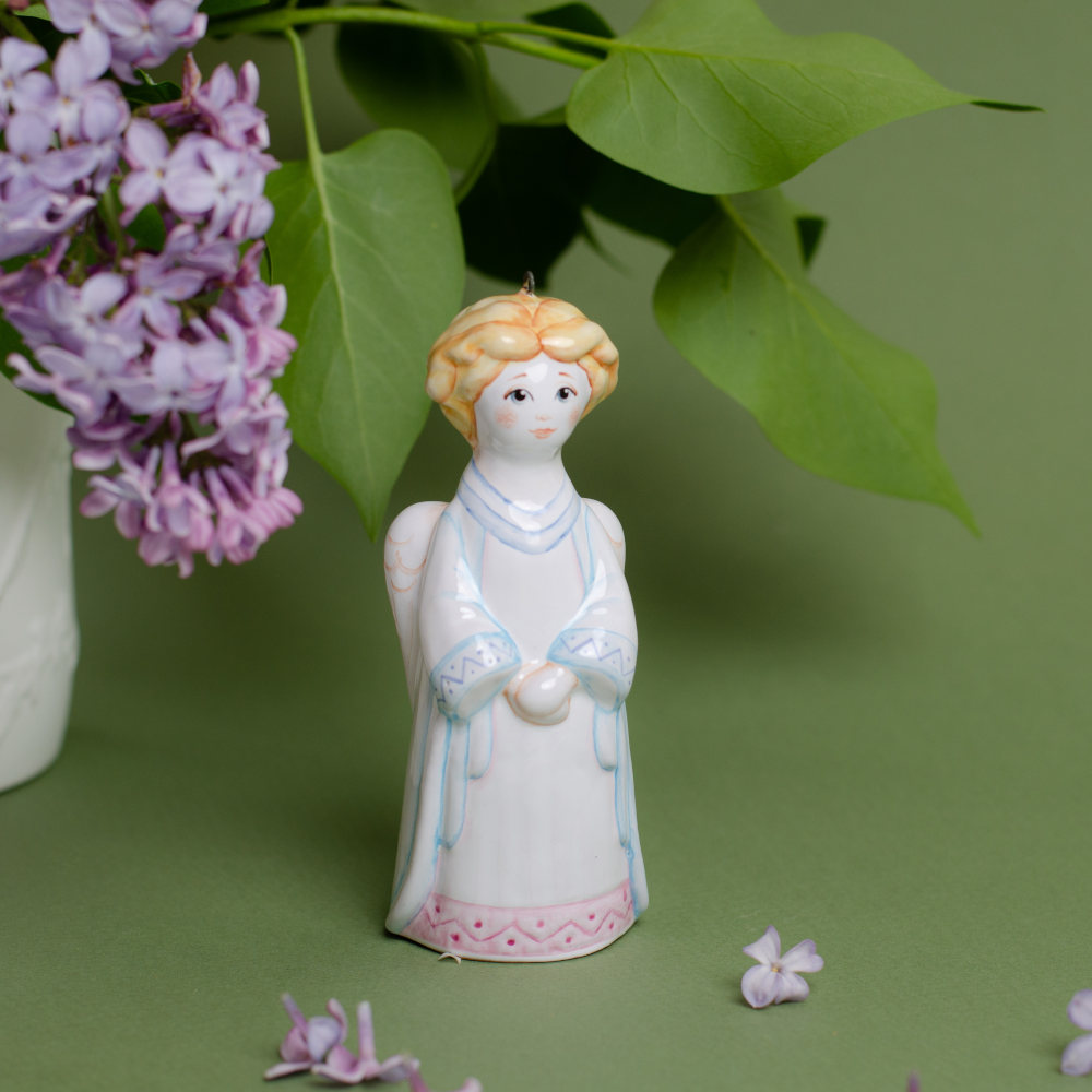 Это изделие ручной работы представляет собой фигурку ангела ручной работы, которая расписана художником нежными и легкими оттенками. Гармоничное сочетание голубого цвета, символа верности, с розовым, символом чистоты, успокаивает, и приносит особое настроение ожидания чуда. Ангел представлен в простом и понятном облике, со светлыми волосами и нежной улыбкой. Станет прекрасным подарком на именины, свадьбы, Новый год, Рождество, Пасху и другие праздники. Принято считать, что Ангелы избавляют от опасности, помогают преодолеть трудности, наполняют нашу жизнь миром и любовью. Наш Ангел словно излучает тепло. Изображения ангела принято дарить на удачу, так же Ангелы избавляют от опасности. Ангел станет украшением Вашей коллекции керамики, и возможно, прошепчет о том, почему он неизменно улыбается.