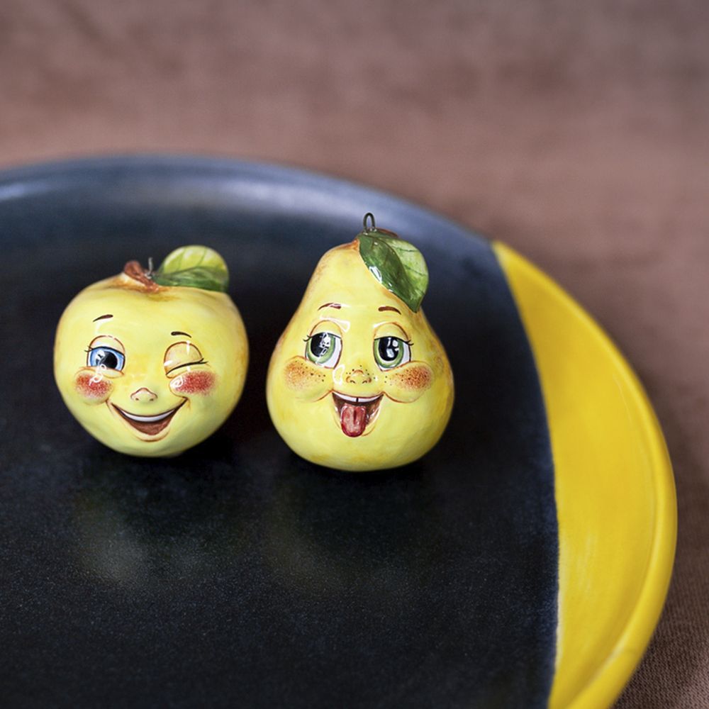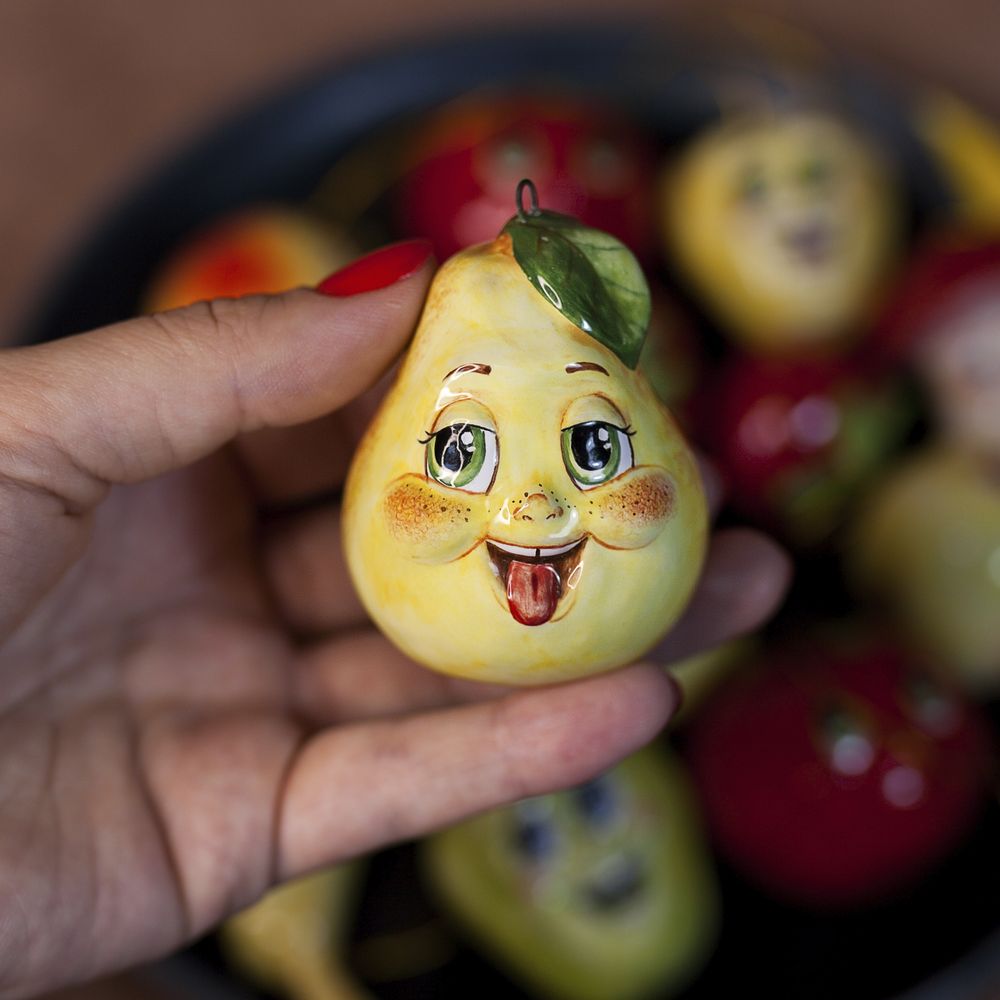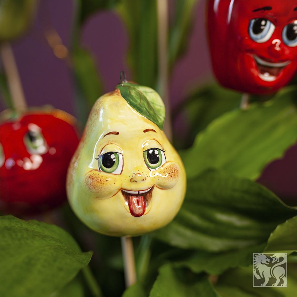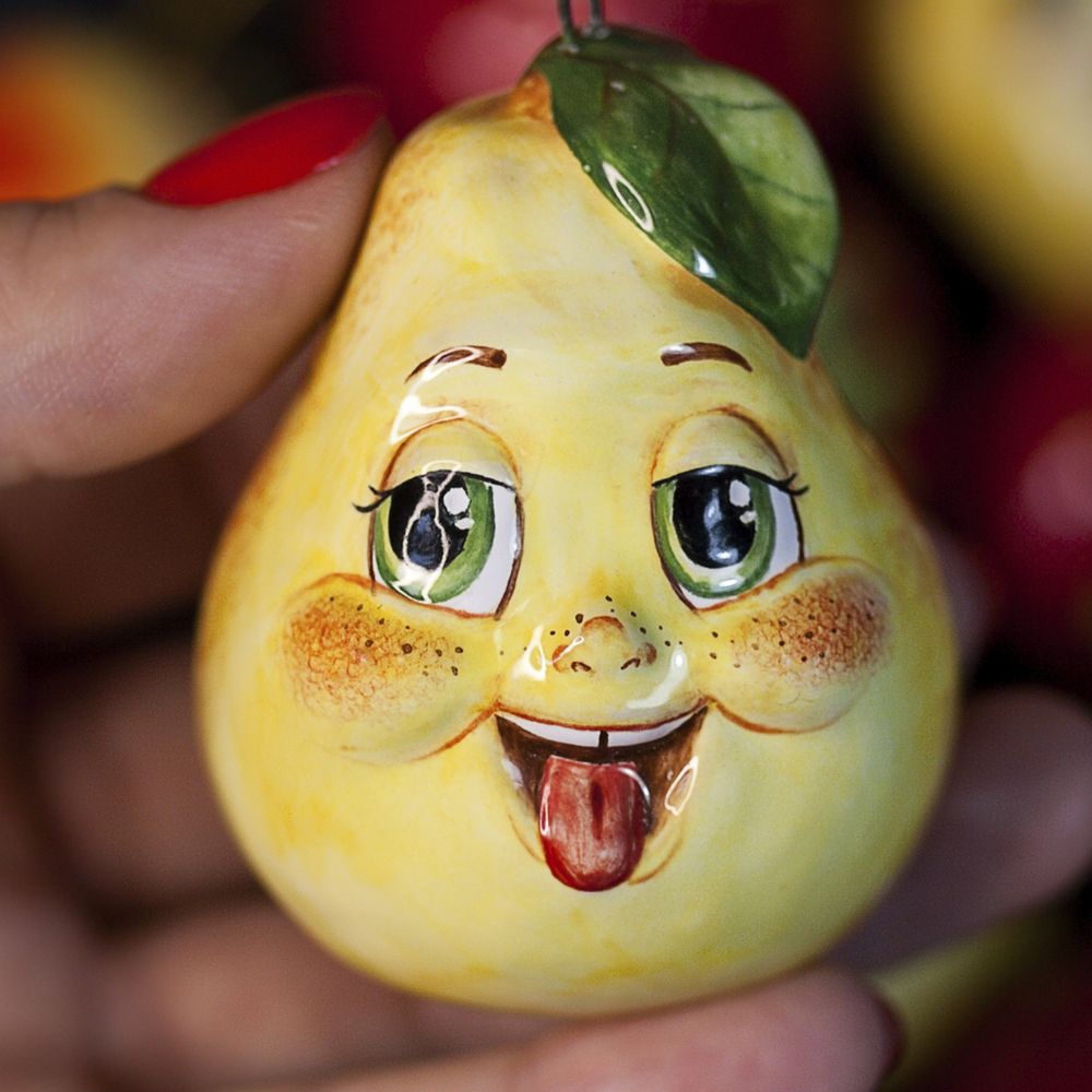 Изделие ручной работы входит в коллекцию “Фруктовые эмоции” и представляет собой проказницу Грушу с высунутым ячычком, которая дразнит нас и будто говорит: “Посмотрите какая я сочная и вкусная, ну-ка съешьте меня”. Художник воспользовался всей роскошной палитрой современных керамических глазурей, чтобы Груша выглядела озорной, весёлой малышкой, поскольку Груша символизирует как долгую жизнь и успех, так красоту и непостоянство. Данное изделие станет украшением вашего интерьера, создаст настроение, будет чудесным подарком. Соберите всю коллекцию ярких, красивых, эмоциональных овощей и фруктов. Изделия из этой коллекции могут быть также использованы для создания эффектных интерьеров в кафе, ресторанах, барах, для украшения новогодней ели или как модель на уроках рисования.