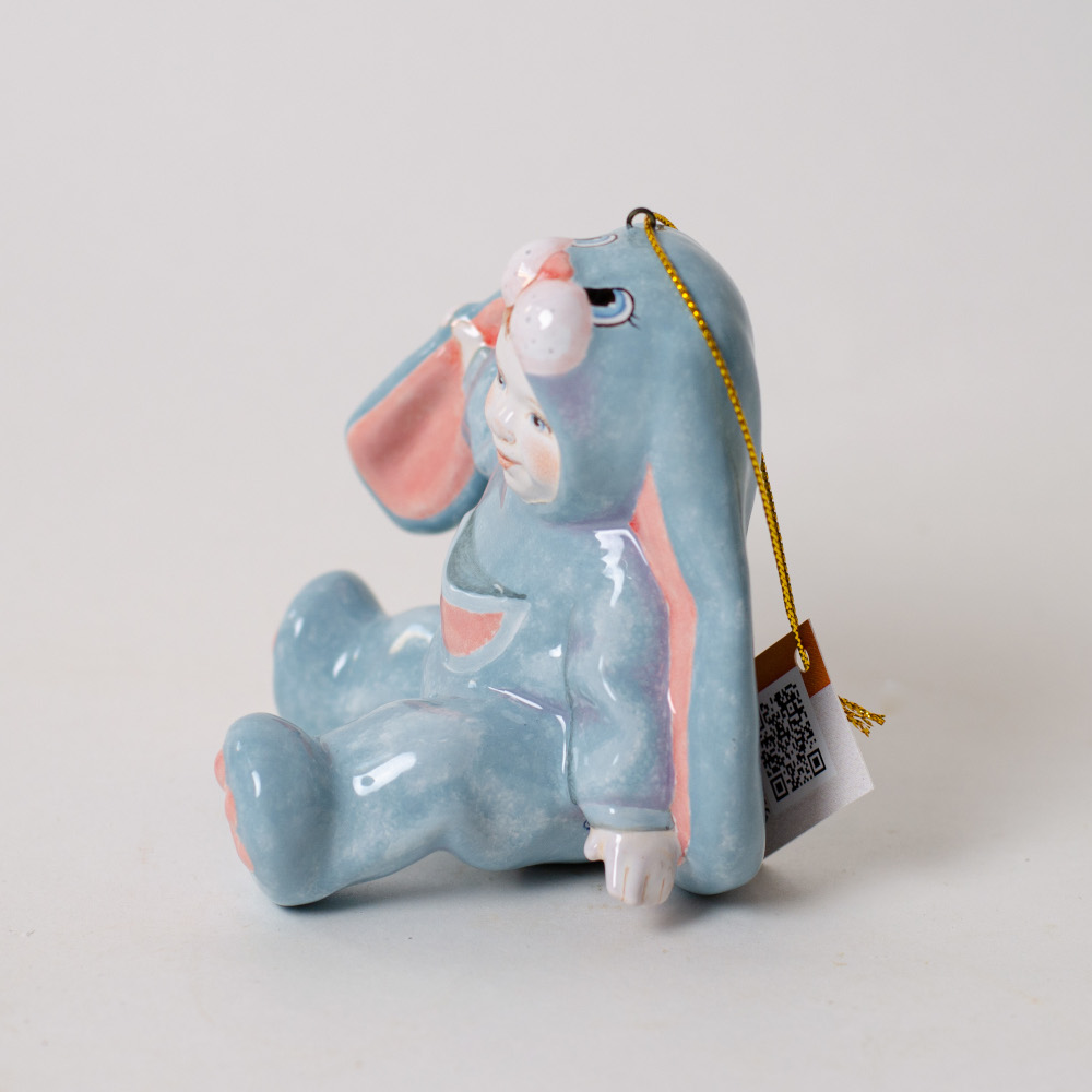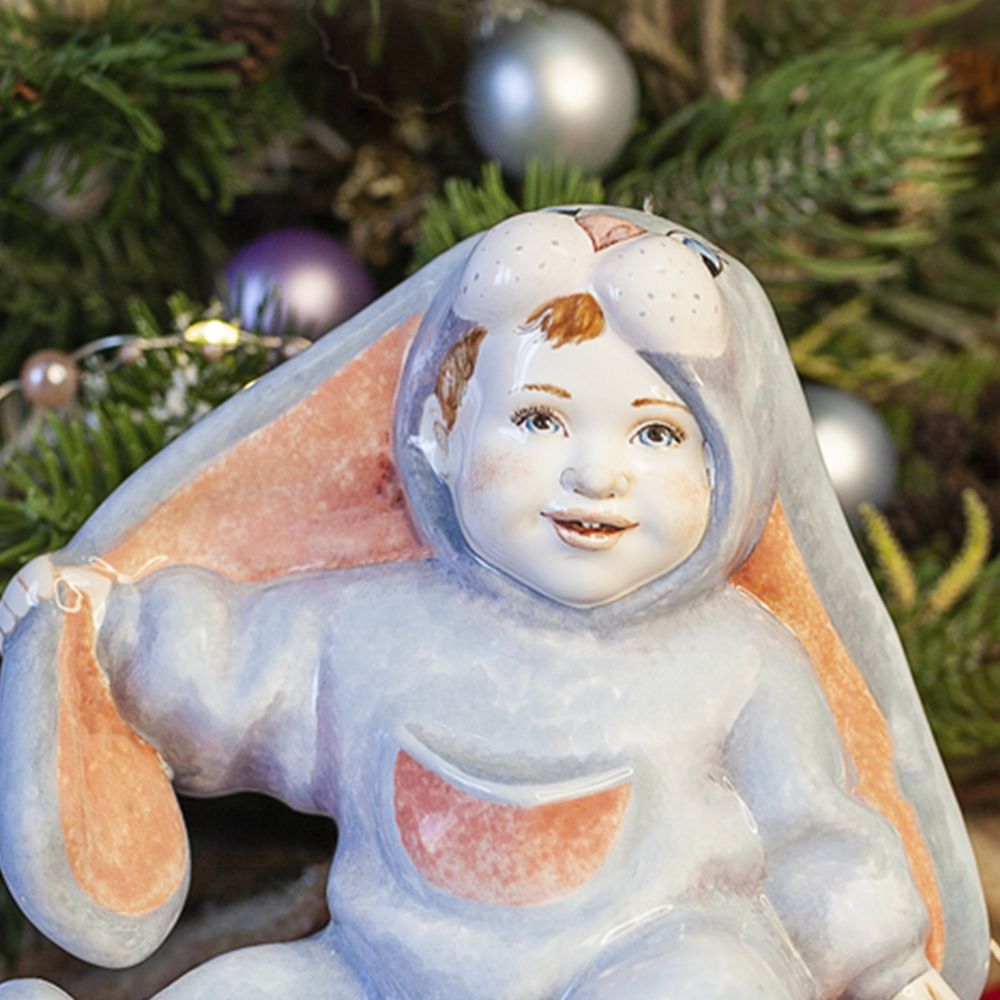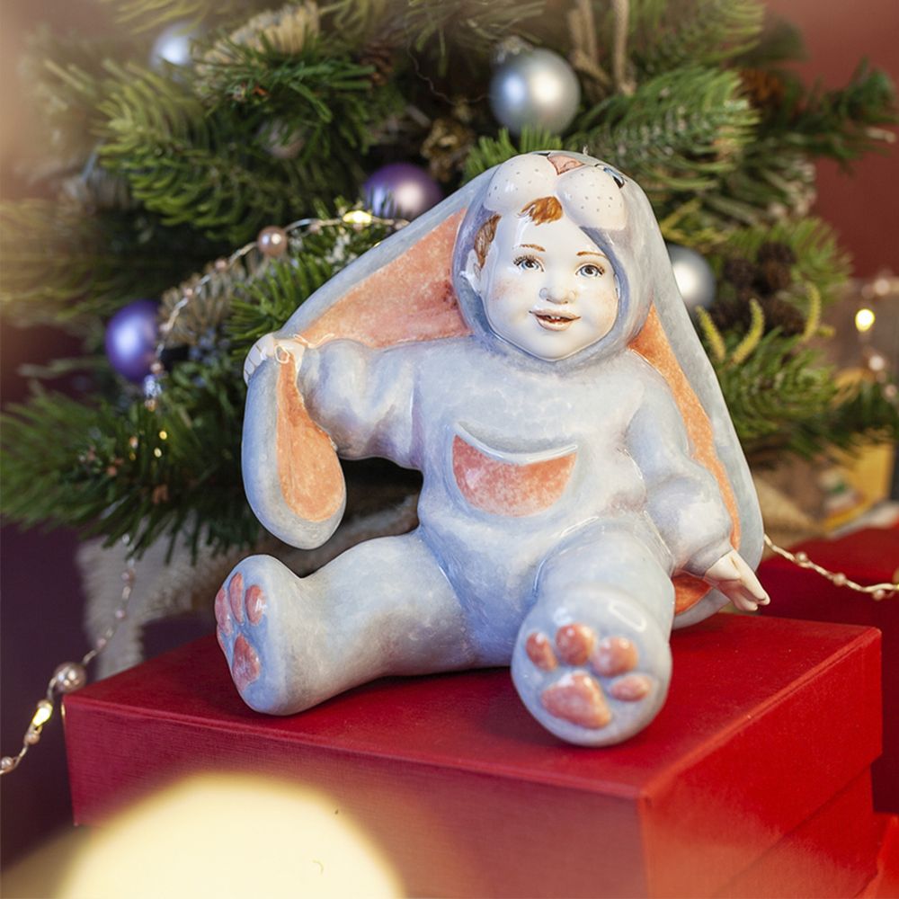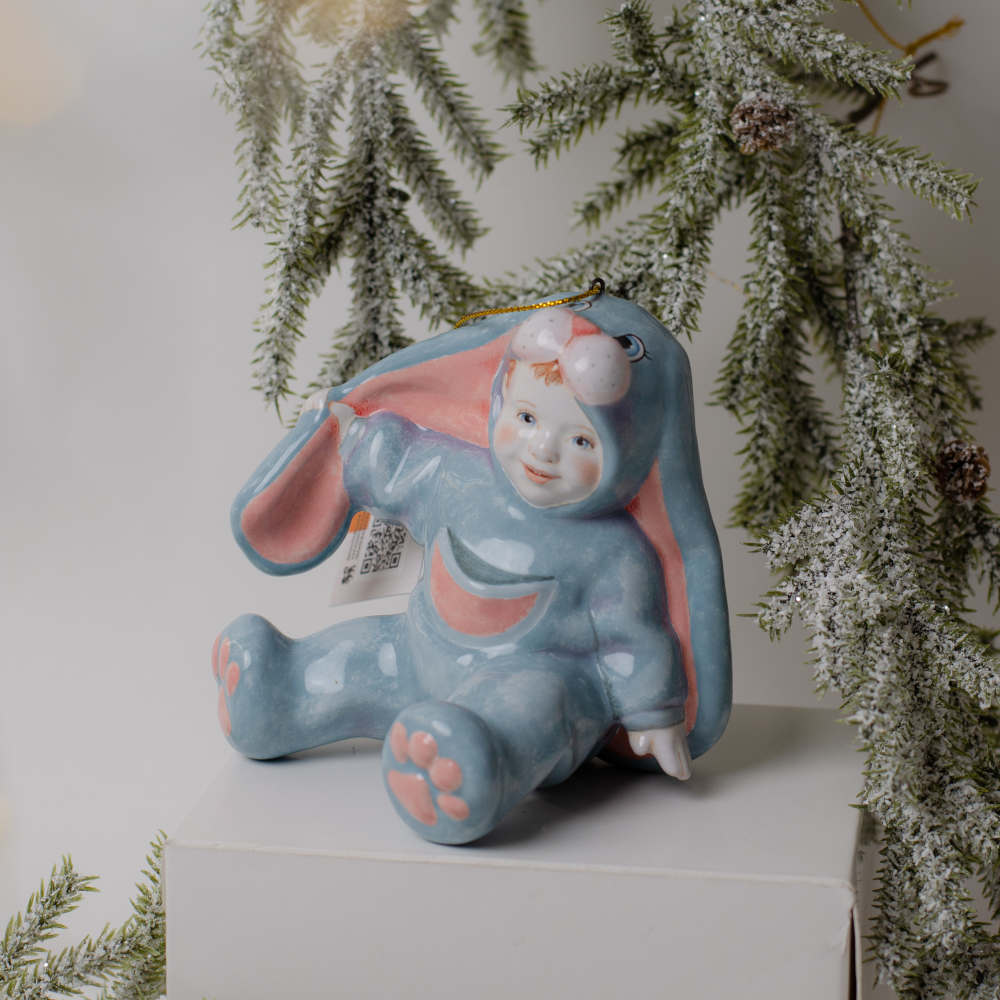 Фигурка “Малыш – зайчонок”, ручной работы и росписи, выполнено в технике майолика и входит в эксклюзивную коллекцию “Малыши”. Карапуз в костюме зайки приглашает вас в мир рождественских праздников. Фигурка расписана мастерски, реалистично переданы тонкие черты детского личика. Пушистый костюмчик с большим кармашком, выполнен с великолепной передачей фактуры. Игрушка станет оригинальным новогодним украшением и год за годом будет дарить вам праздничное настроение. Это прекрасный коллекционный подарок для друзей и близких, который будет приятно передать по наследству. Также вы можете собрать нашу коллекцию елочных игрушек “Детки в костюмах”.