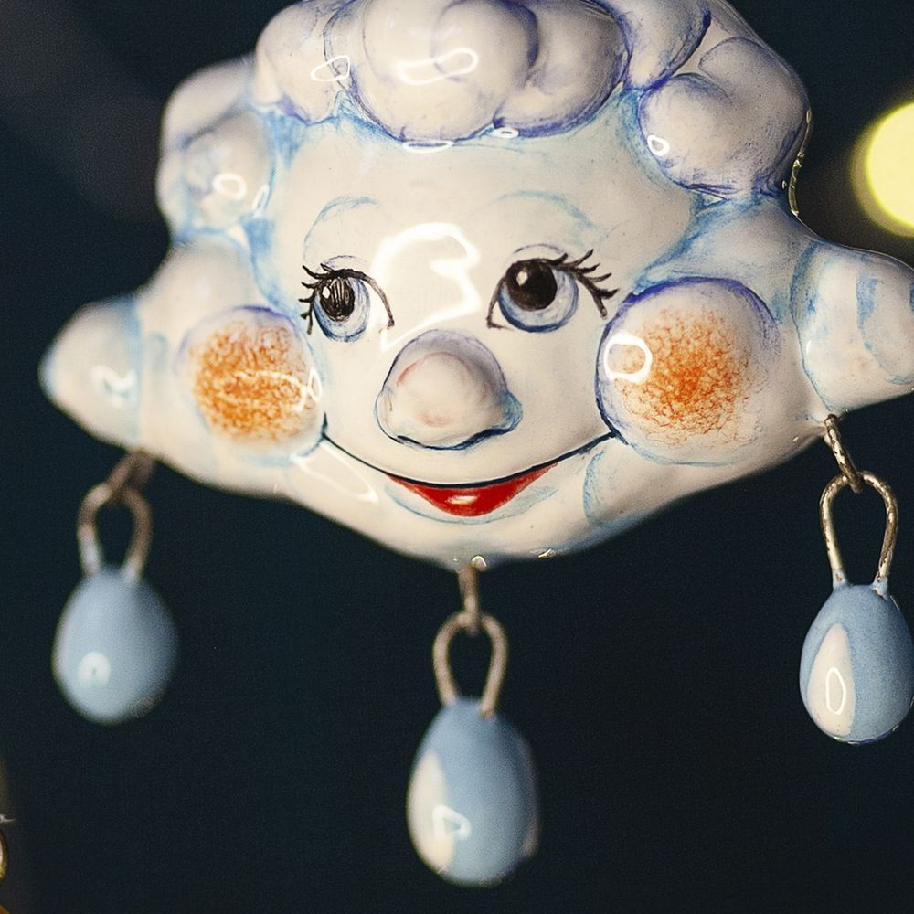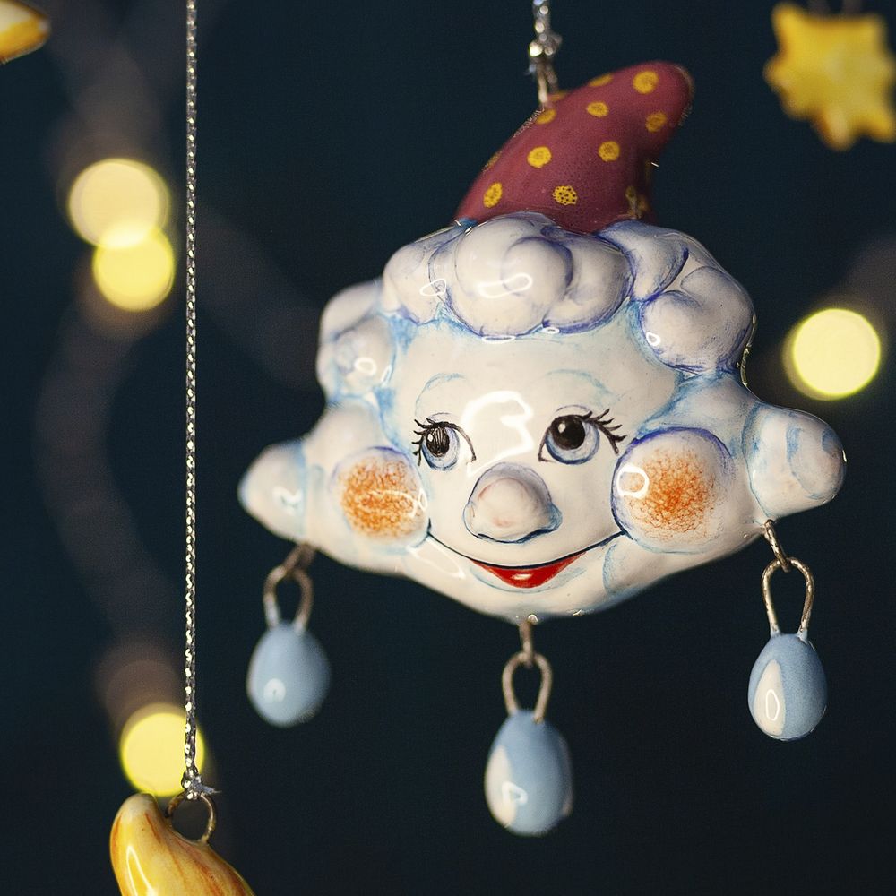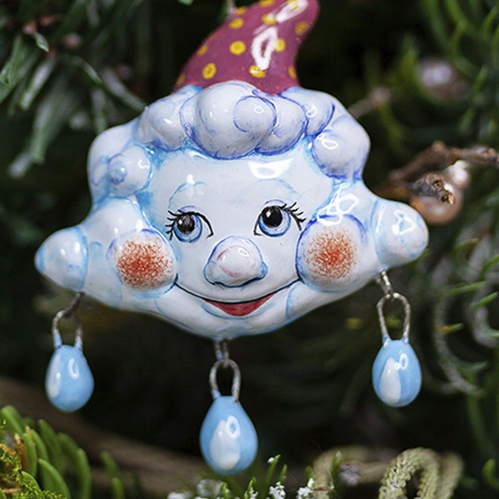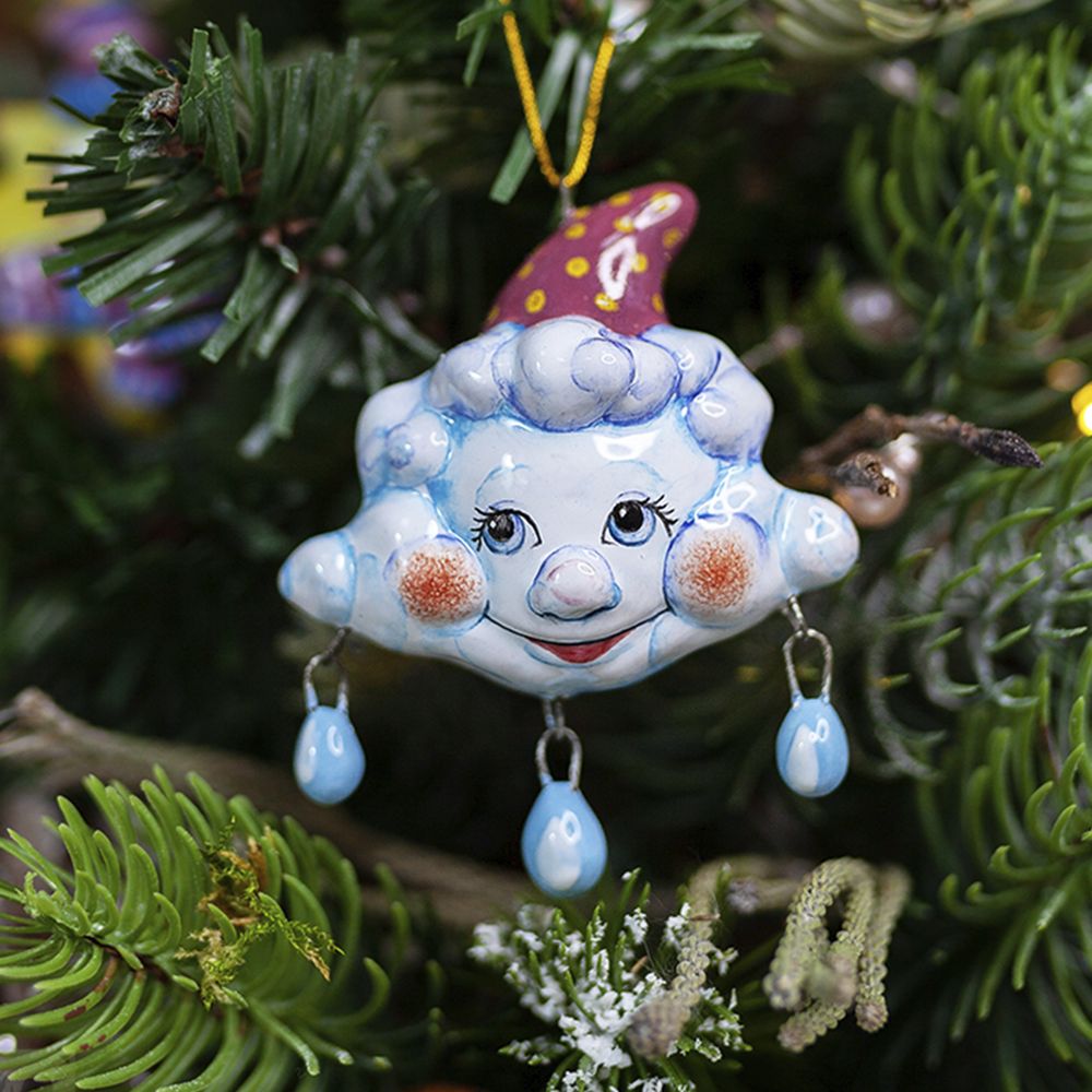 Изделие ручной работы входит в коллекцию «Небесные» и представляет собой фигурку тучки с подвесными капельками. Эта милая игрушка имеет свой характер: перед нами не просто елочное украшение, а настоящая озорная тучка – хулиганка. Изделие расписано с двух сторон, что позволяет ему выразительно смотреться на новогодней елке. Оно также замечательно подойдёт для оформления интерьеров, а ещё будет чудесным подарком.