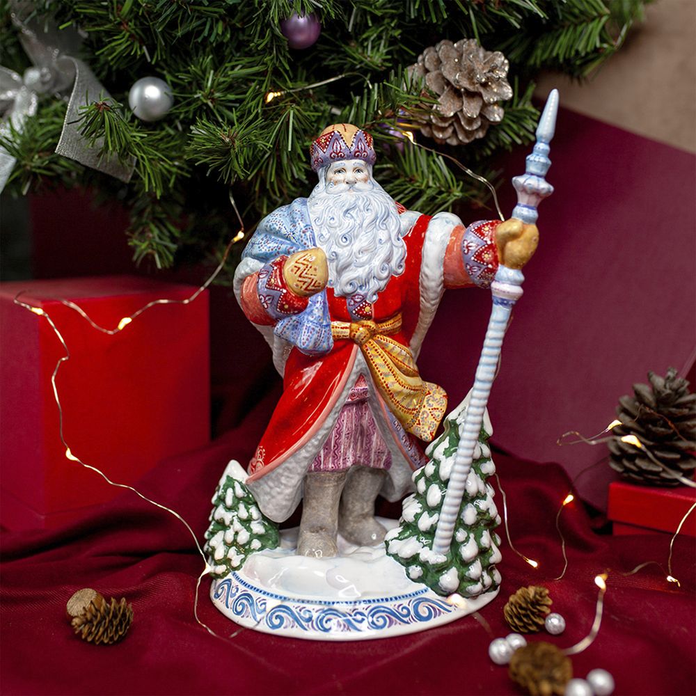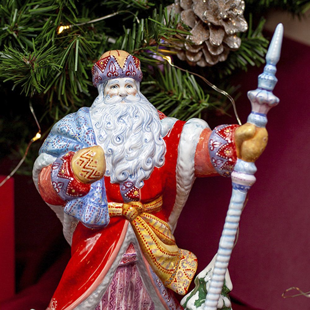 Фигурка ручной работы Дед Мороз входит в коллекцию «Новый год». Наш художник изобразил Деда Мороза в роскошной красной шубе с вышивкой, подпоясанным богатым кушаком. На плече у сказочного персонажа мешок с подарками, в руке волшебный посох. У Деда Мороза длинная белая борода, он легко узнаваем, — его образ сочетается с дарением подарков, веселыми забавами, стихами и танцами. Главный символ праздника, новогодних и рождественских чудес принесет вам радость и обещание зимней сказки. Наш добрый Дед Мороз будет долгожданным гостем в каждом доме, украшением вашей елочной композиции, замечательным подарком вашим друзьям и близким, который сохранит дивные мгновения зимнего торжества на долгие годы.