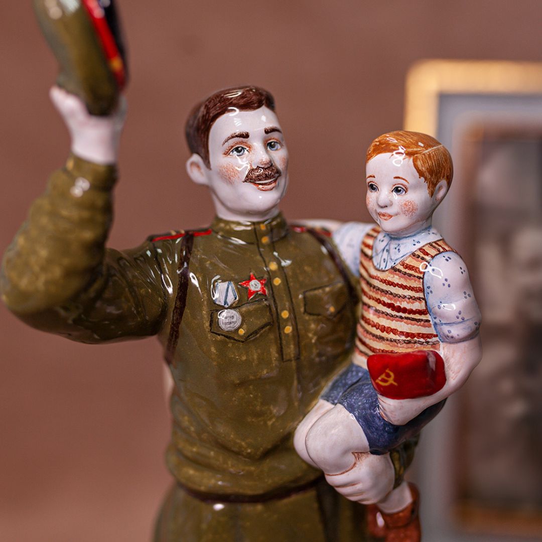 Это изделие ручной работы представляет фигуру солдата с ребенком на руках. Композиция посвящена воинам – защитникам, солдатам, победившим войну, которые стольким детям возвратили детство, подарили радость и весну. Эта композиция – символ самоотверженности, беззаветной храбрости. Она будет выразительным акцентом в интерьере, станет эксклюзивным подарком к Дню Победы и к Дню Защитника Отечества, к дням рождения Ветеранам войны.