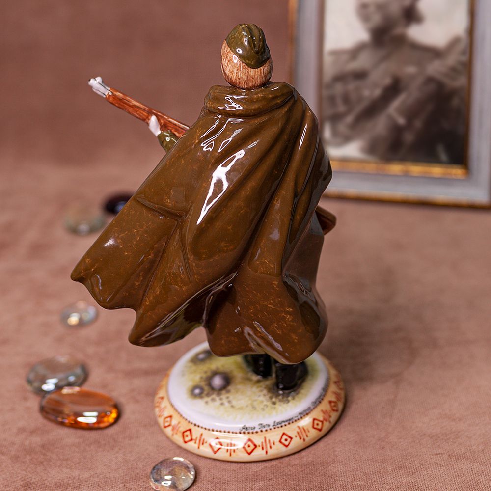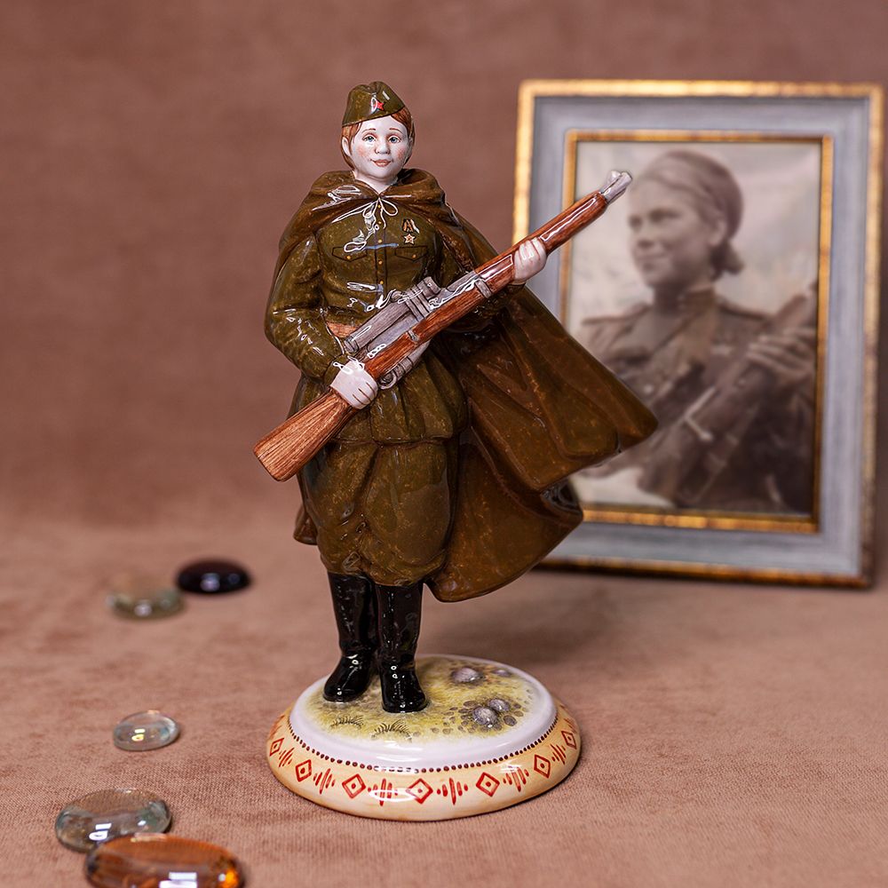Это изделие ручной работы представляет фигуру женщины – снайпера, в пилотке, плащ – палатке с винтовкой в руках. Композиция посвящена сотням тысяч женщин, которые после начала Великой Отечественной войны отправились на фронт и стали грозной силой для противника. Снайпер – одна из наиболее тяжелых военных профессий и в физическом, и в психологическом плане. Но эта не женская воинская специальность была рождена войной, ее суровой необходимостью. Композиция, посвященная солдатам – снайперам, будет выразительным акцентом в интерьере, станет эксклюзивным подарком к Дню Победы и к Дню Защитника Отечества, к дням рождения Ветеранам войны.