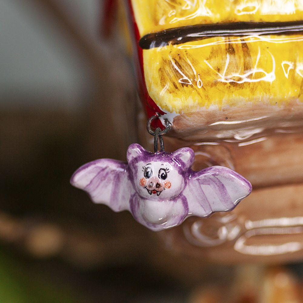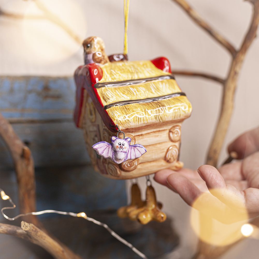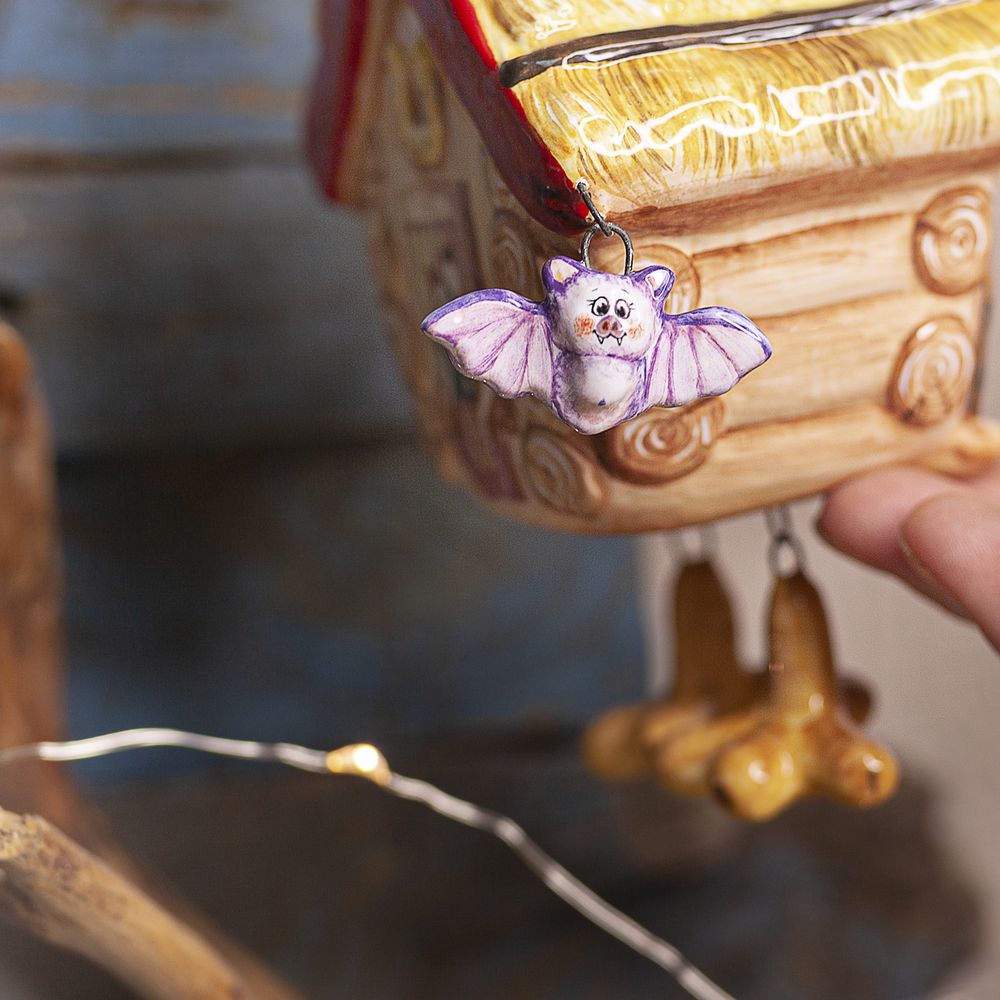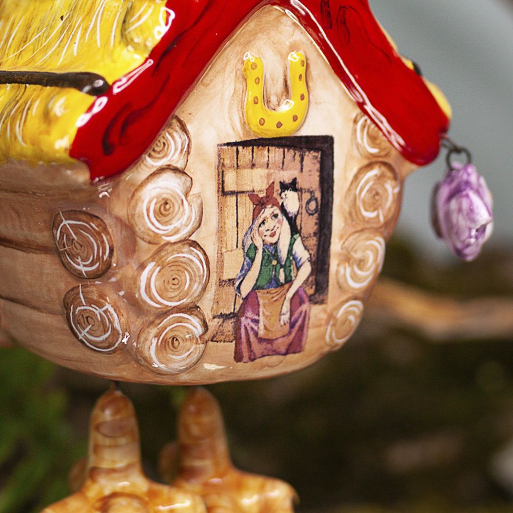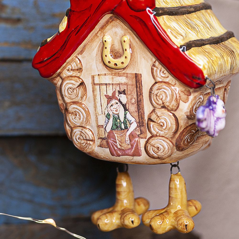 Подвес “Избушка на курьих ножках”, выполнен в технике майолика и украшен ручной художественной росписью. Маленькая избушка приглашает вас в сказочный лес, где чудеса и леший там же бродит, и Баба-яга грустит на крылечке в ожидании своих гусей-лебедей, черный кот рассказывает новости, а филин на крыше внимательно осматривает свои владения. Это яркая и удивительная елочная игрушка, которая станет прекрасным украшением новогодней елки, или любой другой праздничной композиции. Также, это прекрасный подарок к Новому Году и Рождеству, который принесет радость и создаст праздничное настроение и станет замечательным предметом коллекции или подарком для тех, кто ценит уникальность и необычность в интерьере.
