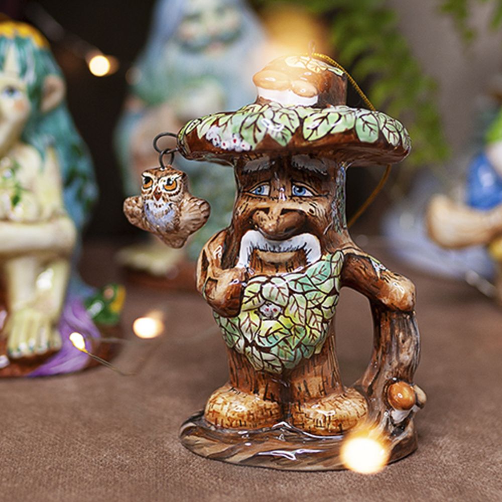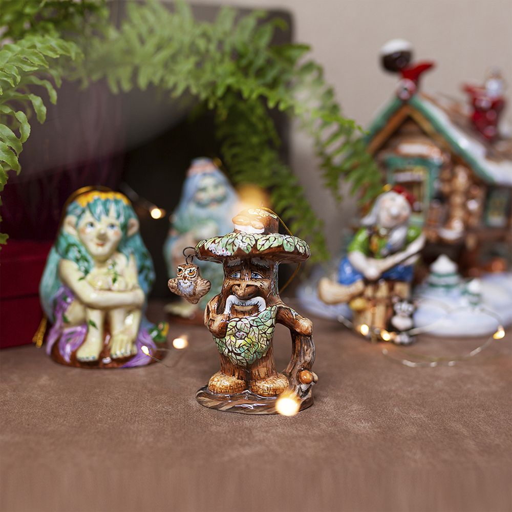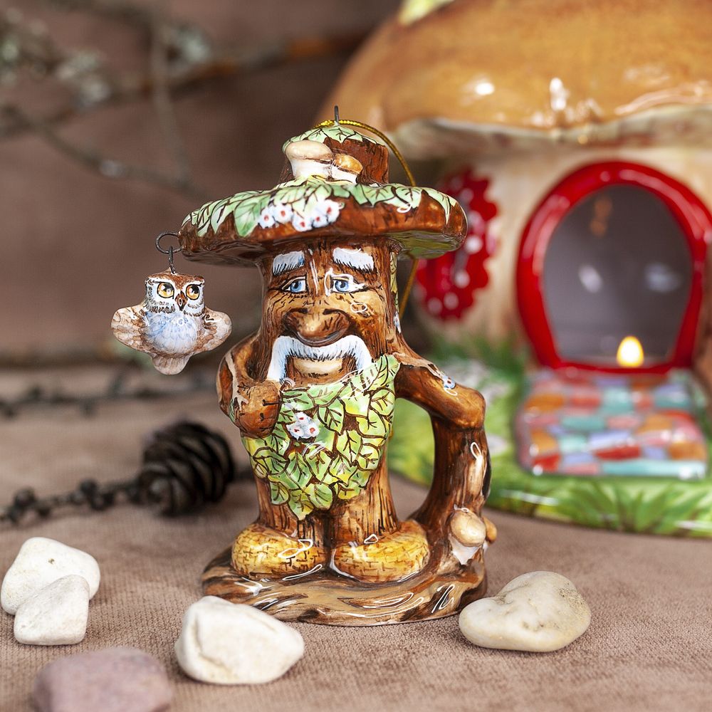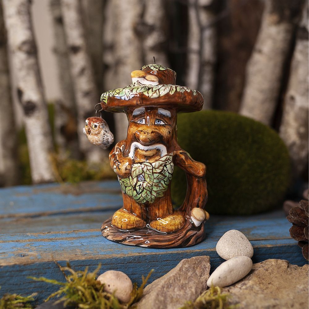Изделие входит в коллекцию Сказки и представляет фигурку большого лесного затейника Лешего, который ради шутки может обернуться в сосну, пень, кочку, грибок и распластаться мхом белым, стать и птицей и зверем. Дух и Хозяин леса, воплощенный в керамике никого не оставит равнодушным. Чудесное изделие для оформления интерьеров, милый подарок, порадует оно любителей сказок и коллекционеров.