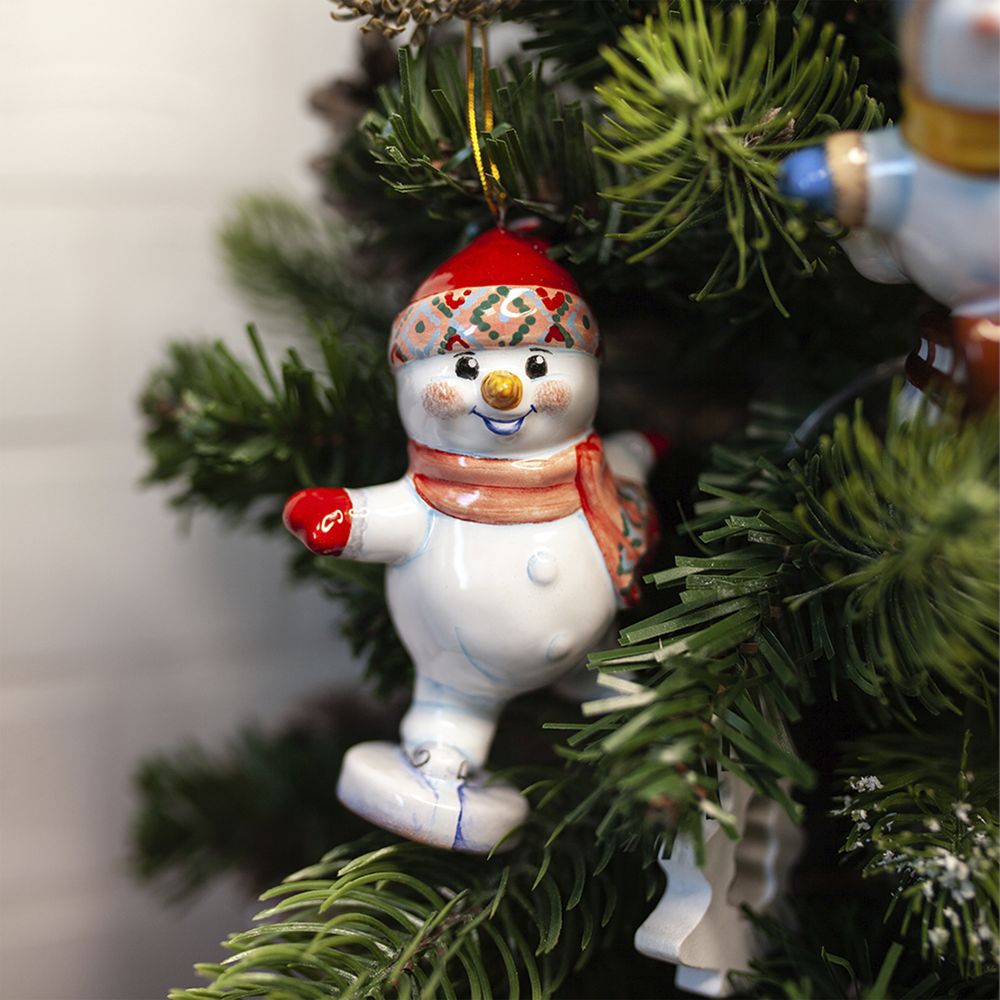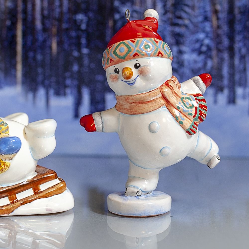 Фигурка “”Снеговик – конькобежец”” изготовлена в технике майолика и украшена ручной росписью. Художником искусно переданы эмоции малыша, радость от зимних приключений и восторг на лице, это придает игрушке непосредственность и яркость. Такая фигурка станет чудесным украшением для новогодней елки и милым подарком для всех любителей ручной работы и оригинальных новогодних украшений.”””