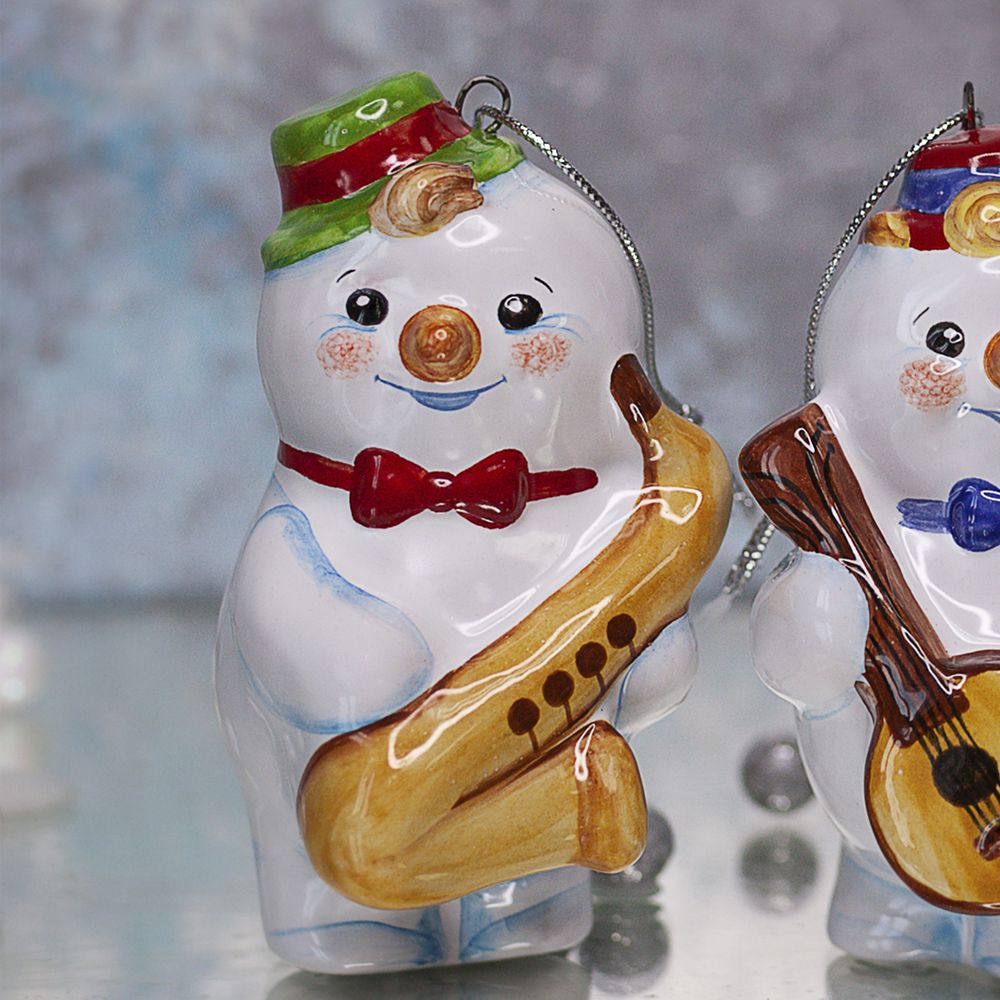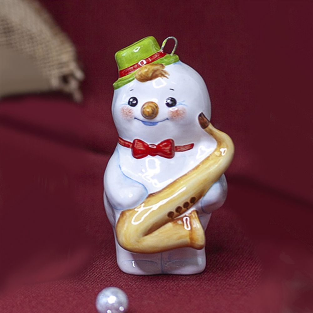 Фигурка “”Снеговик-музыкант с саксофоном”” изготовлена в технике майолика, украшенная ручной художественной росписью и входит в коллекцию “”Снеговички – музыканты””. Яркая экстравагантная шляпа, красный галстук-бабочка и микрофон в руке придают изделию выразительный вид. Такой снеговичок будет оригинально смотреться на новогодней ёлочке или в рождественской интерьерной композиции и станет отличным подарком для близких и любителей музыки.”