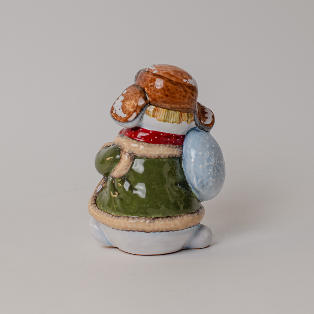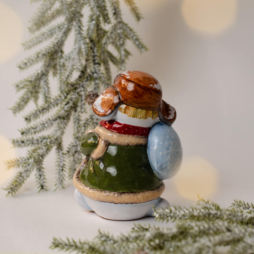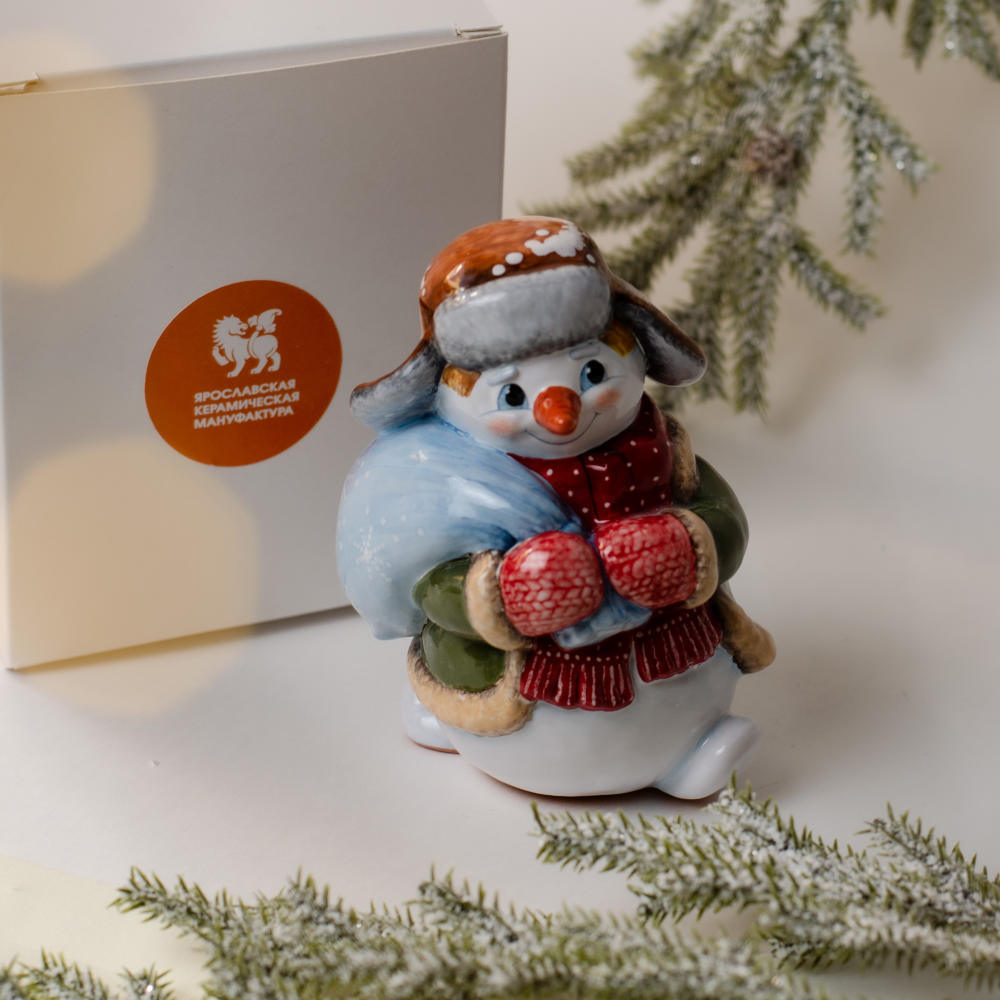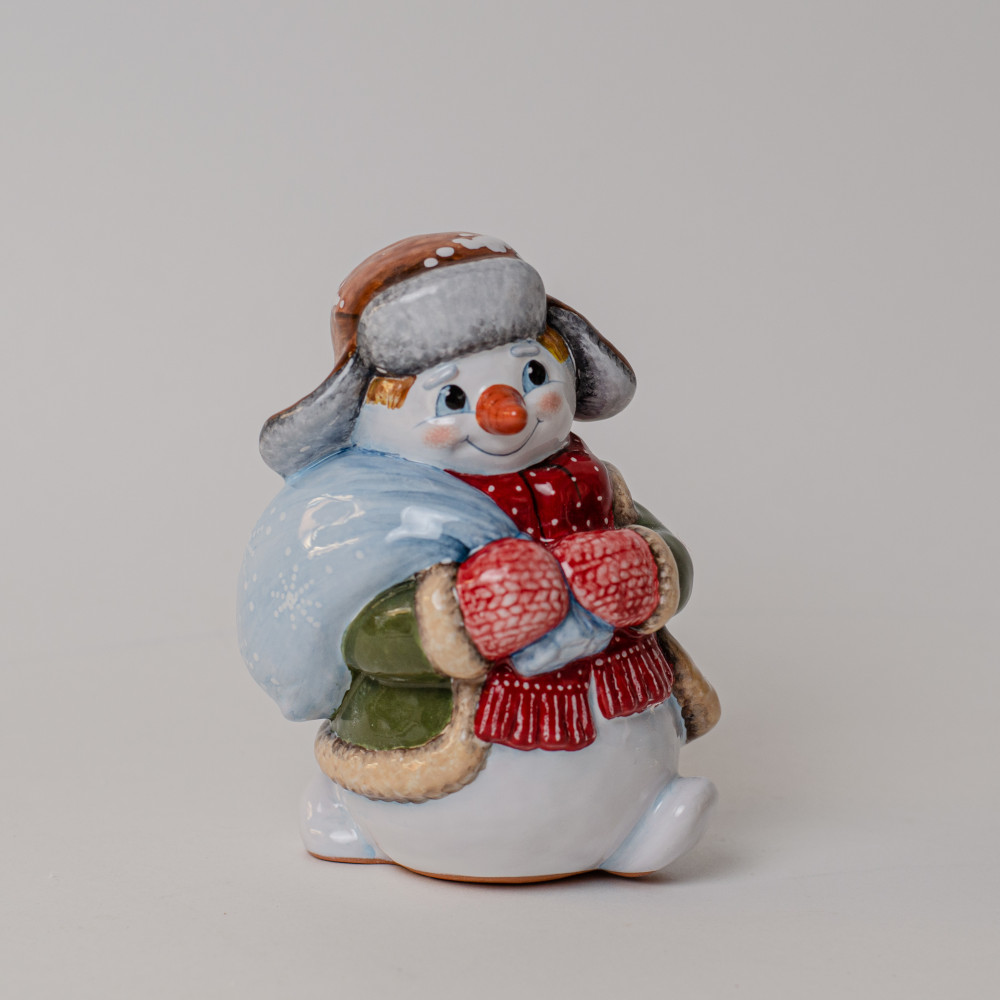 Фигурка “Снеговик с мешком подарков” выполнена в технике майолика и украшена ручной художественной росписью.