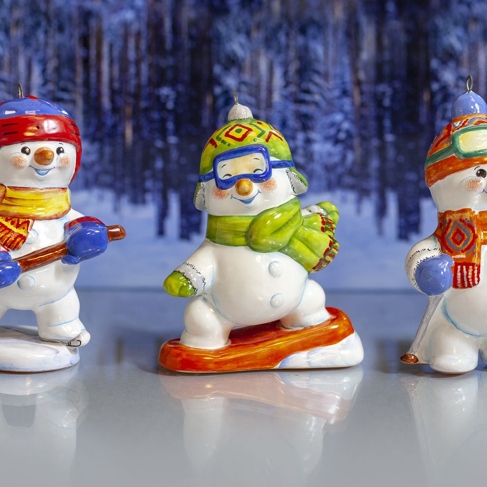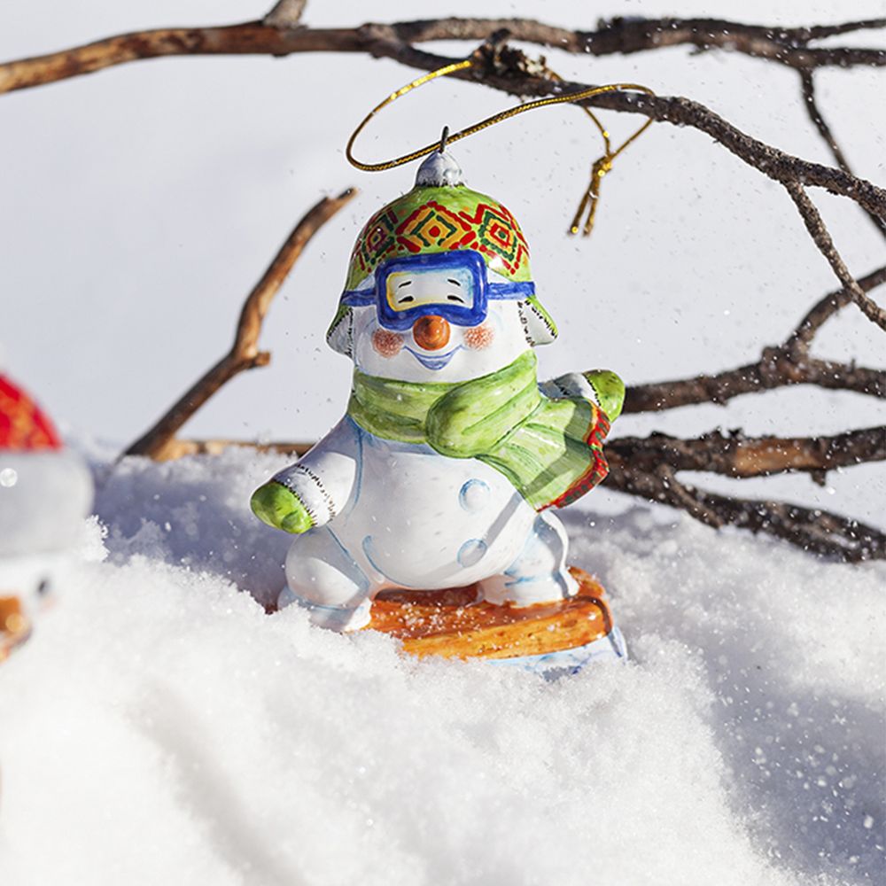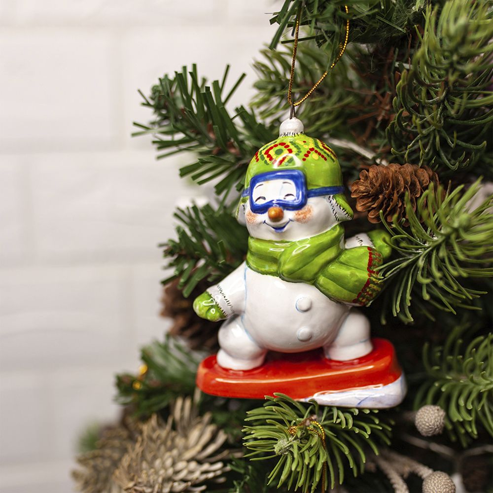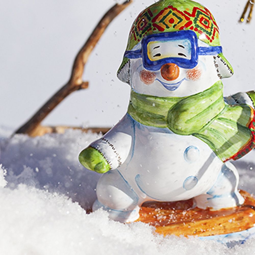 Фигурка “Снеговик-сноубордист” изготовлена в технике майолика и украшена ручной росписью. Художником искусно переданы эмоции маленького спортсмена, что придает игрушке непосредственность и яркость. Такая фигурка станет чудесным украшением для новогодней елки, милым подарком для всех любителей ручной работы и оригинальных новогодних украшений.