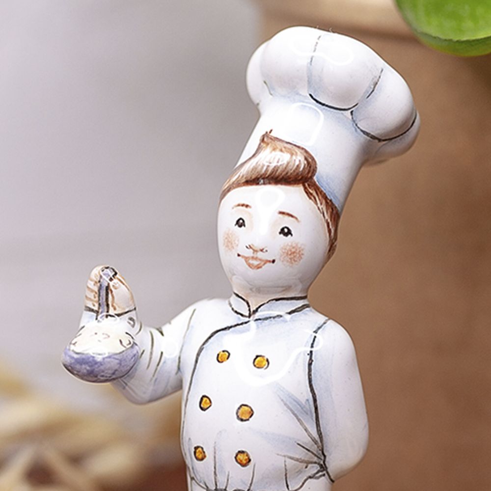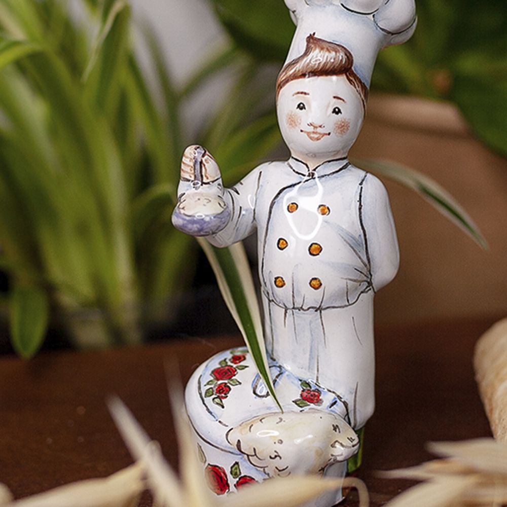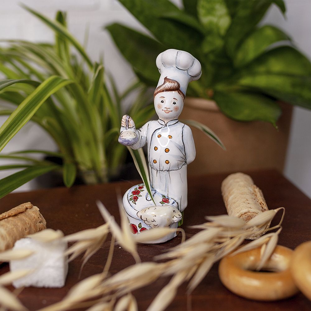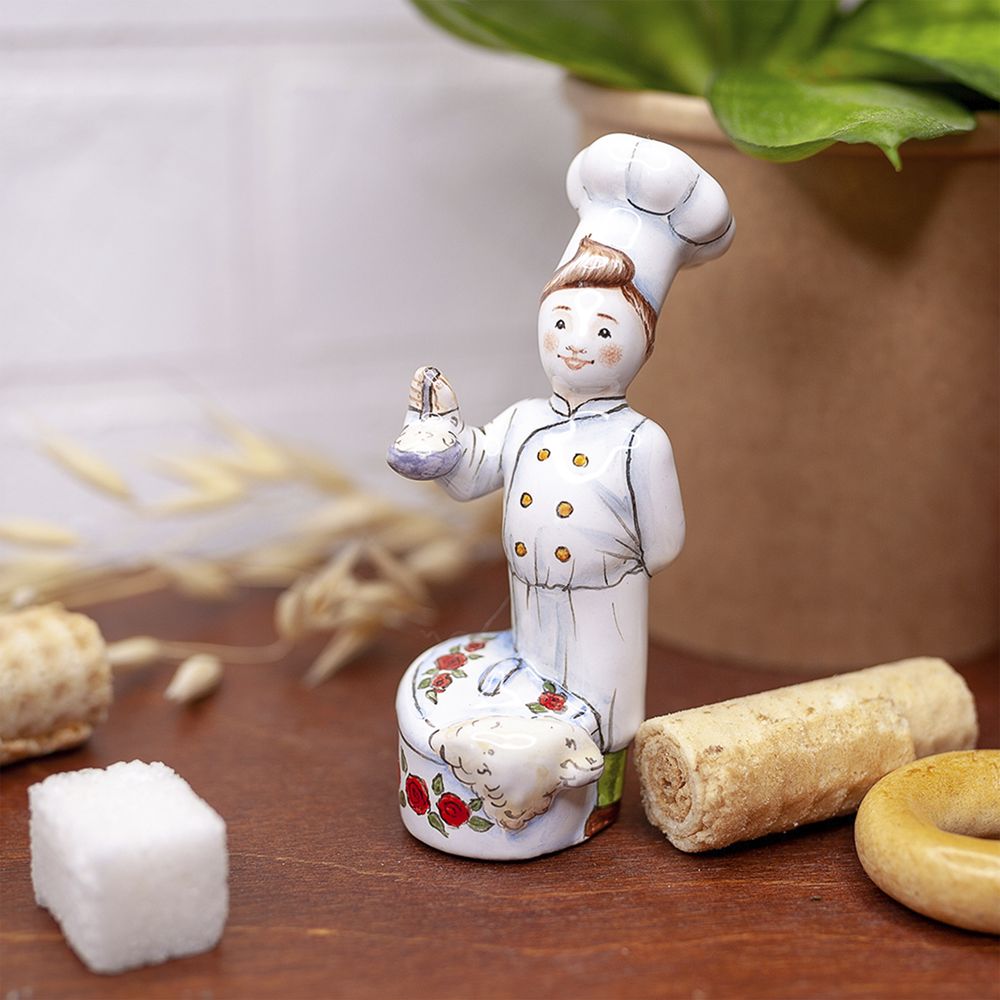Это изделие ручной работы входит в коллекцию “Выбор профессии”. Повар – это не просто специалист по приготовлению пищи, хорошего повара называют волшебником, ведь он может из самых обычных продуктов приготовить настоящий шедевр, который доставит радость и наслаждение. Наш поваренок станет желанным подарком вне возраста. Наши художники вложили самые благородные и светлые чувства в этот сувенир. Пусть этот подарок порадует поваров и кондитеров, поможет выразить благодарность профессионалам. Данное изделие подойдет для оформления интерьеров ресторанов, баров и кафе, также будет интересен и коллекционерам.