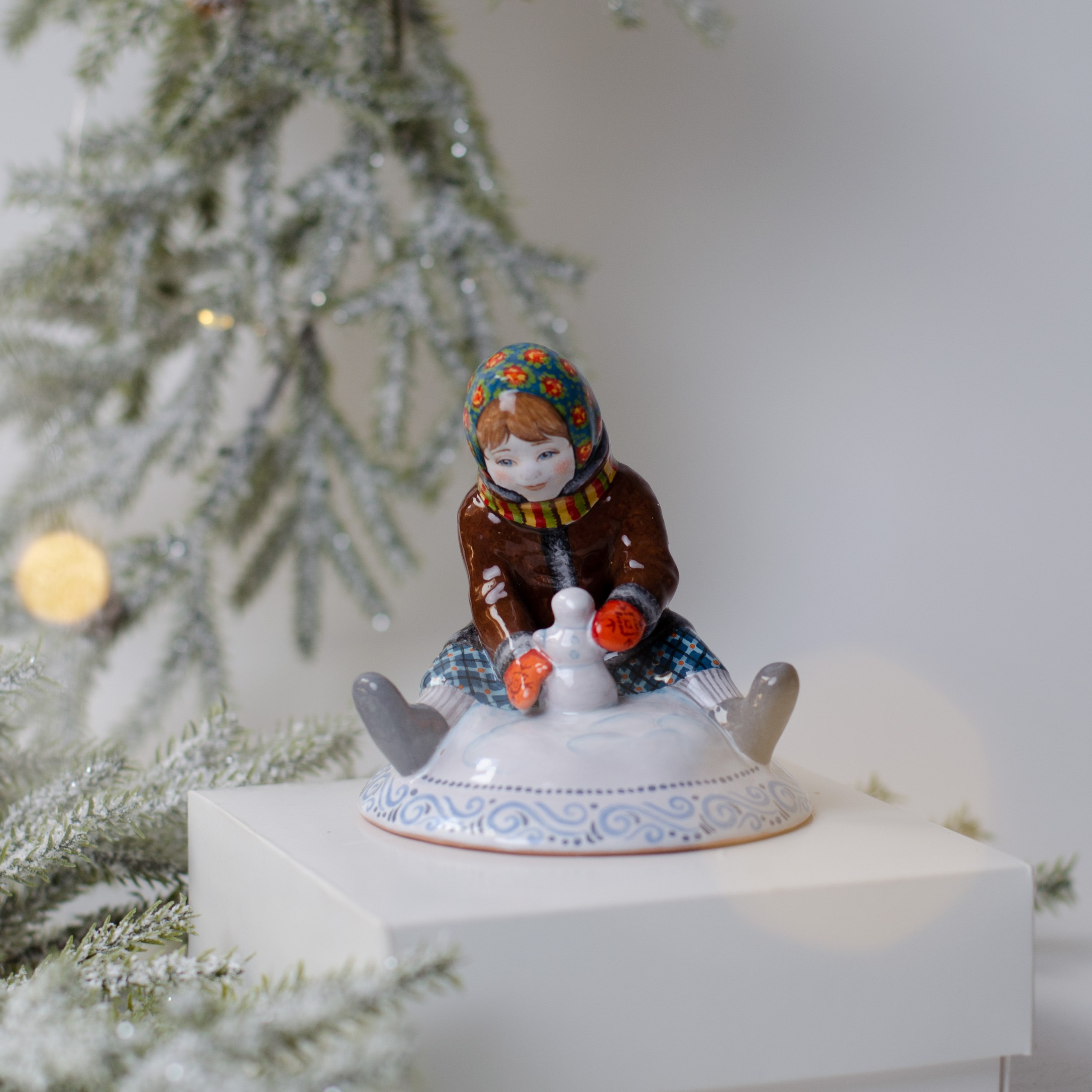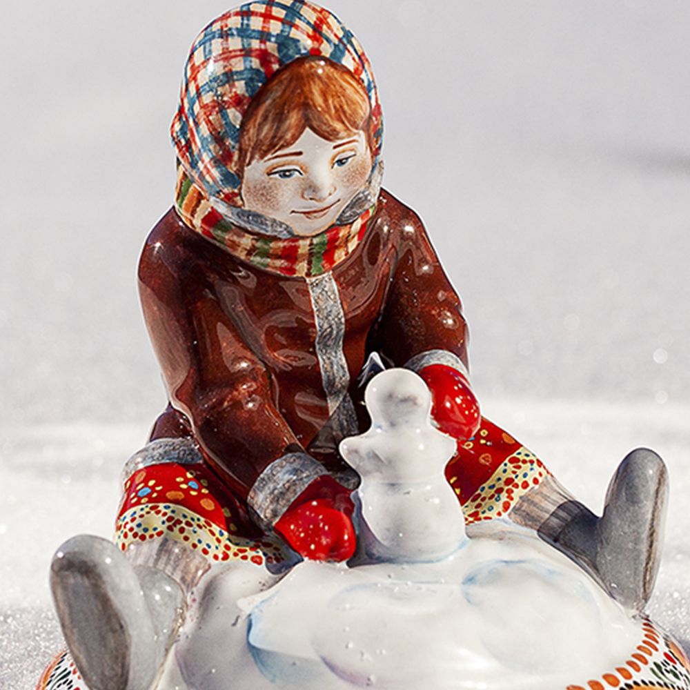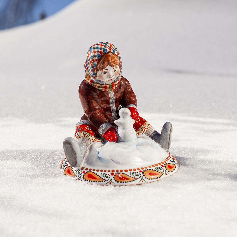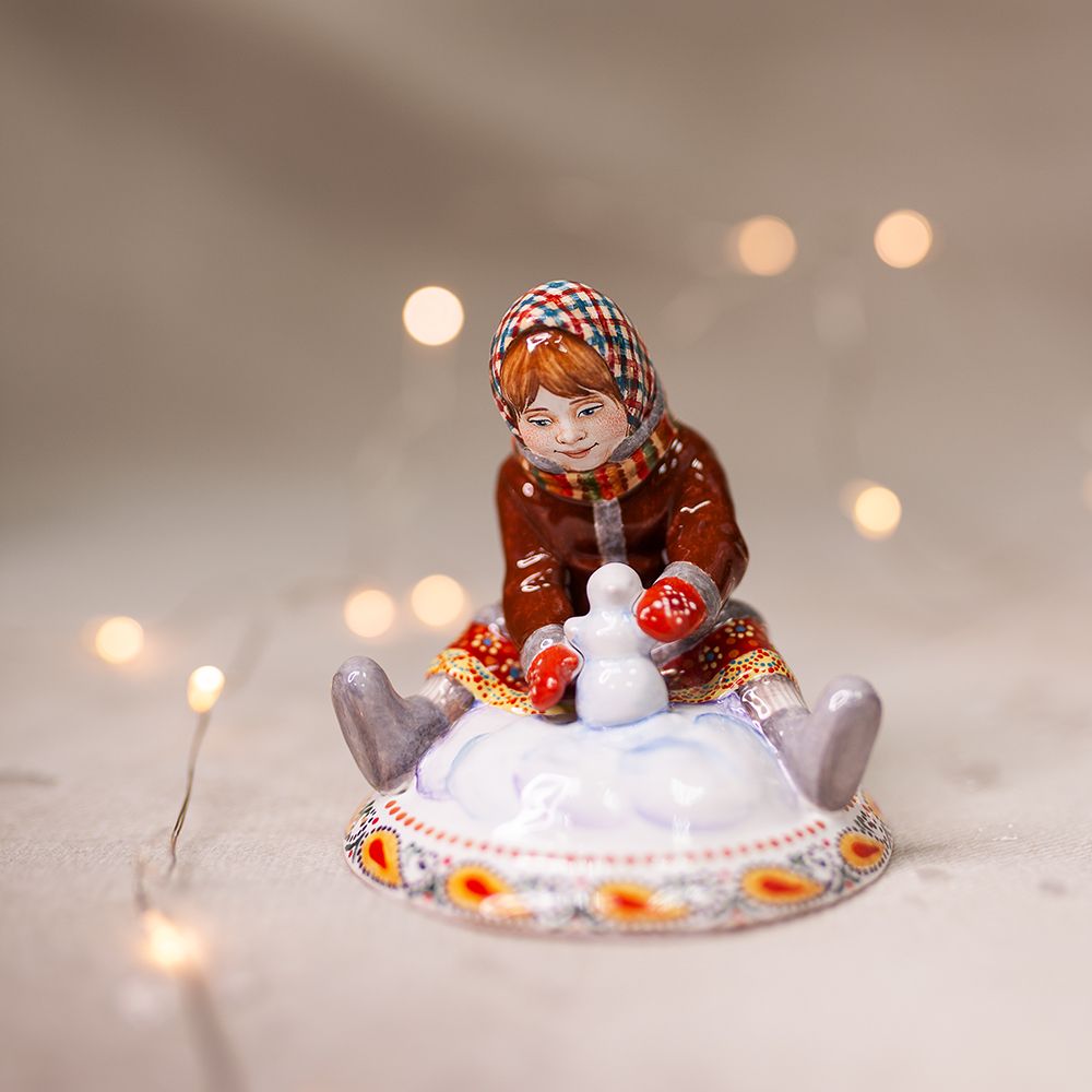 Эксклюзивное изделие ручной работы входит в коллекцию “Зимние игры и представляет собой целый сюжет. Перед нами малышка, которая сидя на снегу с радостью лепит маленького снеговичка. Художником талантливо прописаны черты лица малышки, поза, отражены эмоции. Это изумительное изделие – настоящий высокохудожественный предмет интерьера. Оно станет подлинным украшением Вашей семейной коллекции и преобразит Ваш дом на долгие годы. Данное изделие – это ещё и удивительной красоты подарок!