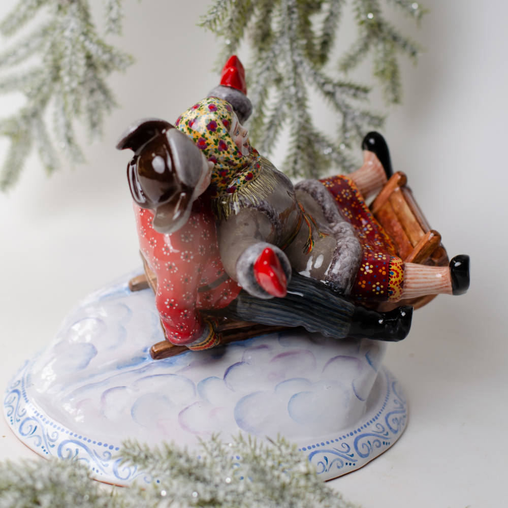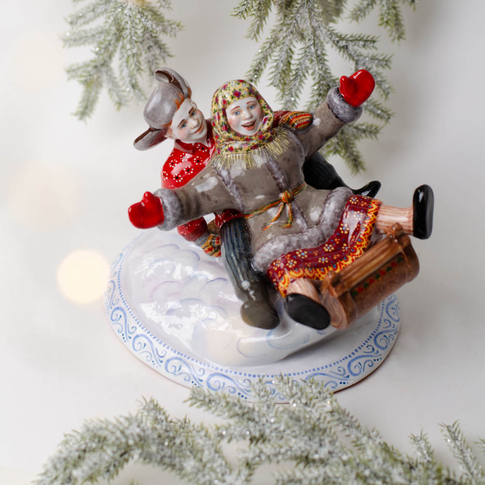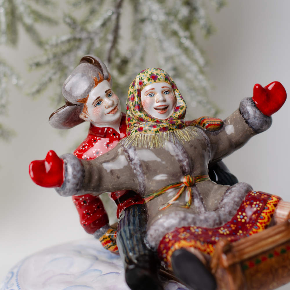 Эксклюзивное изделие ручной работы входит в коллекцию “Зимние игры” и представляет собой целый сюжет. Не зря коллекция называется зимние игры, художник искусно изобразил образы счастливых детей, несущихся на санках с горы, талантливо передал их настроение. Такая изумительная композиция будет замечательно смотреться в интерьере, станет запоминающимся подарком к Новому году и Рождеству, принесёт радость, создаст настроение и позитивный настрой, порадует коллекционеров.
