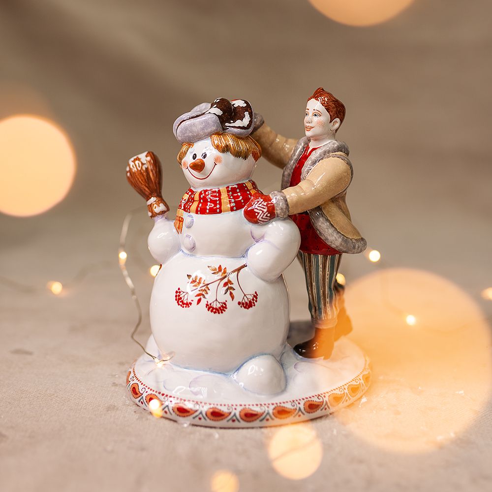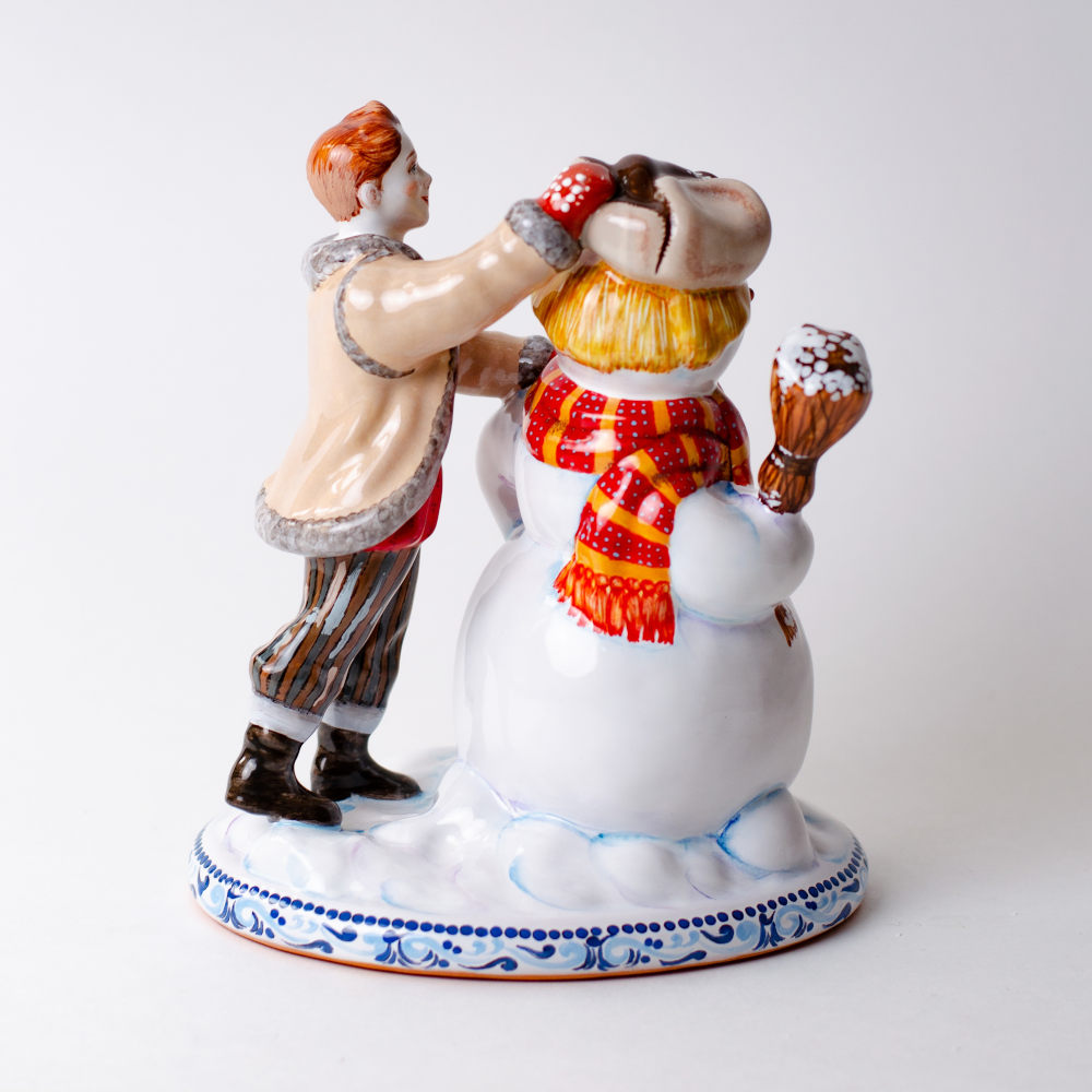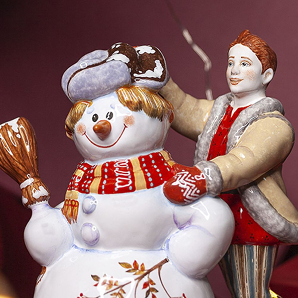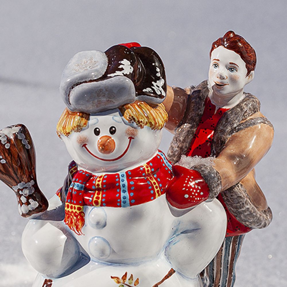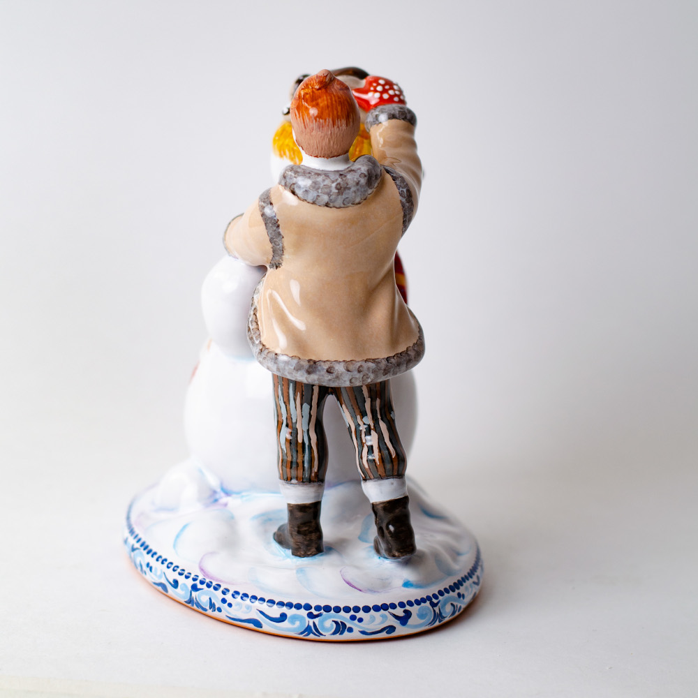 Фигурка “Мальчик и снеговик” выполнена в технике майолика, украшена ручной художественной росписью и входит в коллекцию “Зимние игры”. В сюжете представлен мальчик, который с восторгом лепит снеговика. Каждая деталь выполнена художником с особой тщательностью, что неизменно покорит сердце любого коллекционера изделий из керамики. Эта композиция станет эксклюзивным подарком к Новому году и Рождеству, украсит собой интерьер и создаст в доме радостную, праздничную атмосферу.