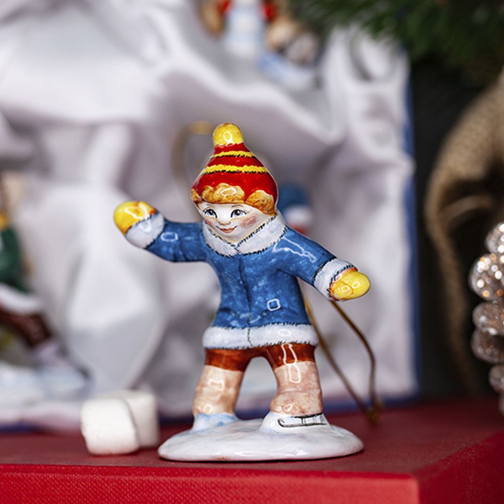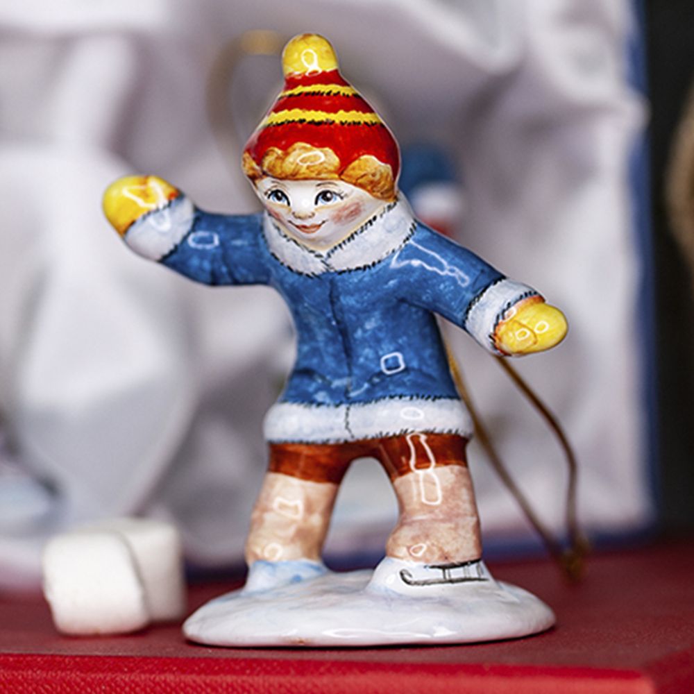 Эксклюзивное изделие ручной работы входит в коллекцию “Зимние забавы” и представляет собой целый сюжет. Зима – время веселых игр и забав, самое время встать на коньки и прокатиться по тонкому льду. Художником искусно переданы движения и эмоции ребенка. Эта замечательная игрушка будет прекрасно смотреться на новогодней елочке, станет запоминающимся подарком к Новому году и Рождеству, принесёт радость, создаст настроение и позитивный настрой, порадует коллекционеров.