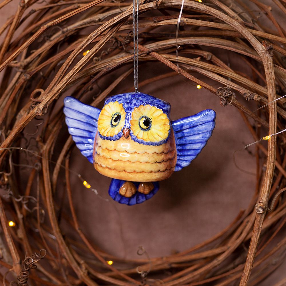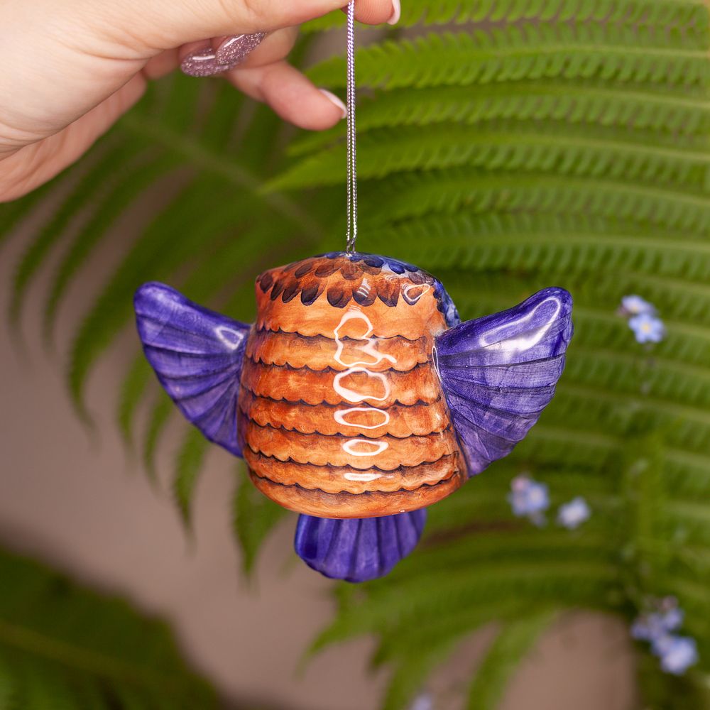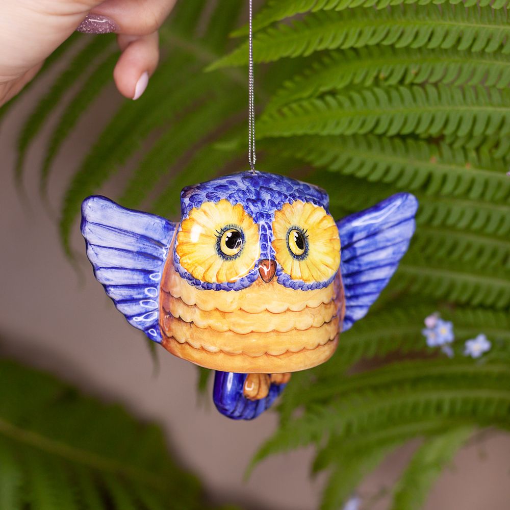 Колокол ручной работы выполнен в виде изумительной фигурки мудрой совы с распахнутыми крыльями и с хвостиком – бомбошкой. Звучание керамических колокольчиков неповторимо, по фэншуй колокольчики являются «ловцами» потоков воздуха, притягивают достаток, успех, создают положительную энергетику. Данное изделие оценят все, кто любит свой дом, уют, искусство, он будет замечательным подарком на все случаи жизни.