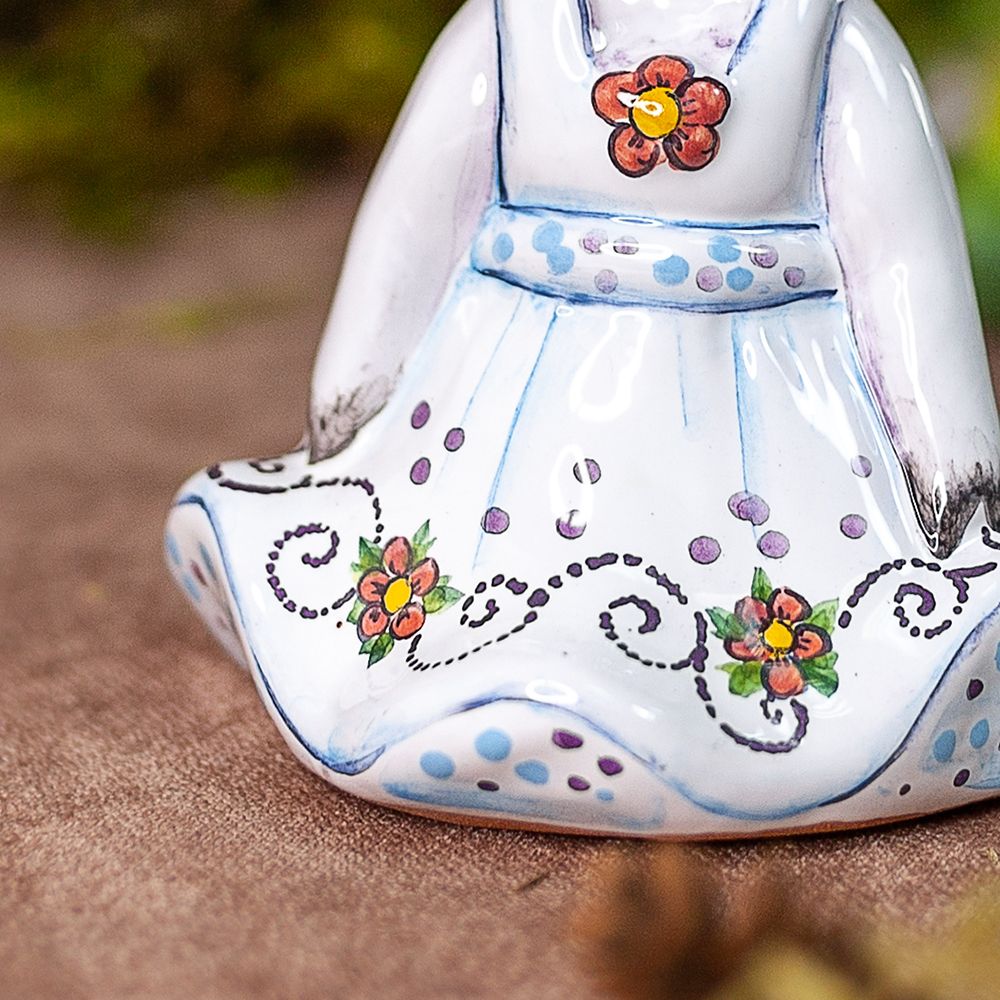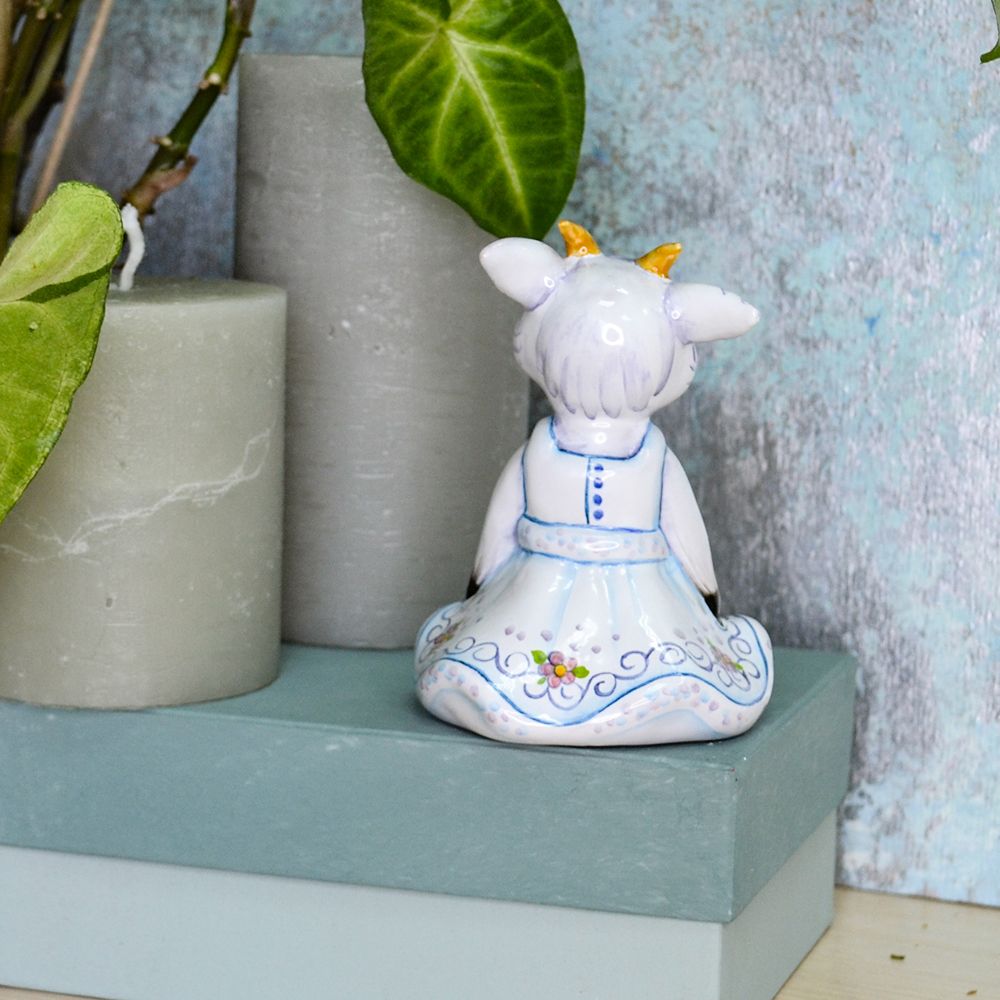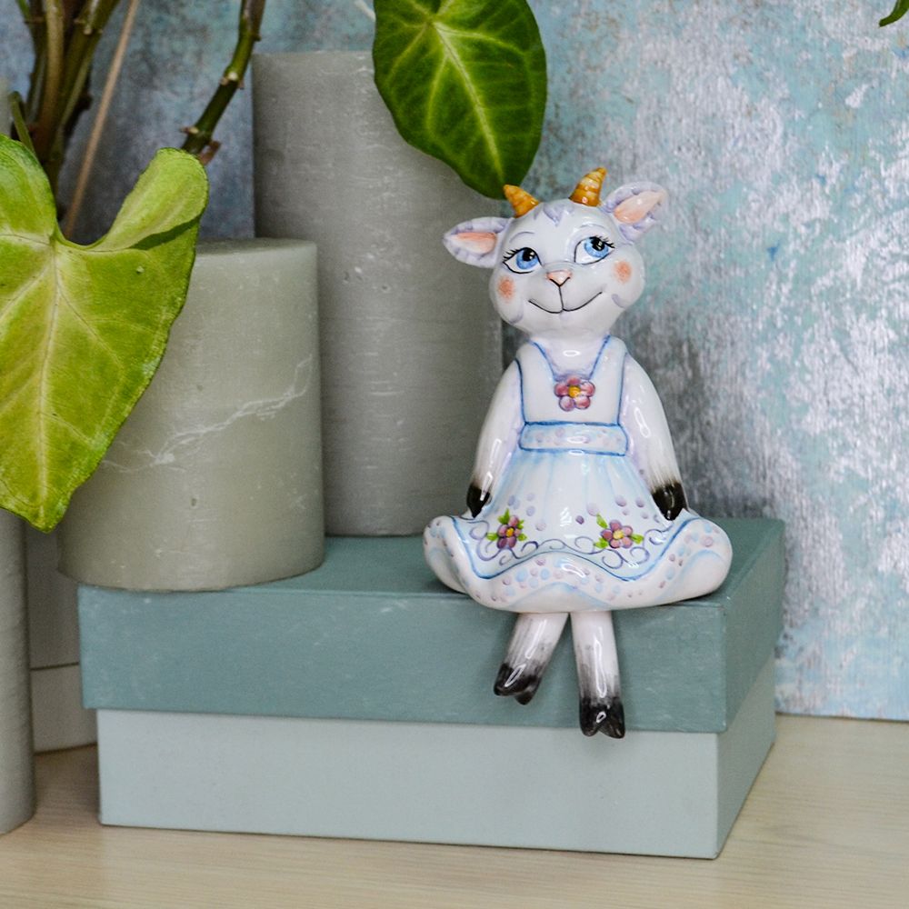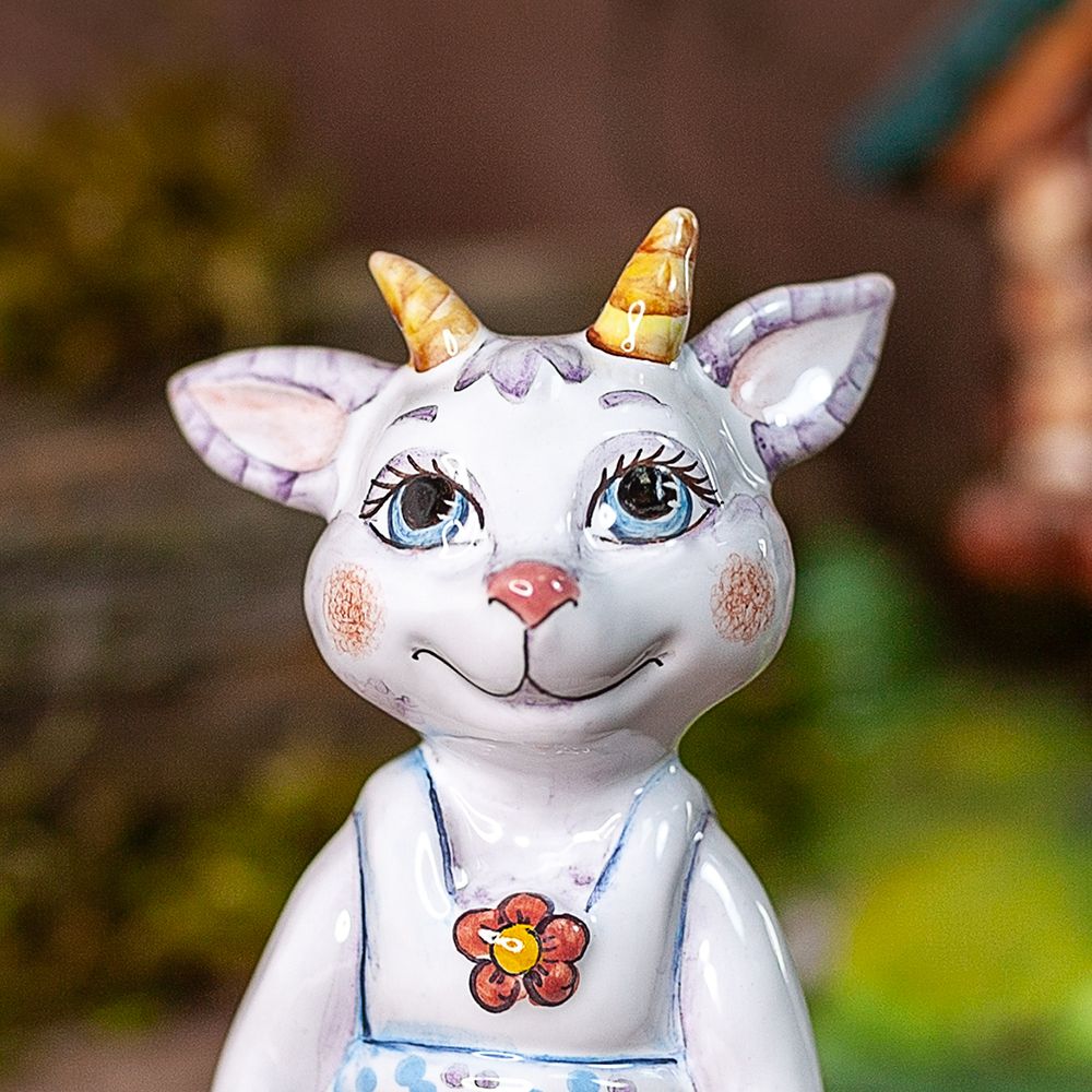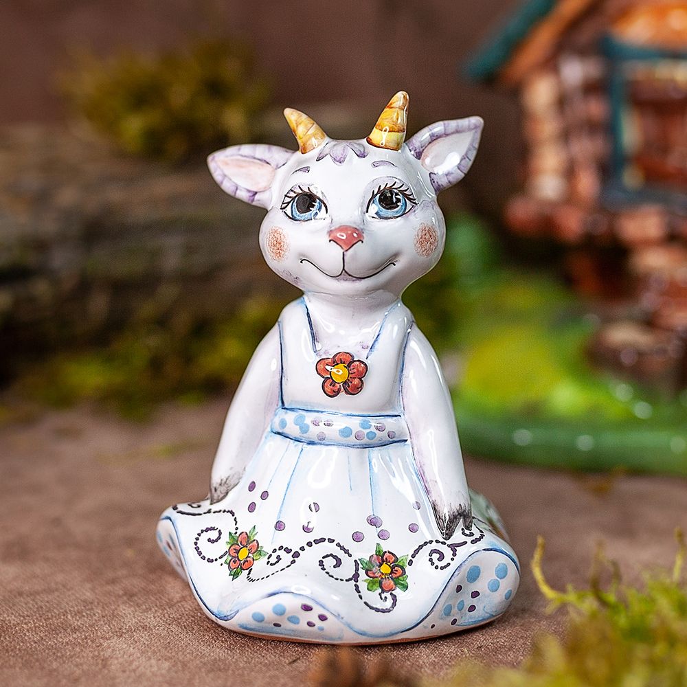 Колокол ручной работы выполнен в виде фигурки обаятельной козочки в сарафане, с ножками – бамбошками. Звучание керамических колокольчиков неповторимо, по фэншуй колокольчики являются «ловцами» потоков воздуха, притягивают достаток, успех, создают положительную энергетику. Данное изделие оценят все, кто любит свой дом, уют, искусство, он будет замечательным подарком на все случаи жизни.