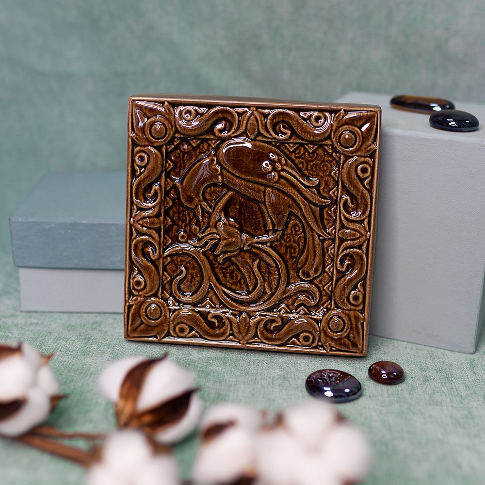 Изделие представляет керамический рельефный элемент квадратной формы, покрытый коричневой глазурью, на котором нанесено стилизованное изображение птицы, которая пьёт нектар из цветка. По фен шуй птицы символизируют новые возможности. Символы птиц, так же как и символы-цветы обладают внутренней универсальной энергией, приносят в дом удачу, процветание, благополучие и достаток. Выбранный цвет изразца придает дополнительную смысловую нагрузку изделию, поскольку коричневый цвет также символизирует плодородие, а ещё – основательность, устойчивость и стабильность. Данное изделие может быть использовано как изразец, и как самостоятельный настенный декор. При этом смотрится стильно и эффектно, может использоваться в местах, где фантазия архитектора или дизайнера по интерьеру не ограничивается типовым решением, он позволяет сделать акцент, привлекающий взгляд, внести завораживающую изюминку в интерьер. Изразец также будет прекрасным подарком родным, близким, коллегам по работе.