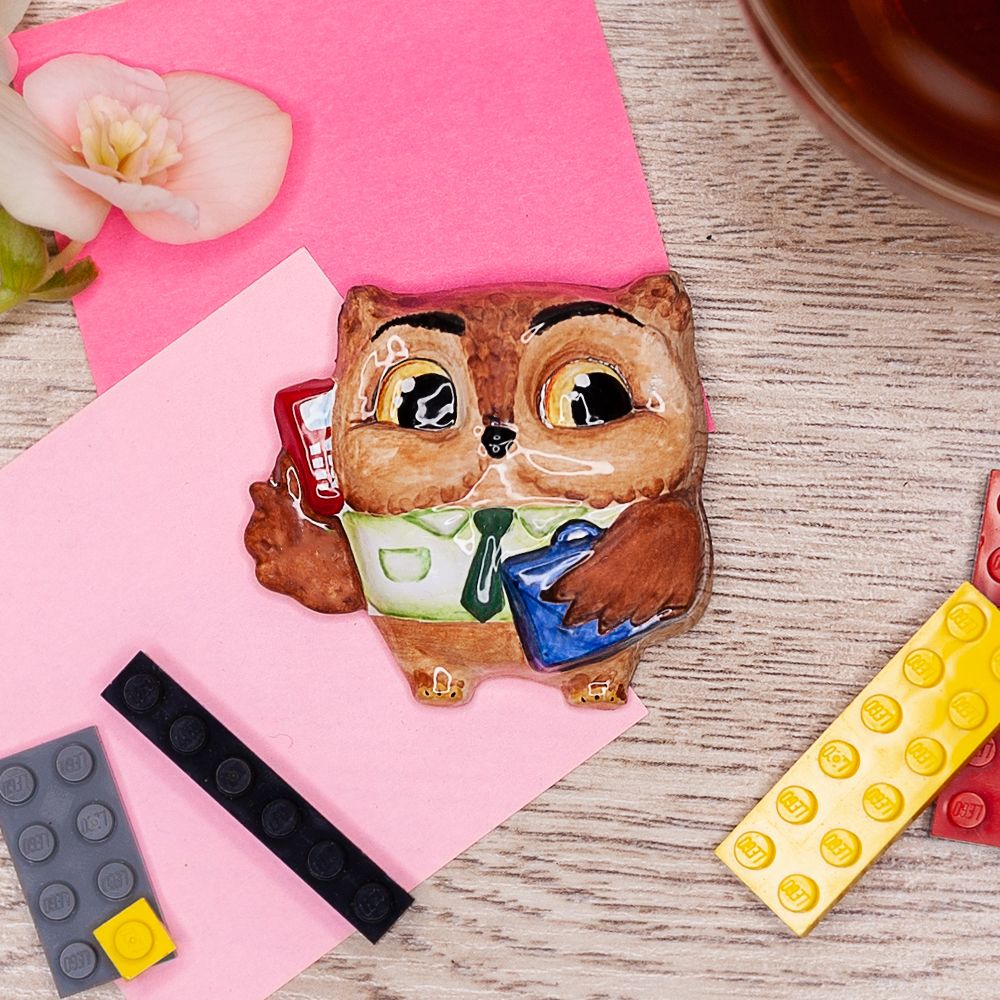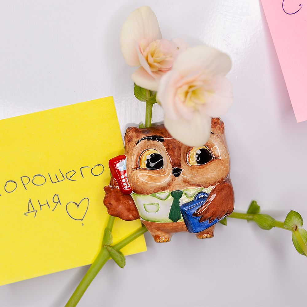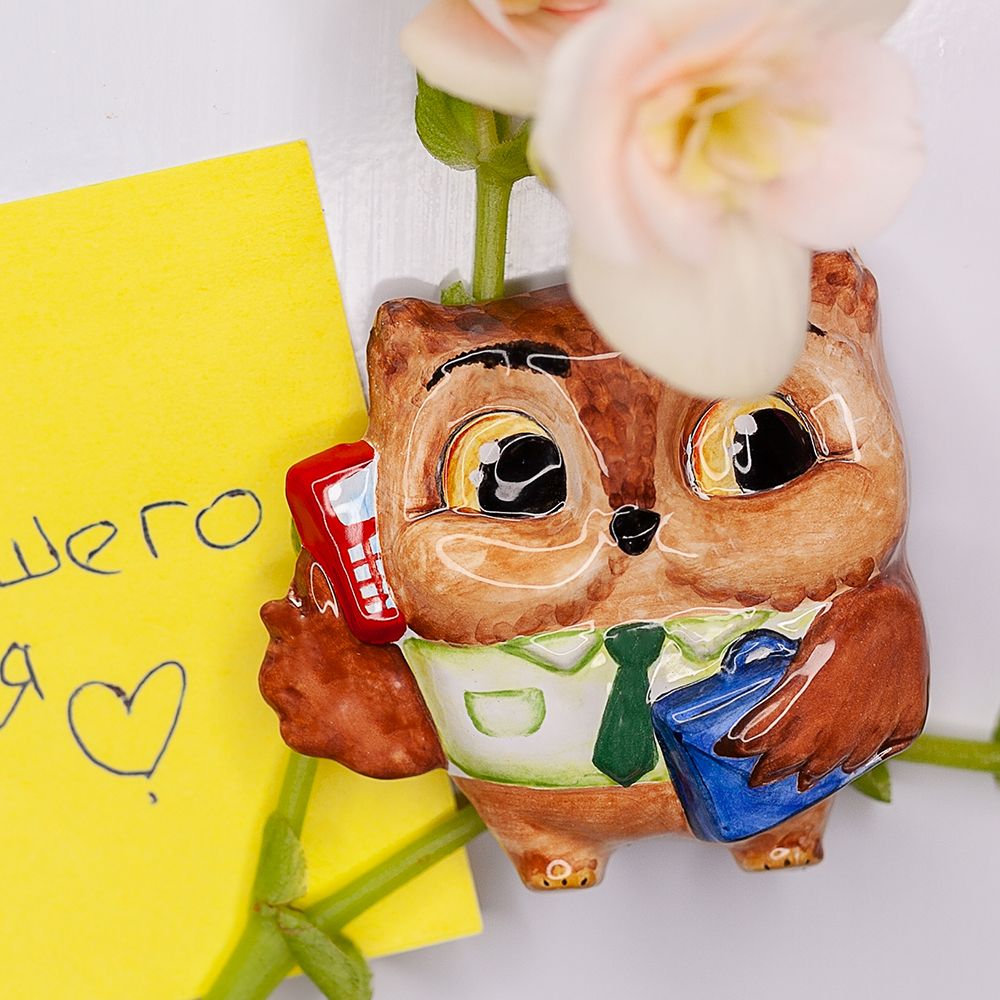 Изделие ручной работы представляет элемент декора, сувенир на магнитной основе, выполненный в виде плоской фигурки филина в рубашке с галстуком, с портфелем, который ведет деловые переговору по сотовому телефону. Данное изделие украсит интерьер, будет замечательным подарком на все случаи жизни.