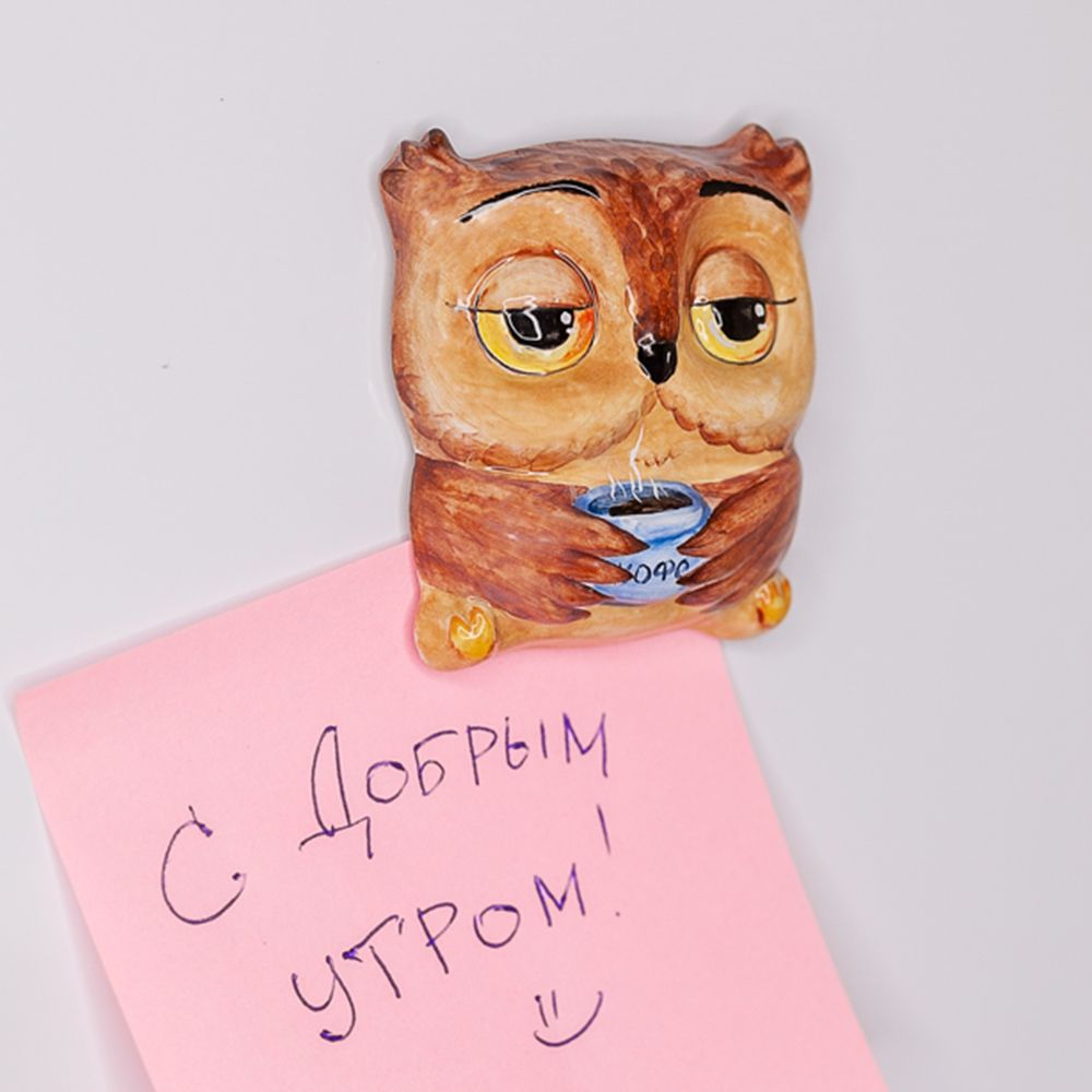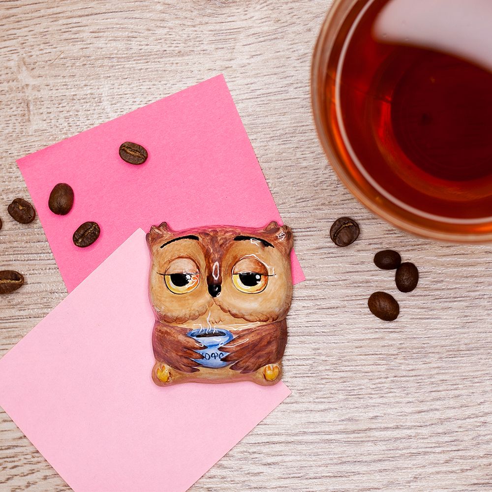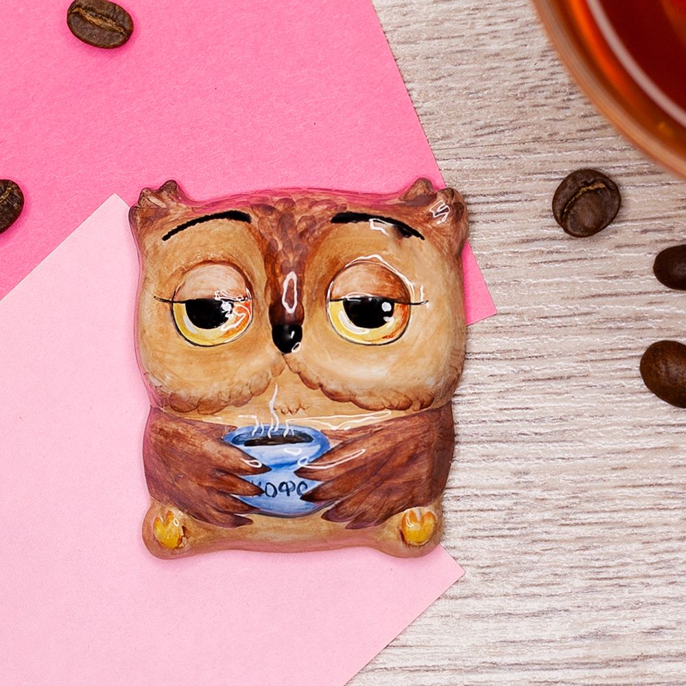 Изделие ручной работы представляет элемент декора, сувенир на магнитной основе, выполненный в виде плоской фигурки филина, наслаждающегося горячим кофе. Данное изделие украсит интерьер, будет замечательным подарком на все случаи жизни.