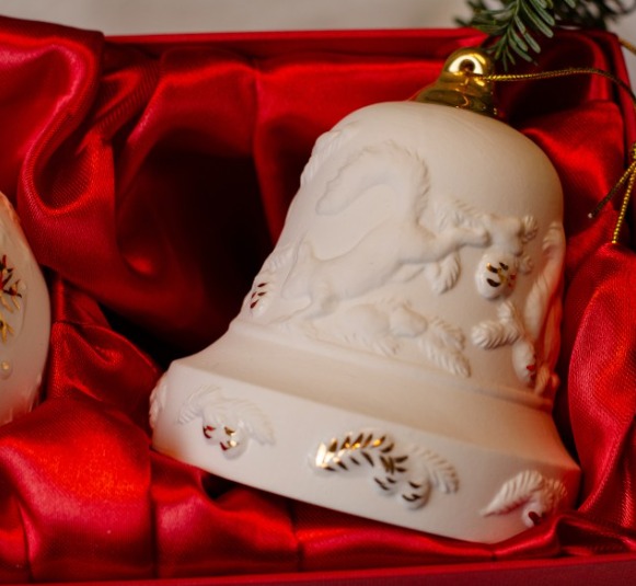 В наборе собраны два подвеса: “Шар фигуристка” и “Колокол белочка”. Каждое изделие выполнено вручную из фарфора бисквита и украшено художественной росписью золотом. Структура фарфора и золотой декор создают гармоничный дуэт, придающий украшениям утончённость и благородный шарм.