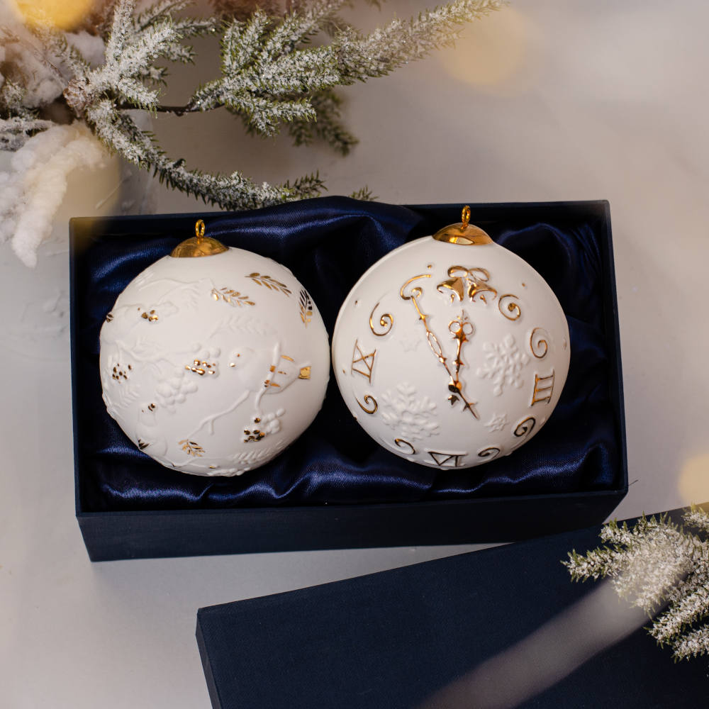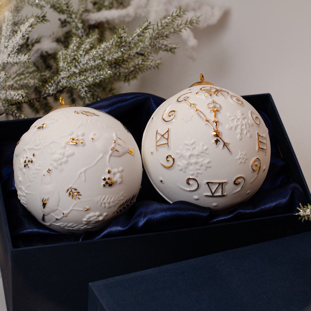 В наборе собраны два уникальных подвеса: изящный «Шар с часами», «Шар со снегирями». Каждое изделие выполнено вручную из фарфора бисквита и украшено художественной росписью золотом. Структура фарфора и золотой декор создают гармоничный дуэт, придающий украшениям утончённость и благородный шарм.