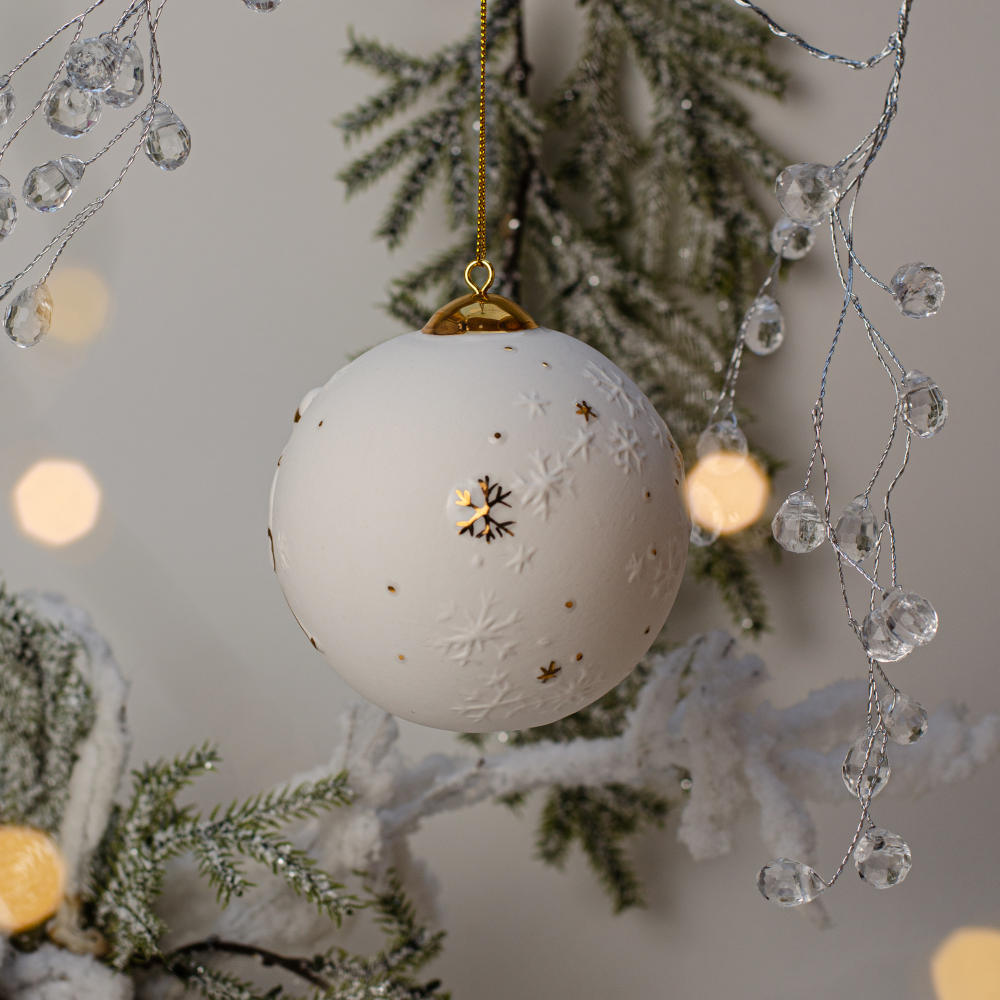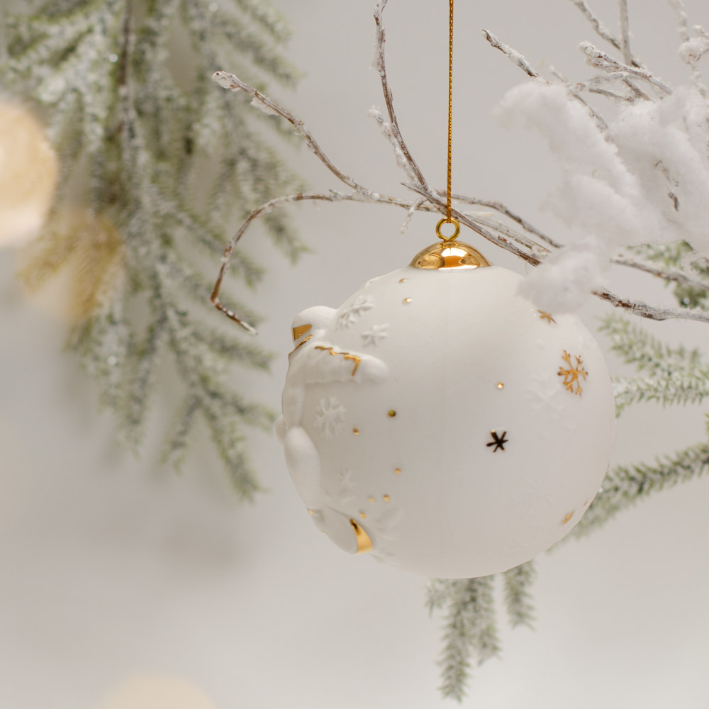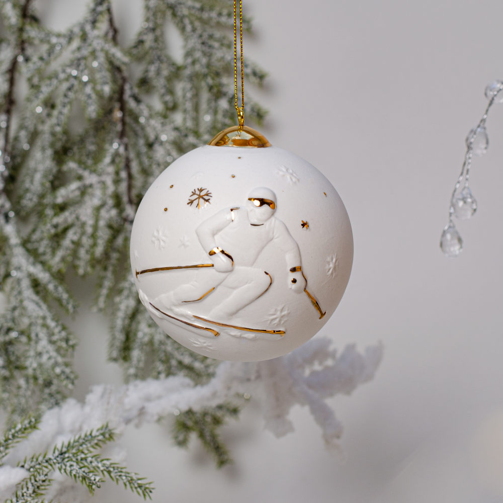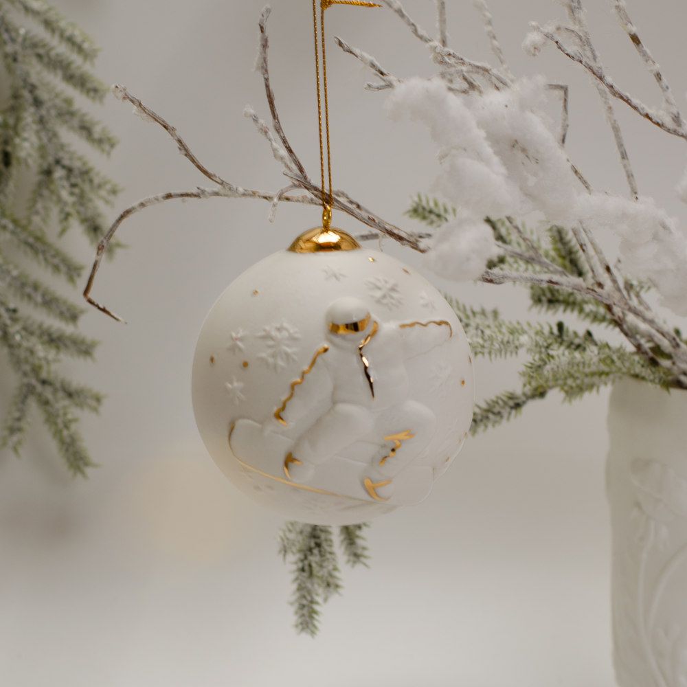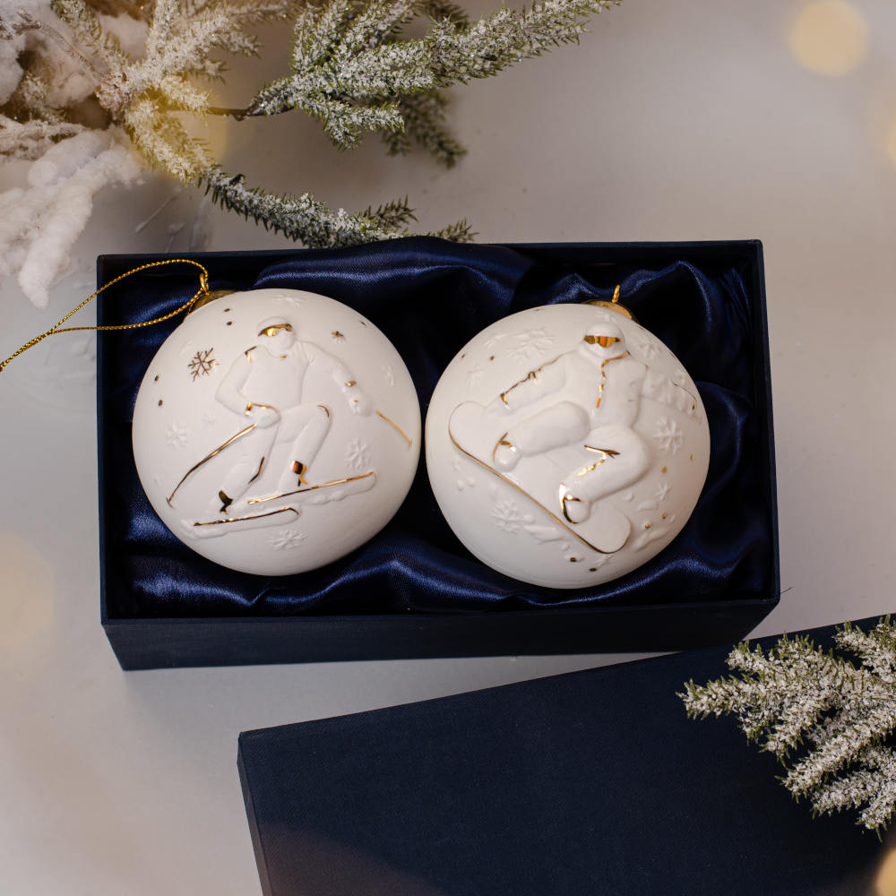 В наборе собраны два уникальных подвеса: изящный «Шар с лыжником», «Шар со сноубордистом». Каждое изделие выполнено вручную из фарфора бисквита и украшено художественной росписью золотом. Структура фарфора и золотой декор создают гармоничный дуэт, придающий украшениям утончённость и благородный шарм.