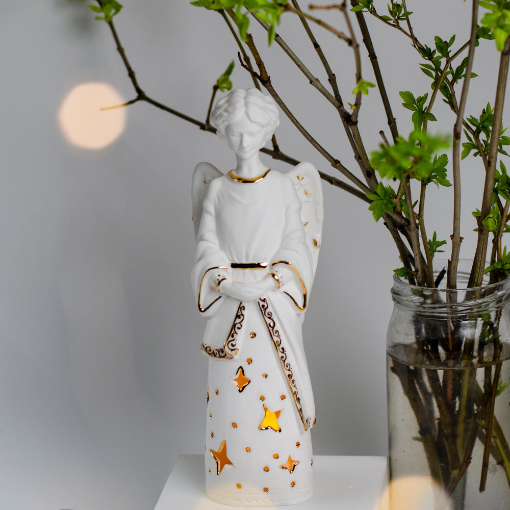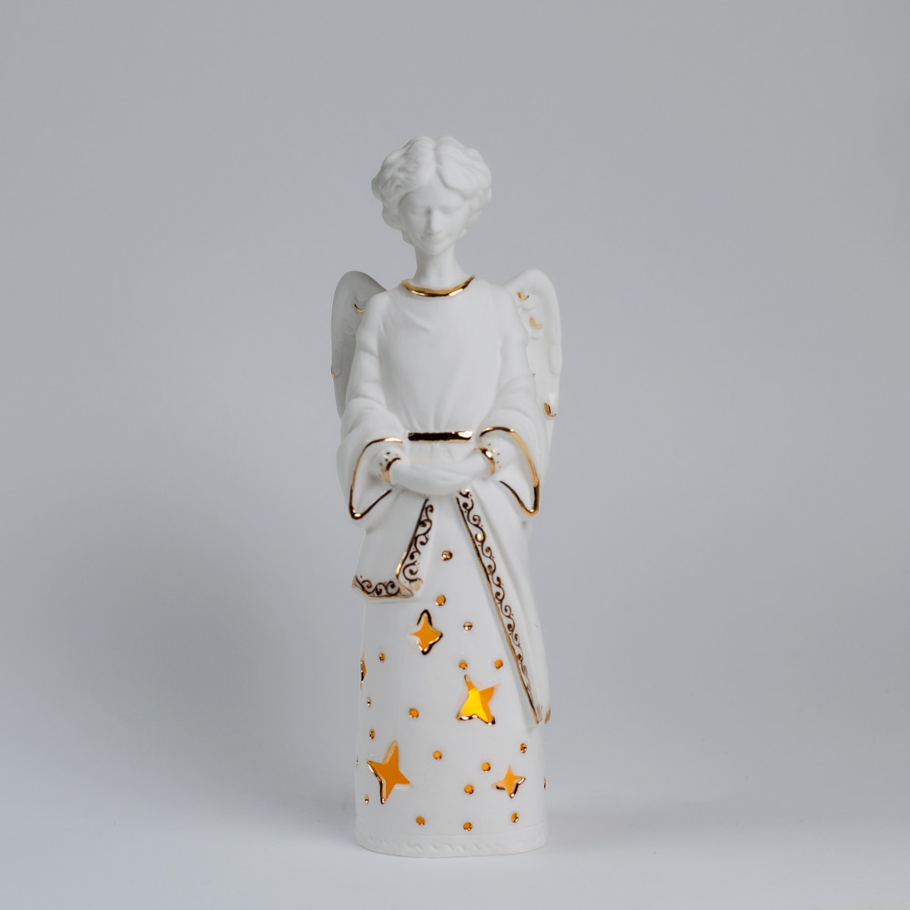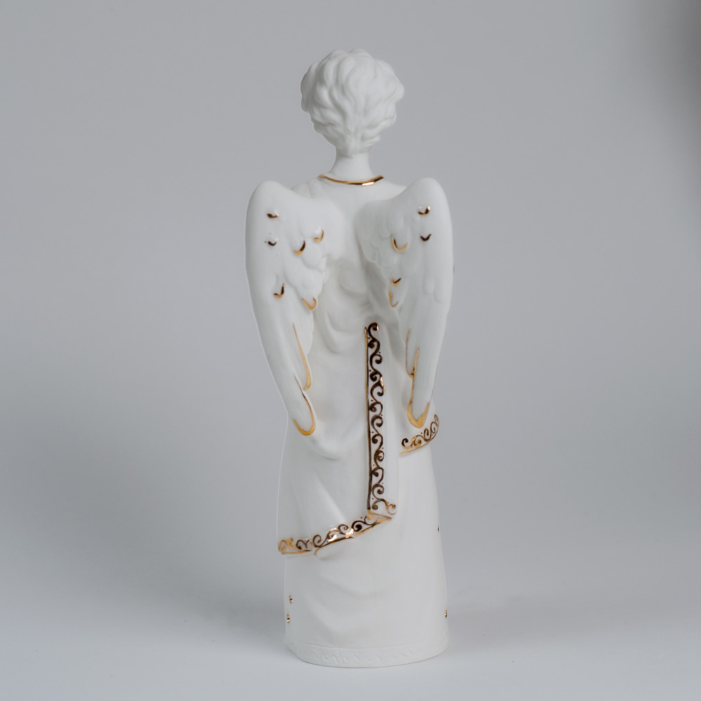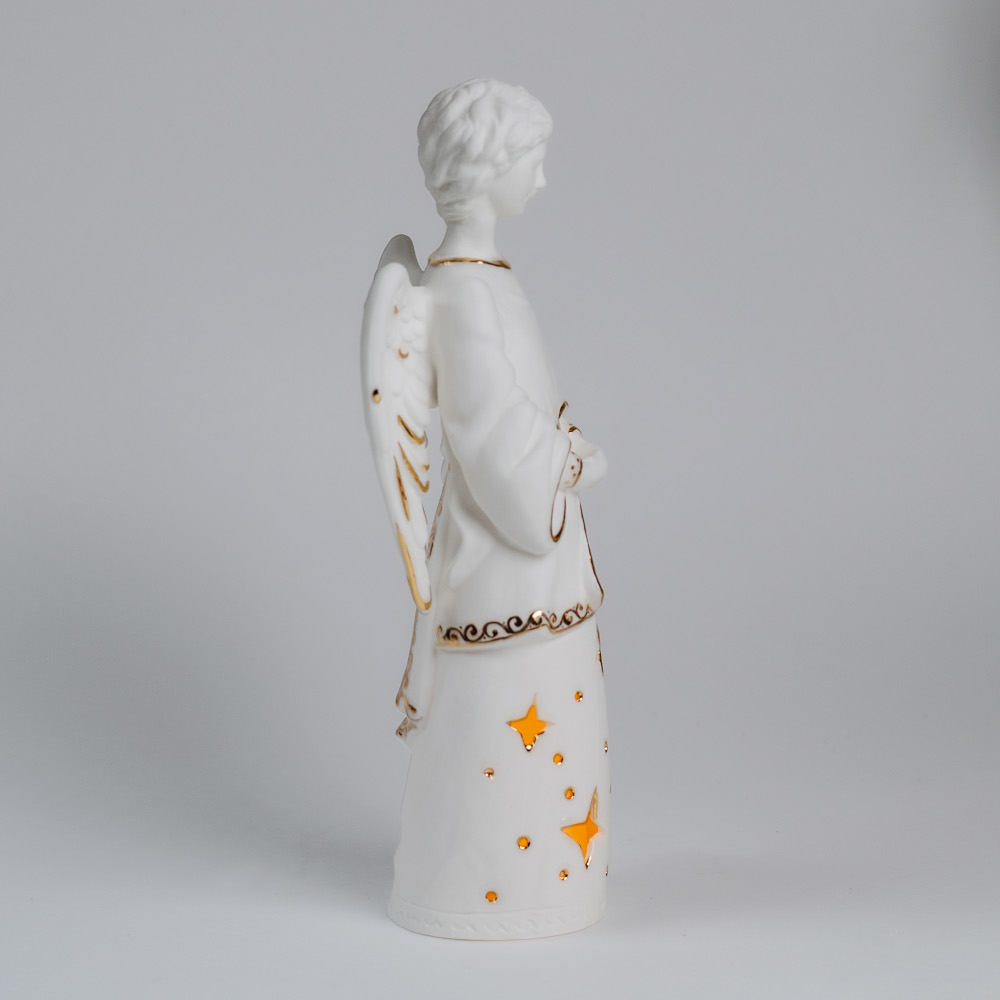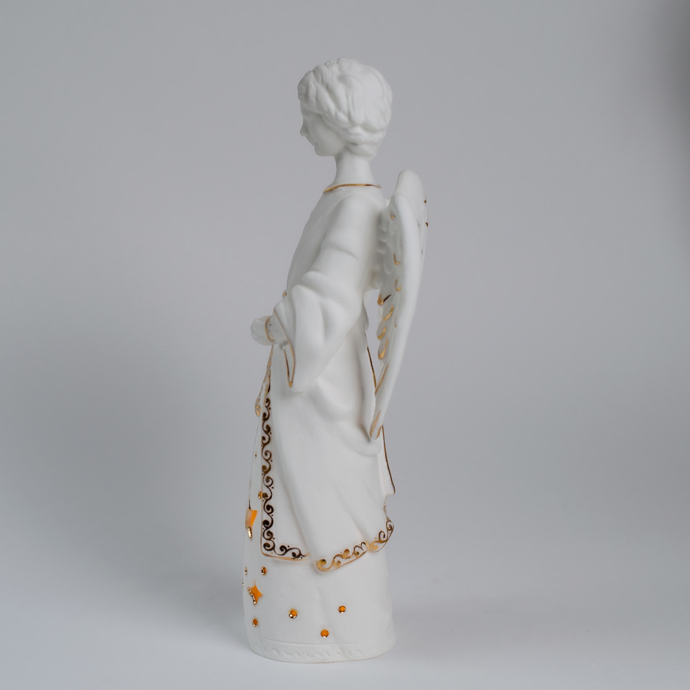 Фигурка “Ангел-подсвечник” – изделие ручной работы, сочетает в себе изысканность и теплоту домашнего уюта. Выполненная из фарфора бисквита, эта фигурка обладает особой прочностью благодаря особенностям материала. Золотая роспись, нанесённая мастером вручную, придают ей роскошный вид и подчёркивают каждую деталь.